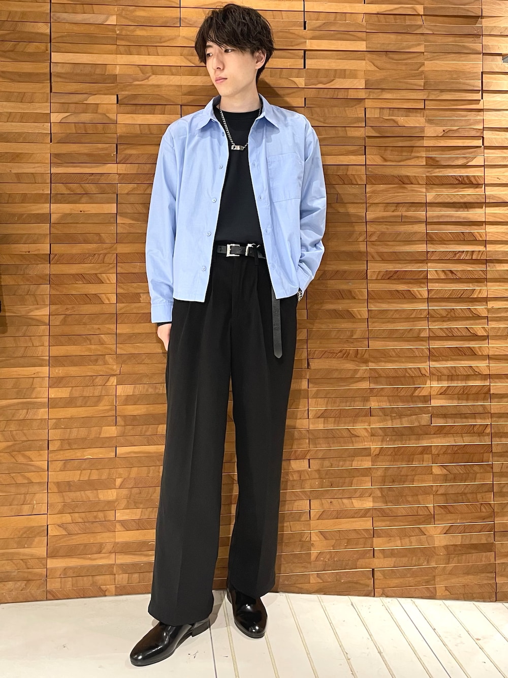 短丈のボクシーシャツを使ったコーディネートです。