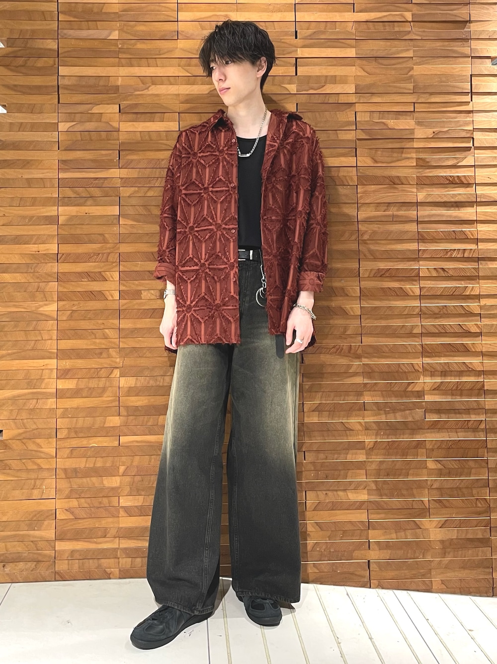 1枚でも存在感あるフリンジジャガードシャツとヴィンテージデニムを合わせました。