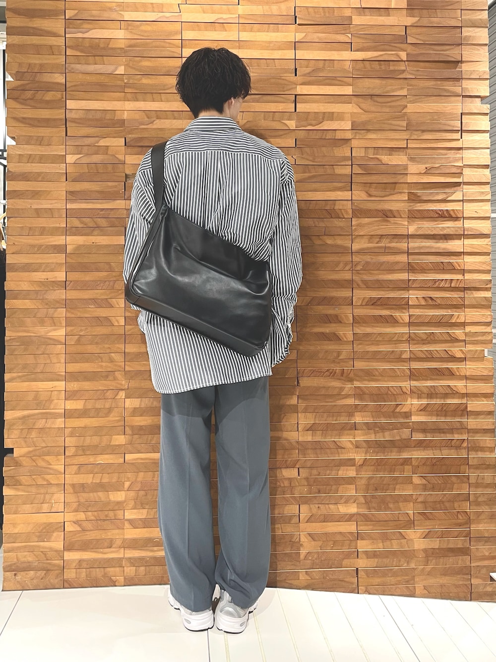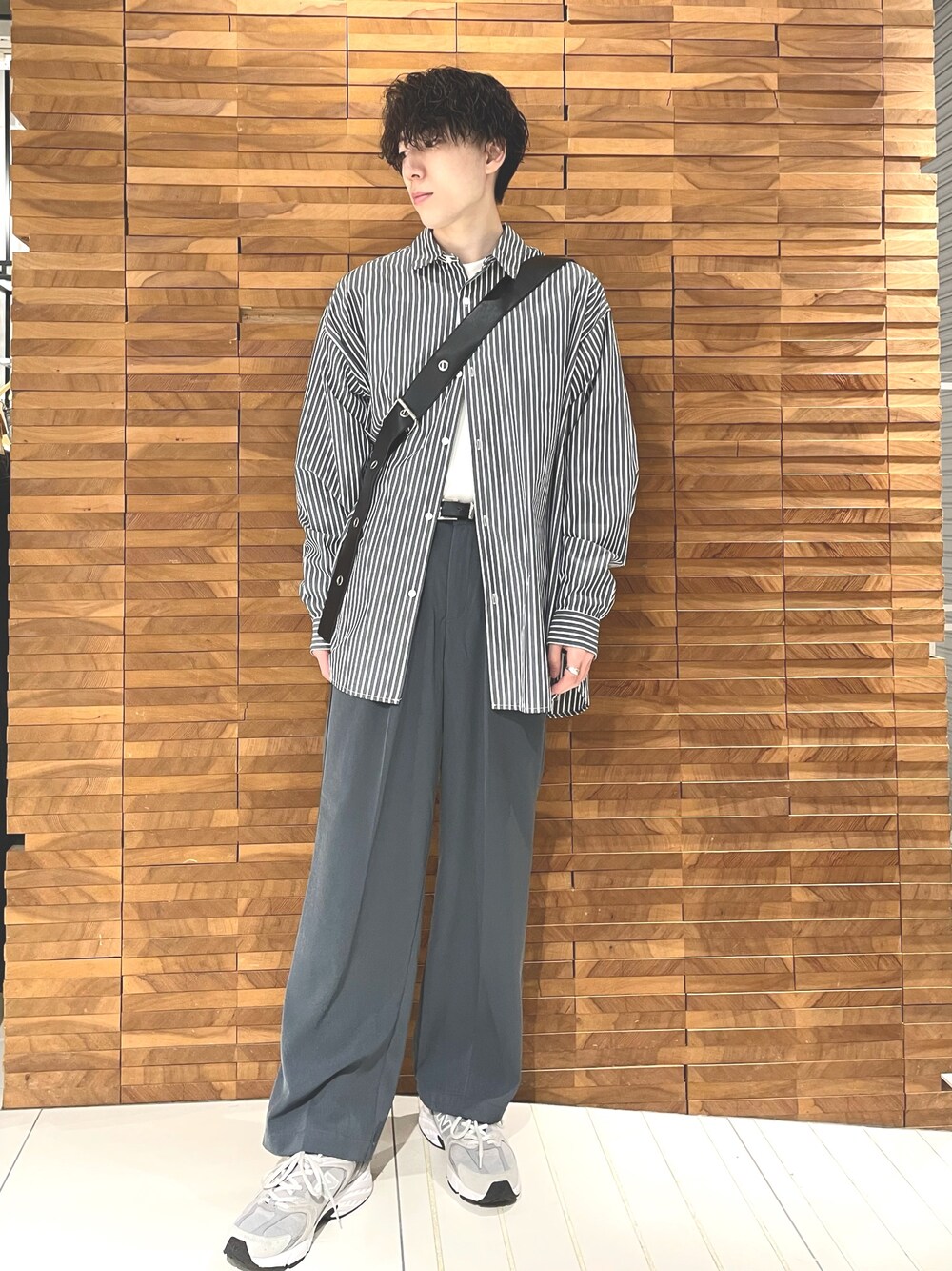 ストライプのルーズシャツとスラックスを合わせタックインする事で縦ラインを強調してスタイルアップして見えます!
