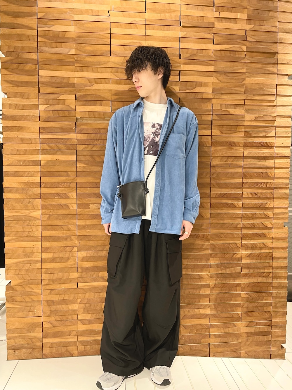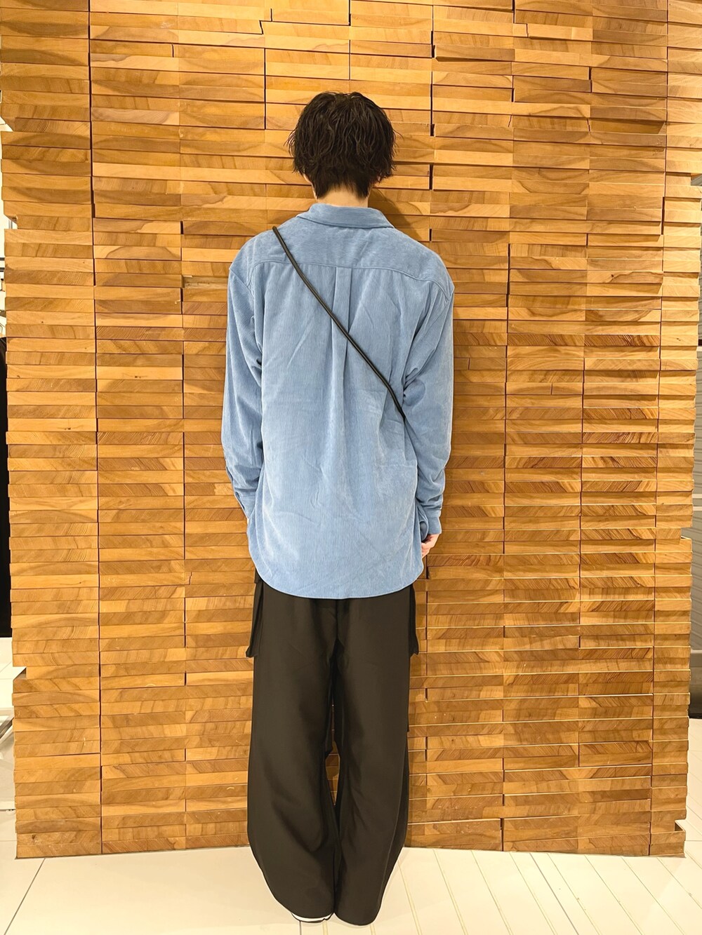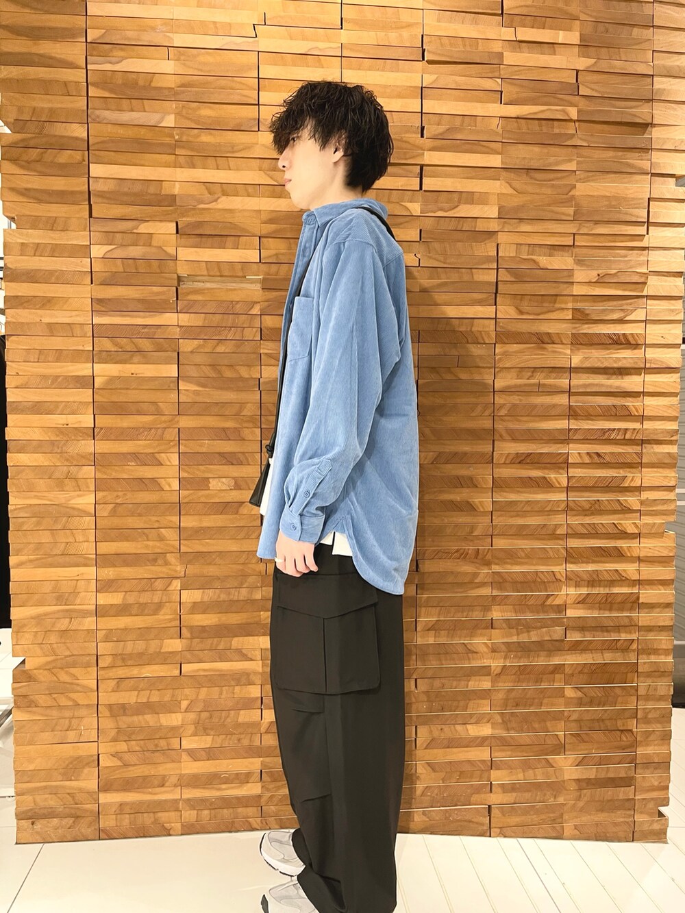 ブルーのコーデュロイシャツで差し色コーディネートです。