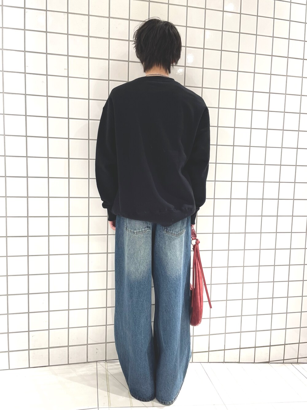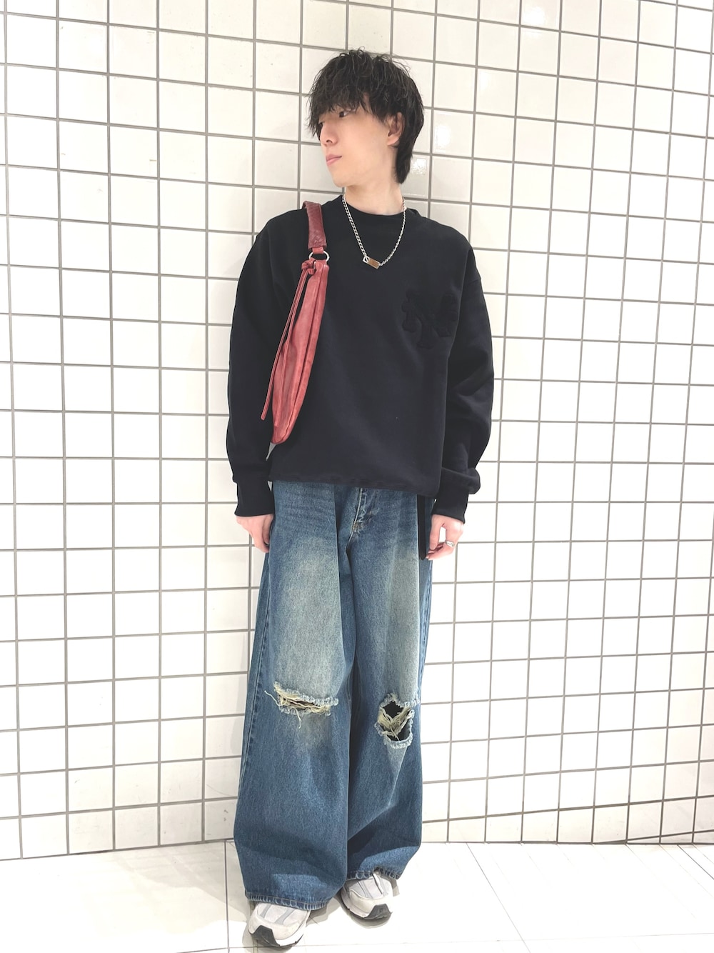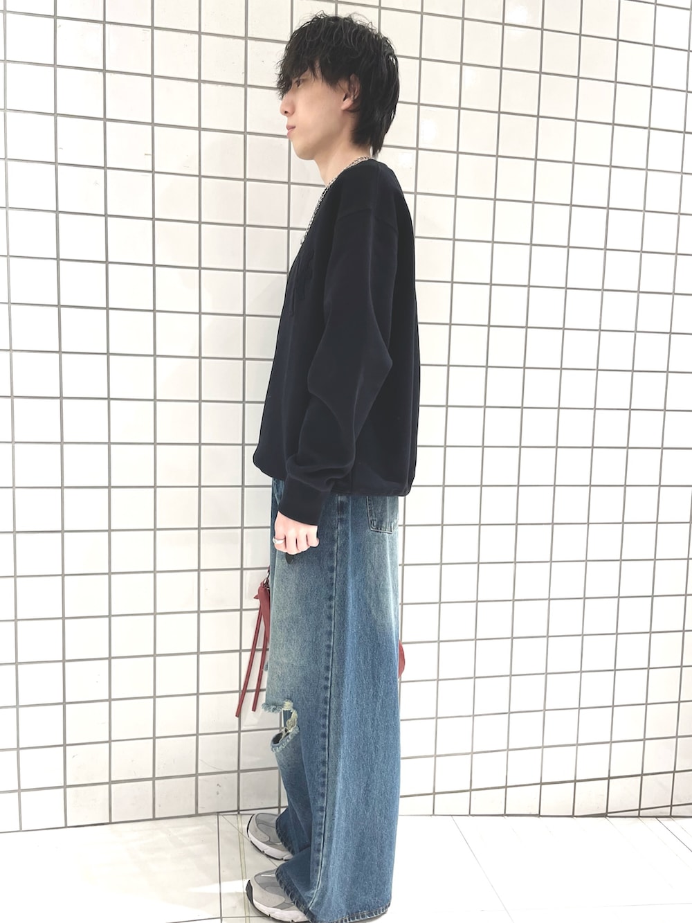 スウェット×ダメージデニムのカジュアルコーディネートです。