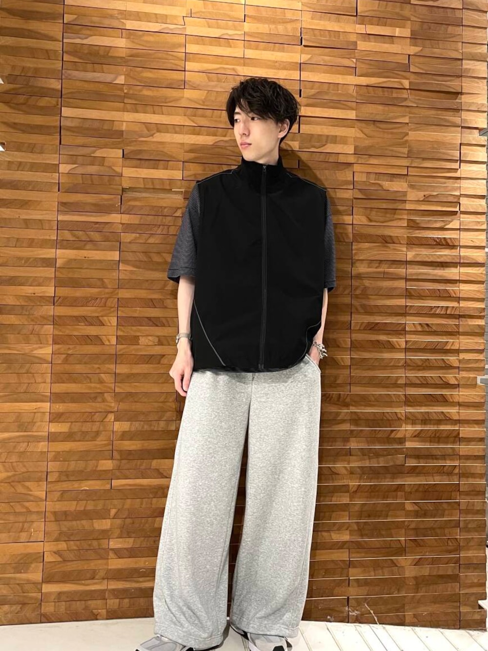トップスはボーダーTにベスト合わせでカジュアルに合わせてます。