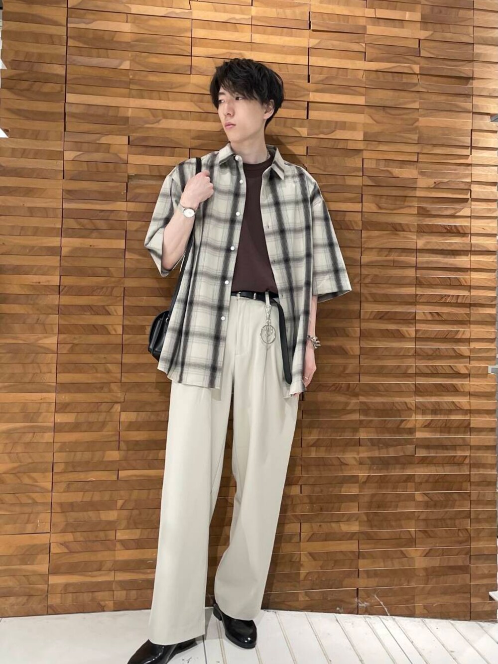 シャツがルーズシルエットになっているのでタックインすると合わせやすくスタイルもよく見えます。