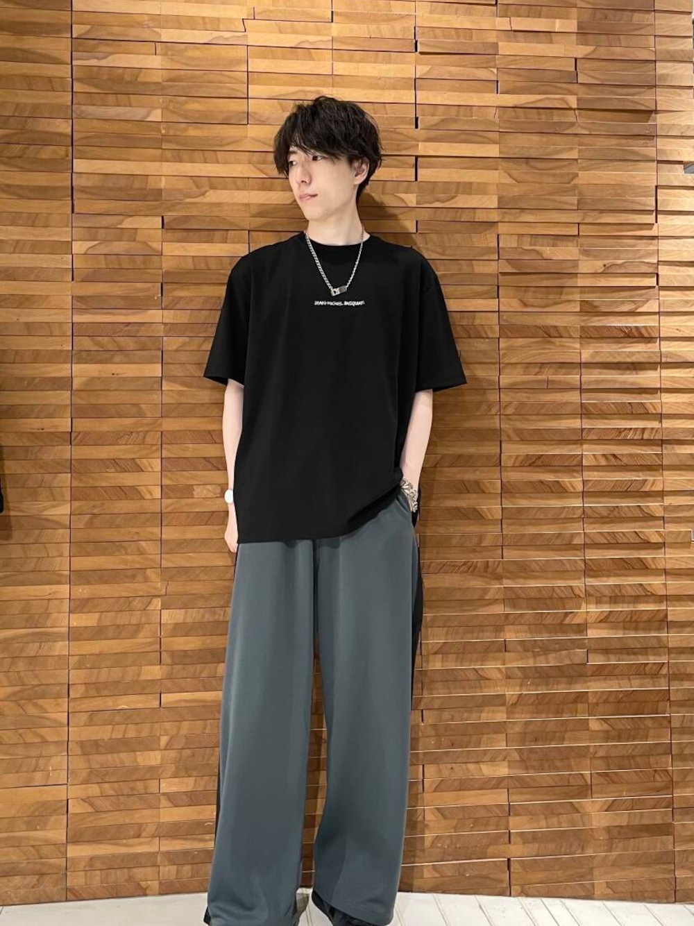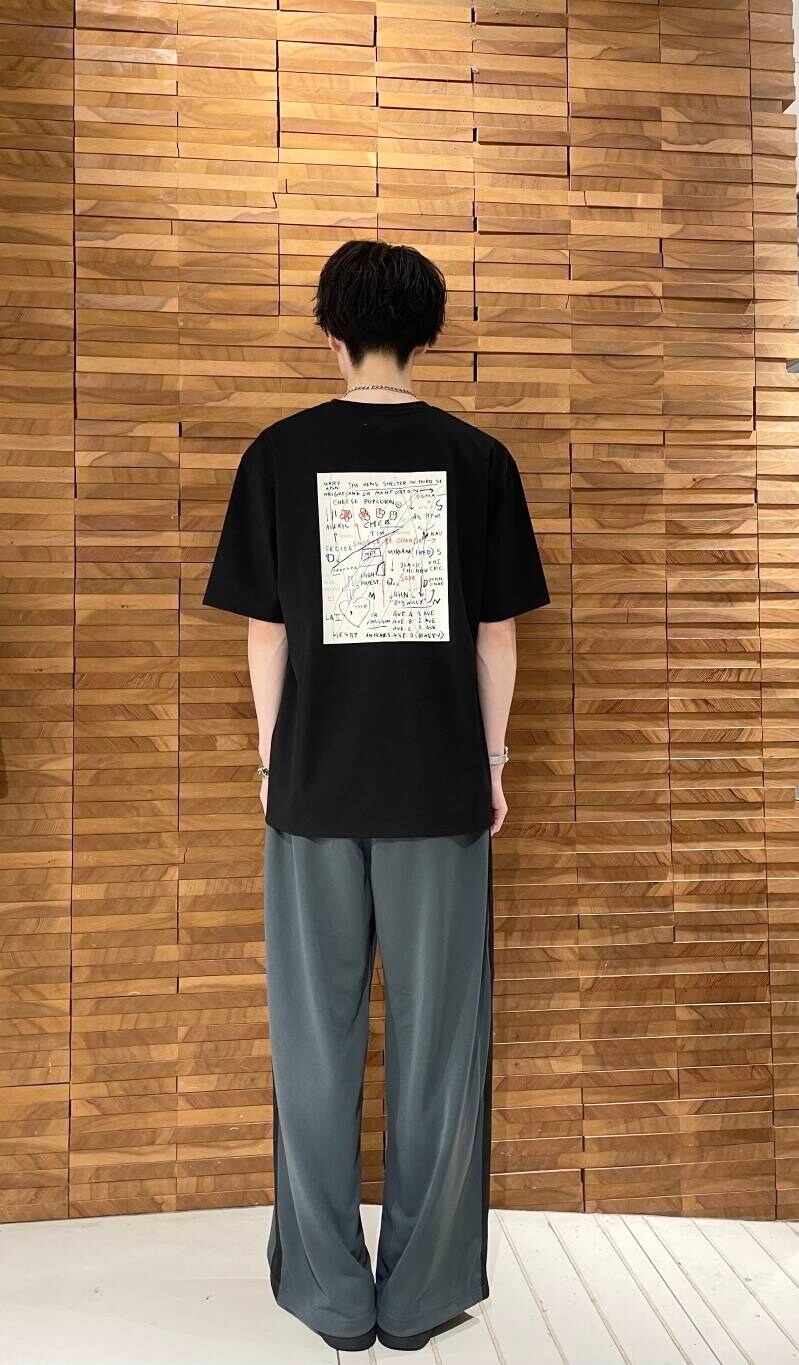 バスキアのTシャツにジャージパンツを合わせたラフなコーディネートです。