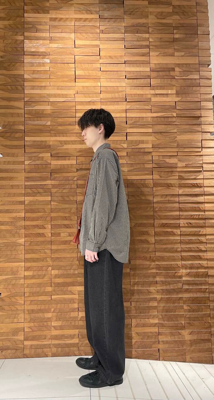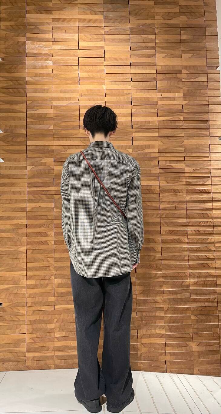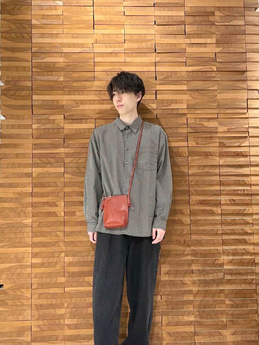 チェックシャツにオレンジのバッグを使った差し色コーディネートです。