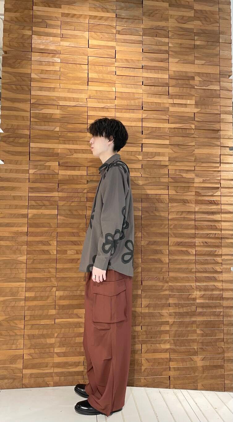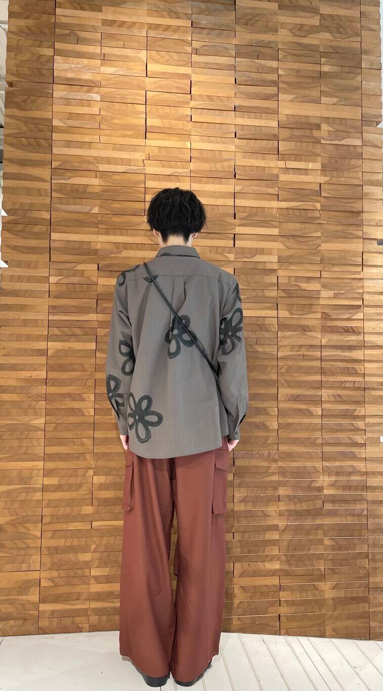 フラワープリントの入ったシャツを使った暖色コーディネートです。