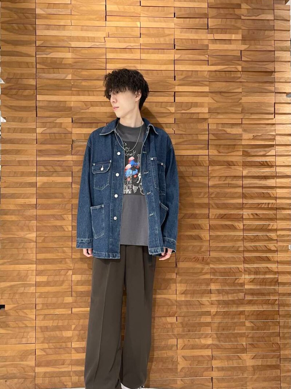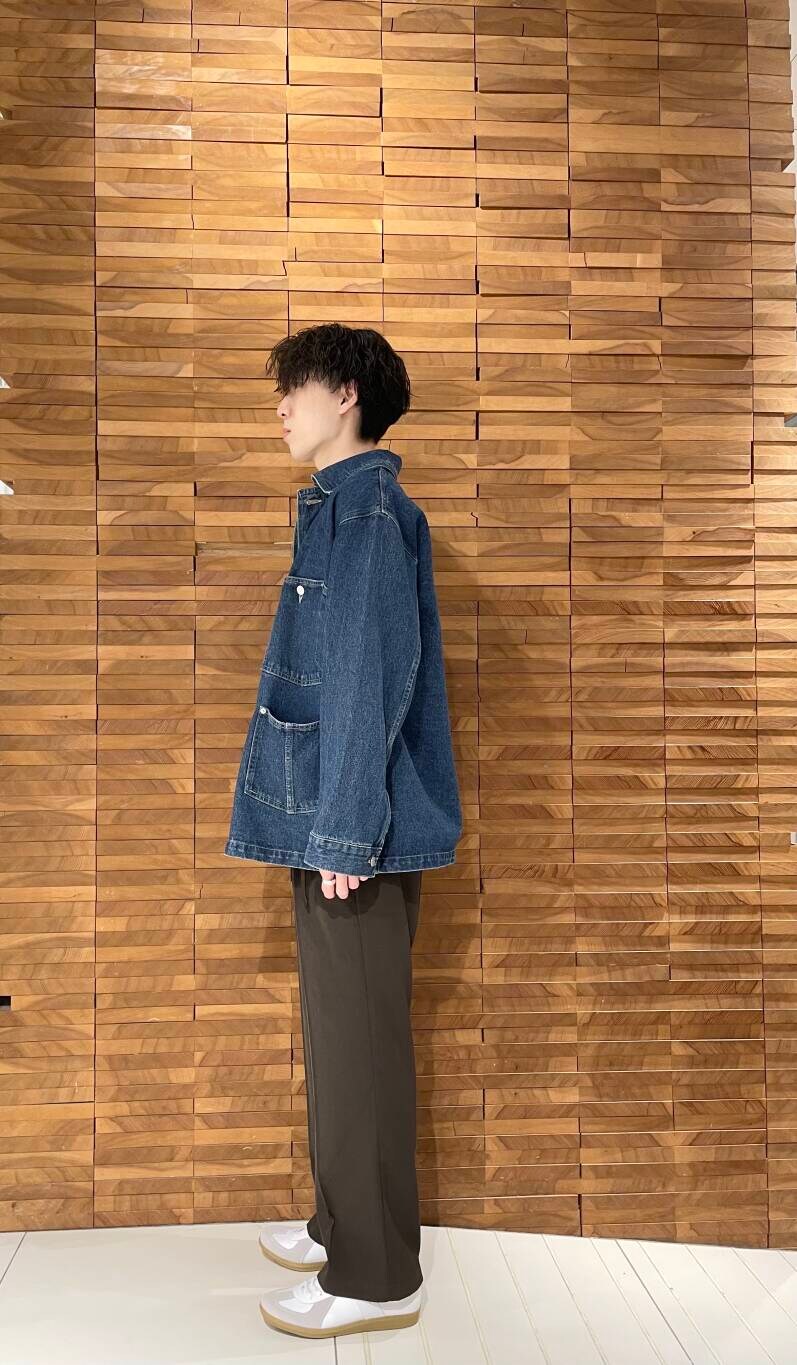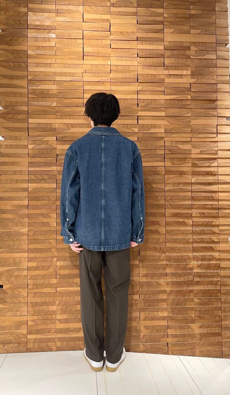 デニムカバーオールをスラックスと合わせてキレイめカジュアルコーディネートです。