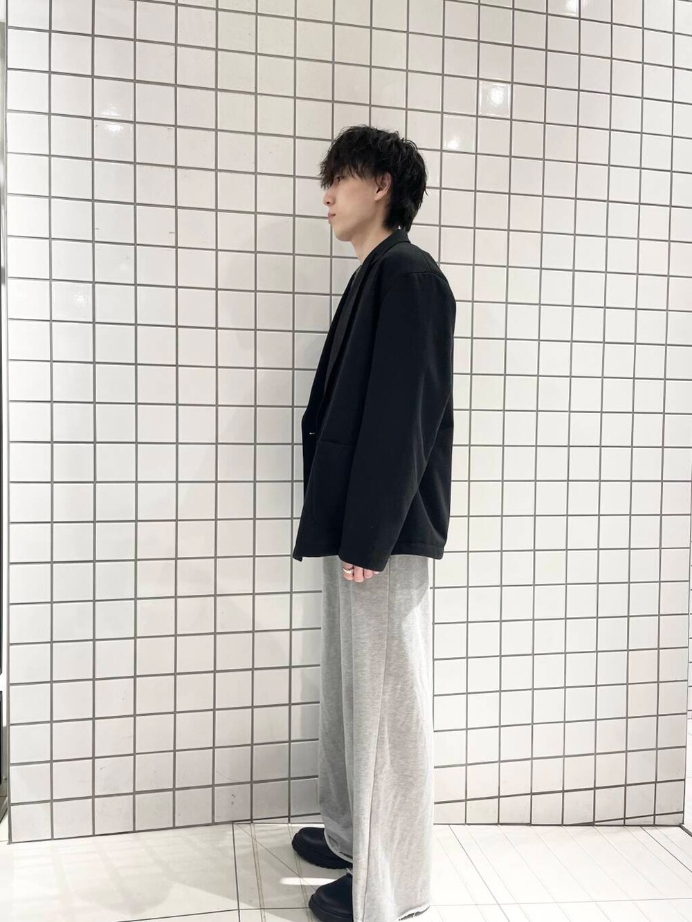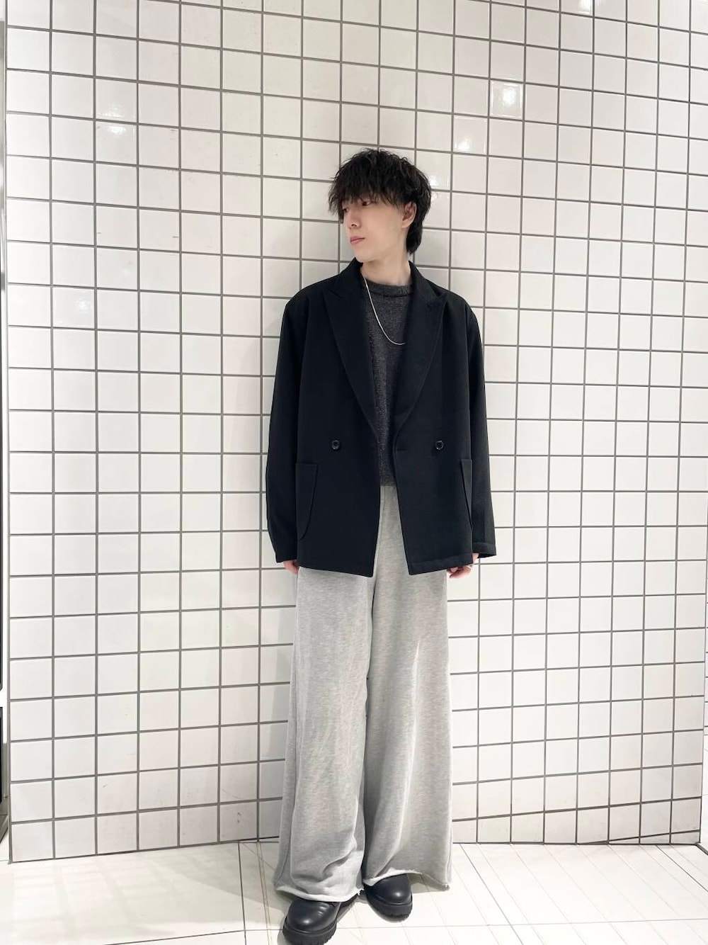ジャケット×スウェットパンツでキレイめカジュアルにコーディネートしました。