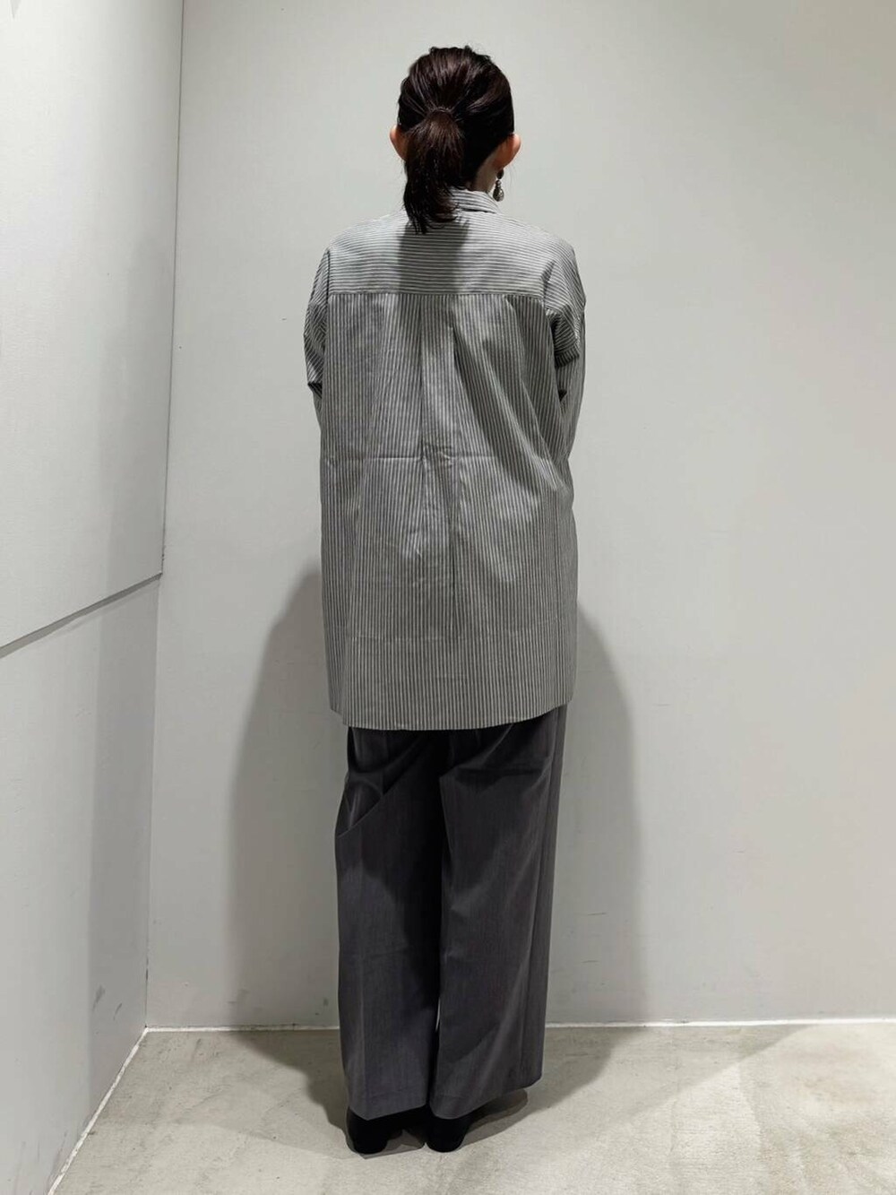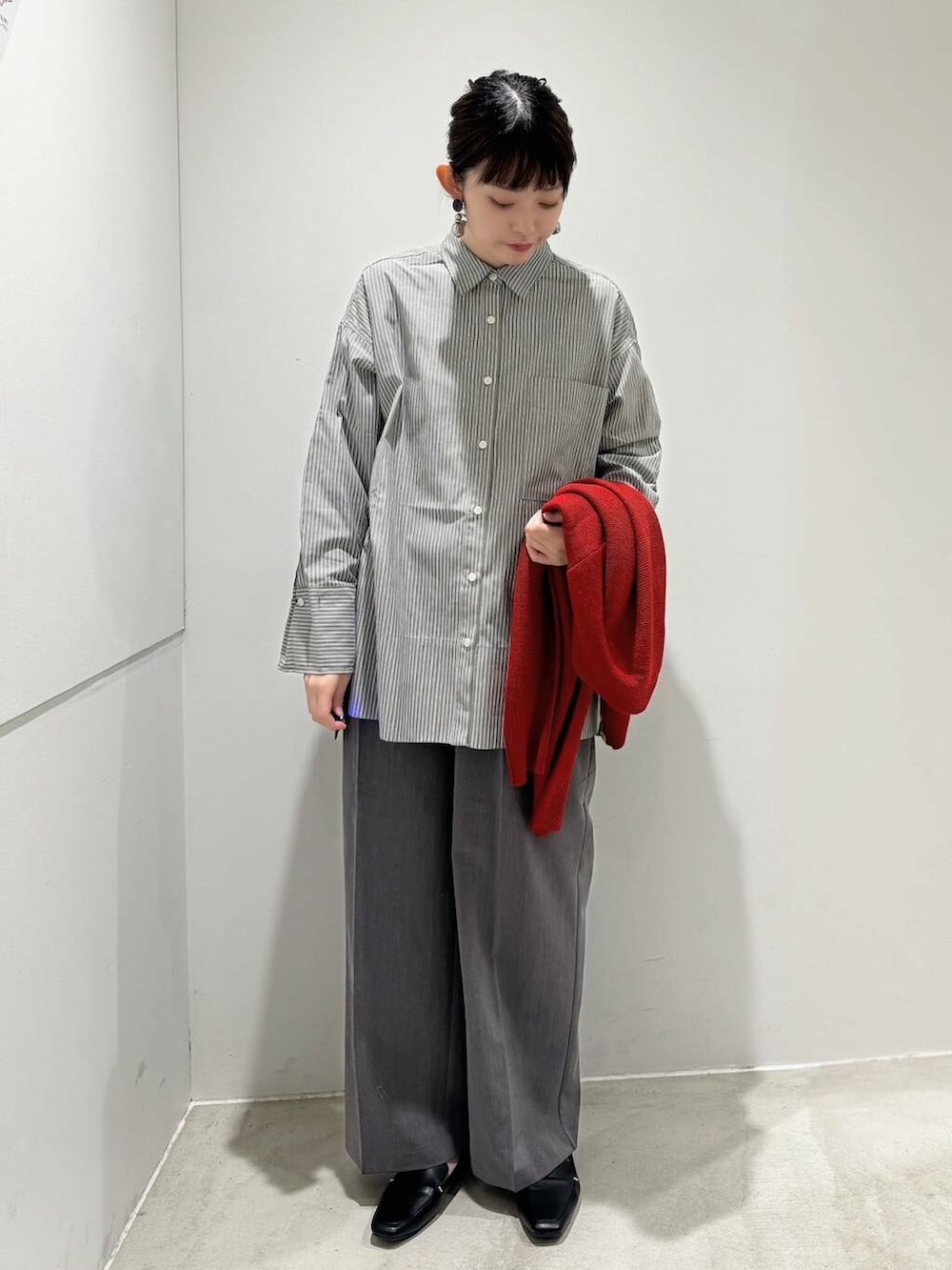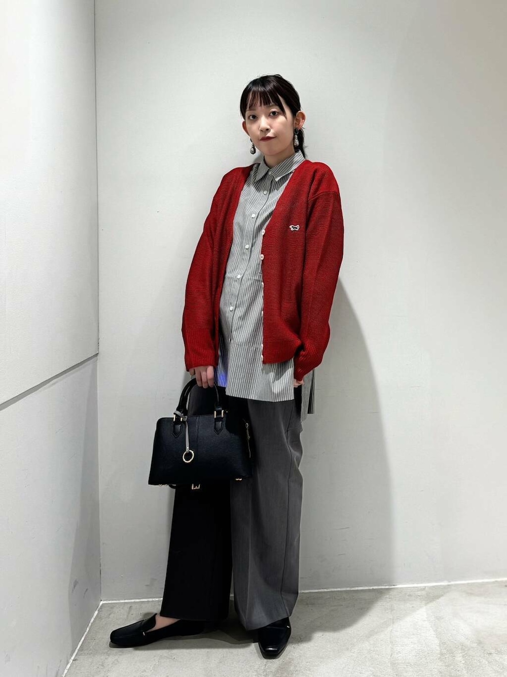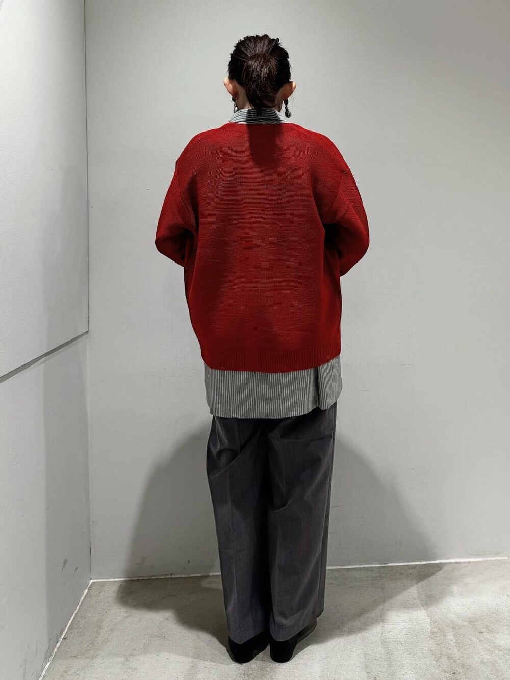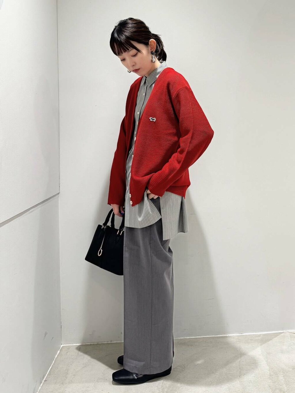 真っ赤のカーディガンには、グレーを持ってくることで強すぎない印象になります🫶
