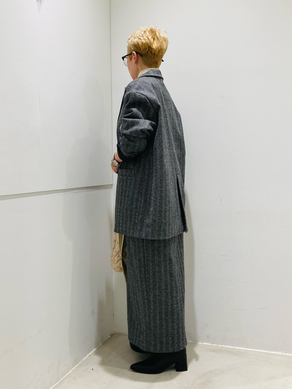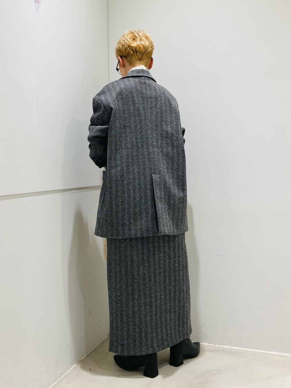 ジャケットのストレートシルエット、スカートは少しハイウエストで、どちらもスタイルアップしてくれます✨