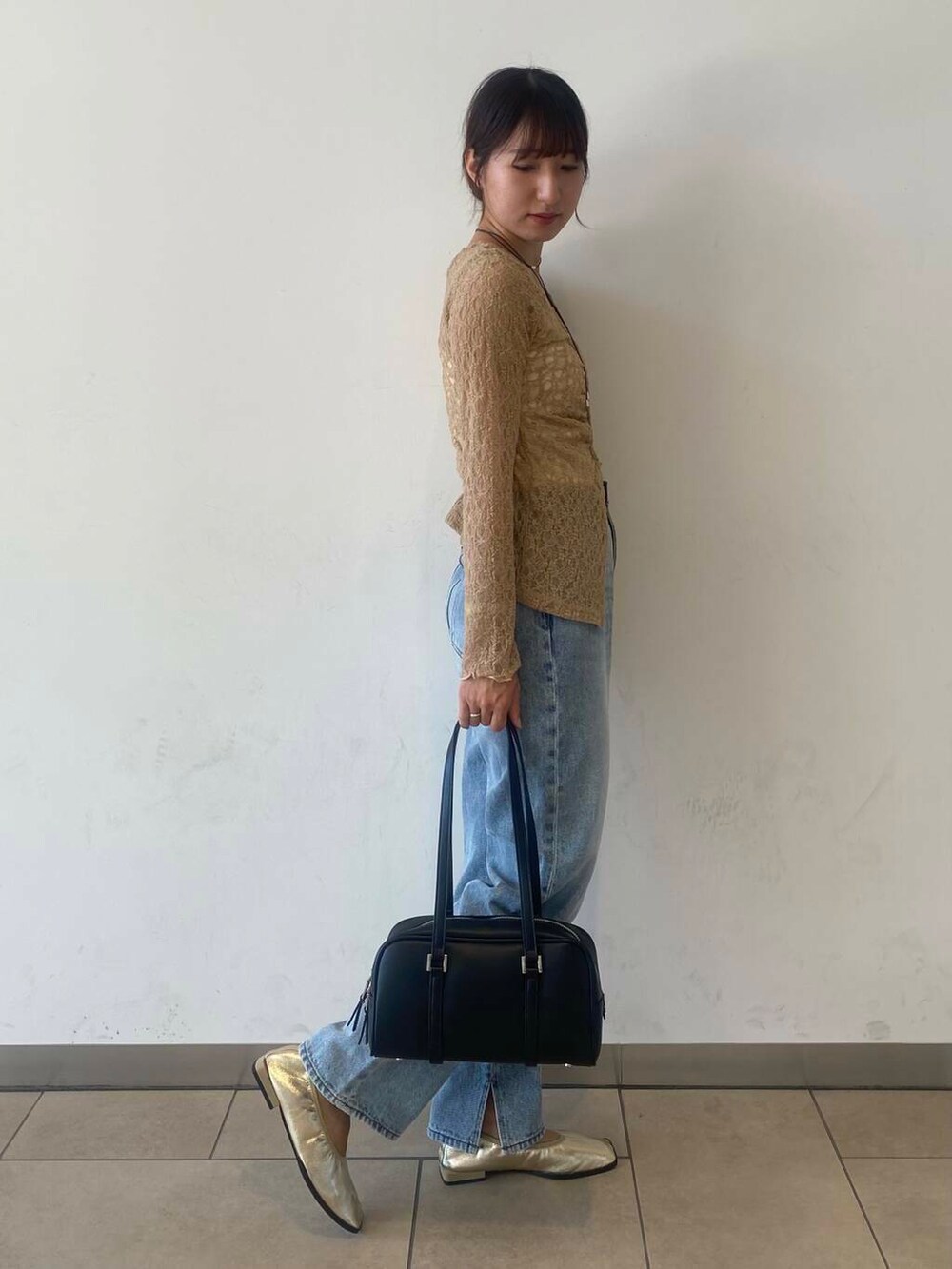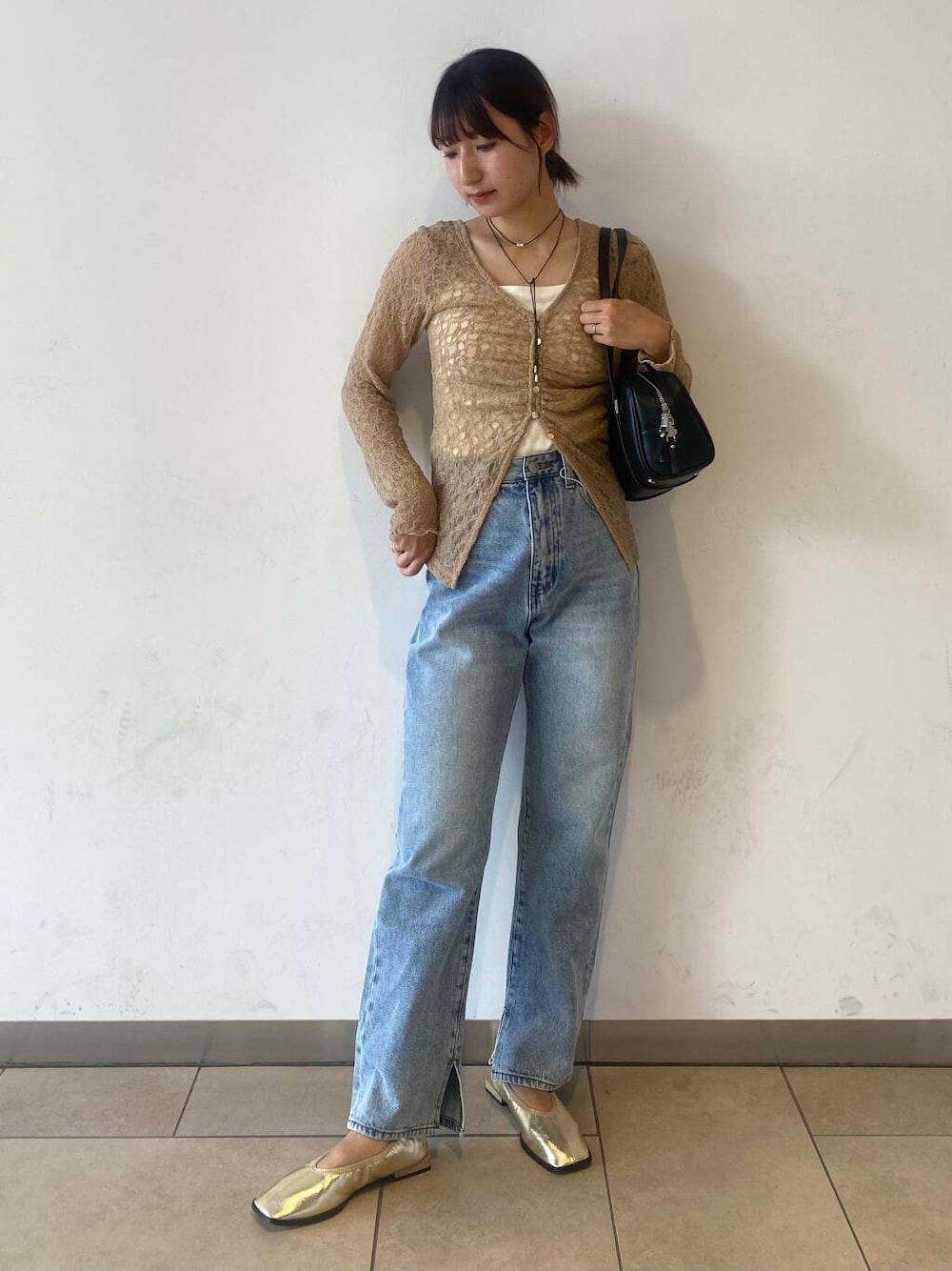 シャーリングのトップスは女性らしいレースデザインなのでデニム合わせでカジュアルにしました◎