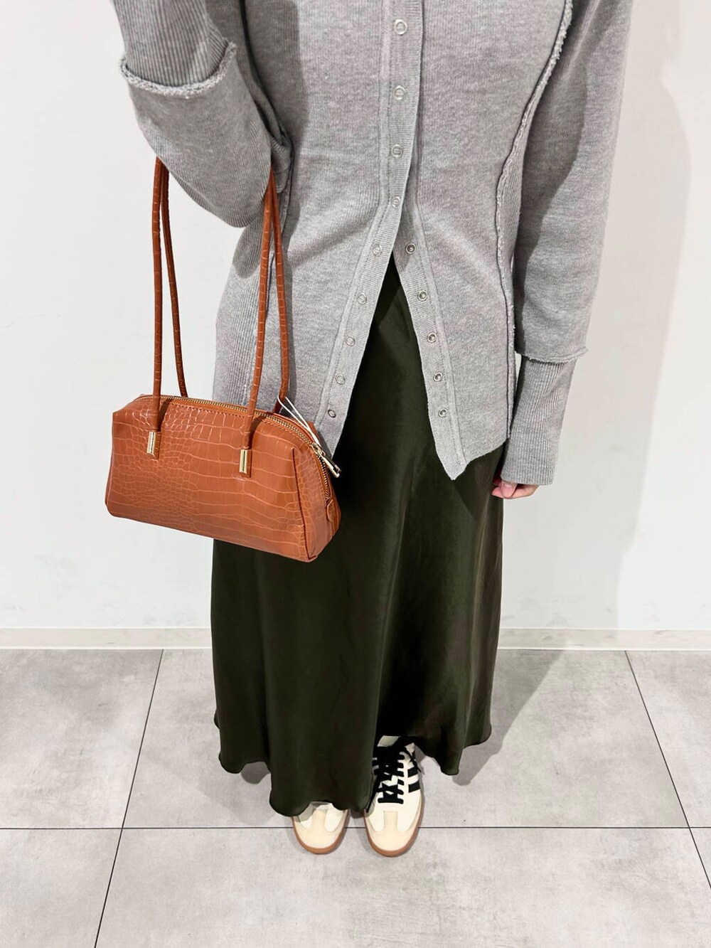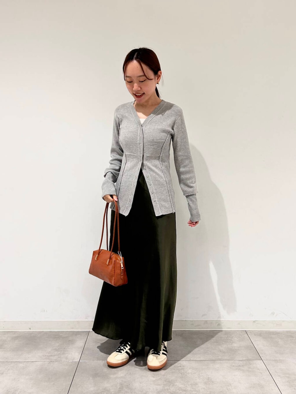 ボタンは半分くらいまで止めてウエスト位置を高く見せるのがポイントです!