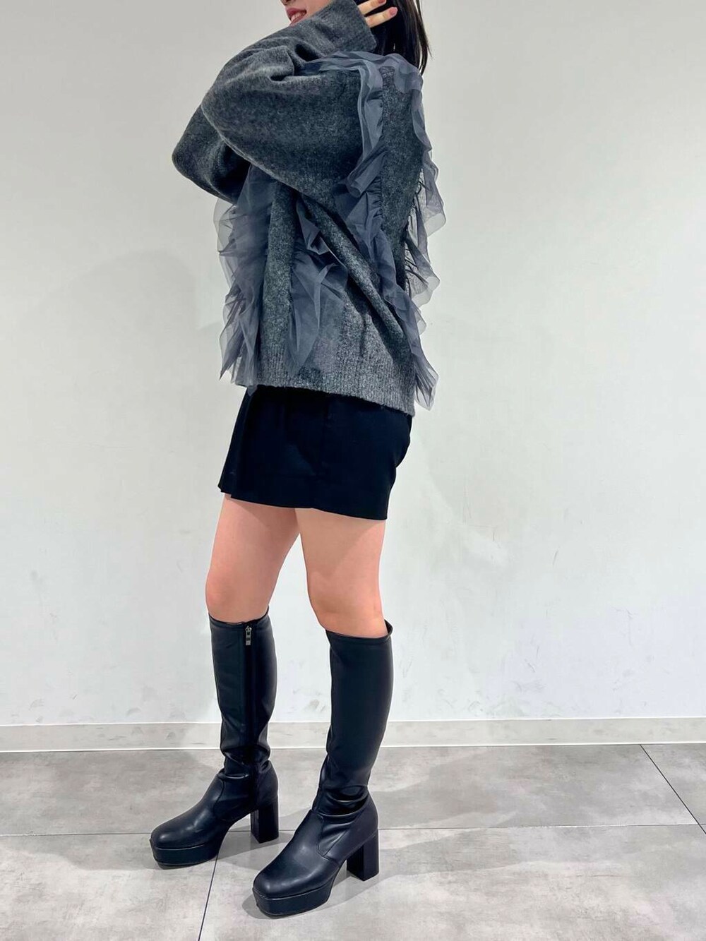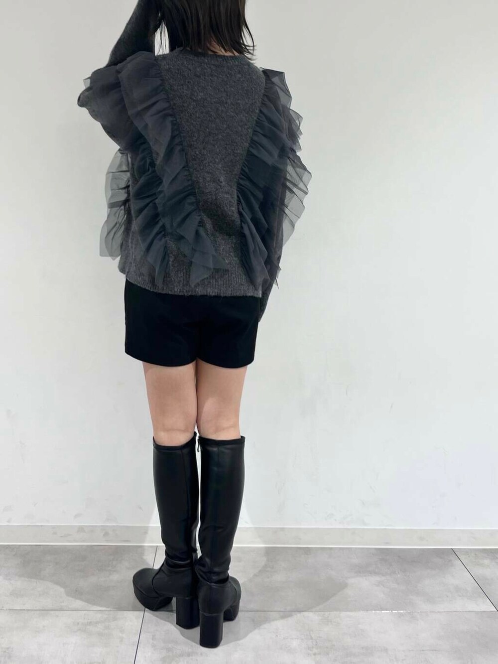 チャコールを使用することでフリルでも甘くなりすぎないコーデを作ることができます🌟