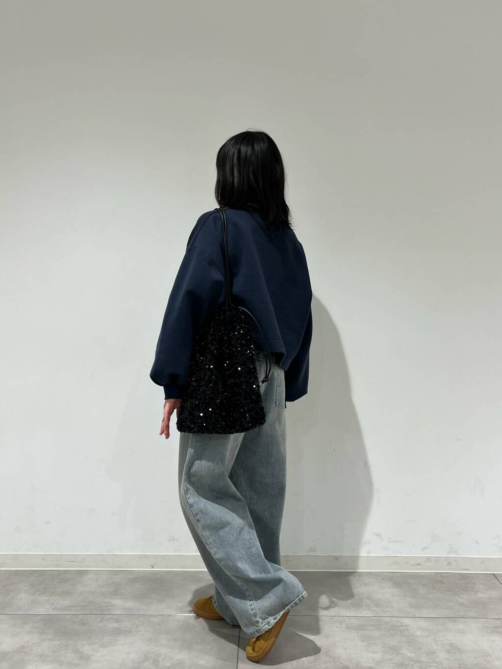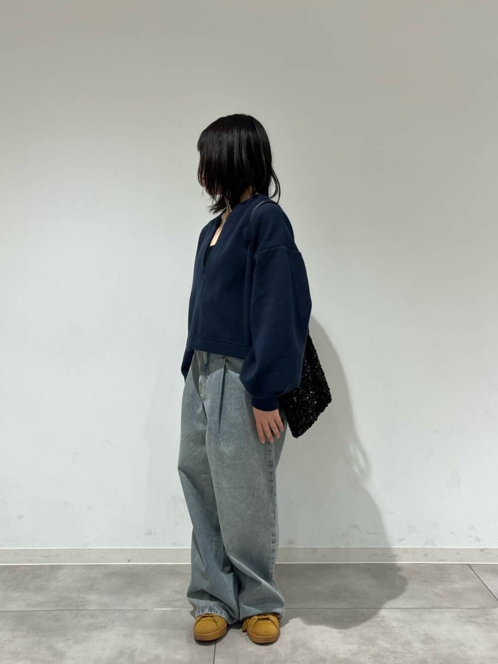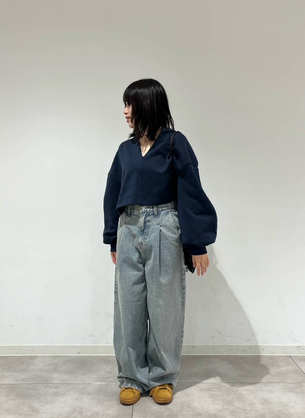 ワイドなデニムは腰で履くと可愛いです
