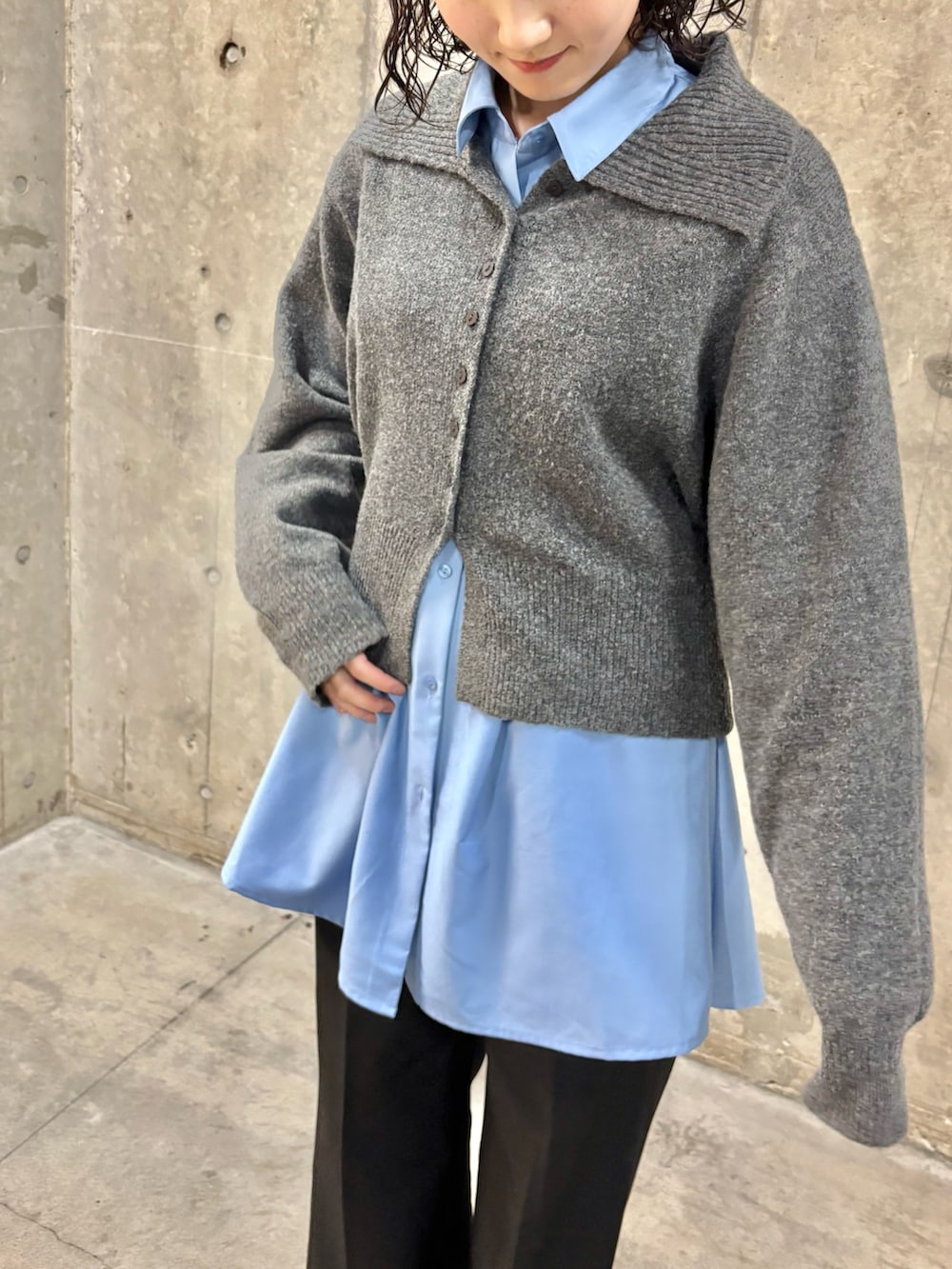 襟付きトップスを組み合わせ、シャツは後ろが絞られていてスカートのような印象に!
