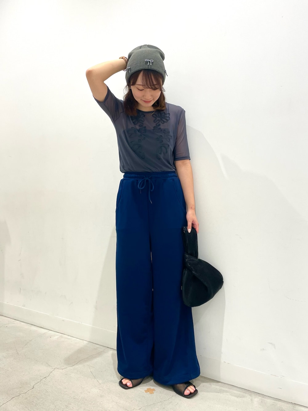 スウェットパンツはゆったりしたシルエットで履き心地も最高!部屋着感がでないように、一癖あるシアーのトップスを合わせました◎