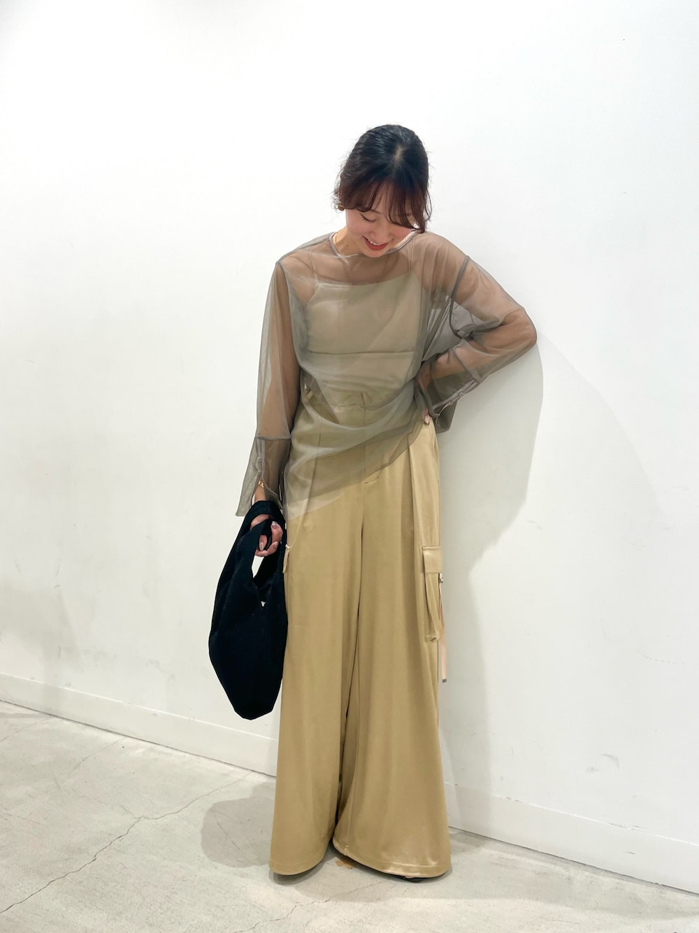 トレンドのシアートップスに秋らしいサテンのパンツの組み合わせで肌見せしても甘すぎないコーディネートにしました!
