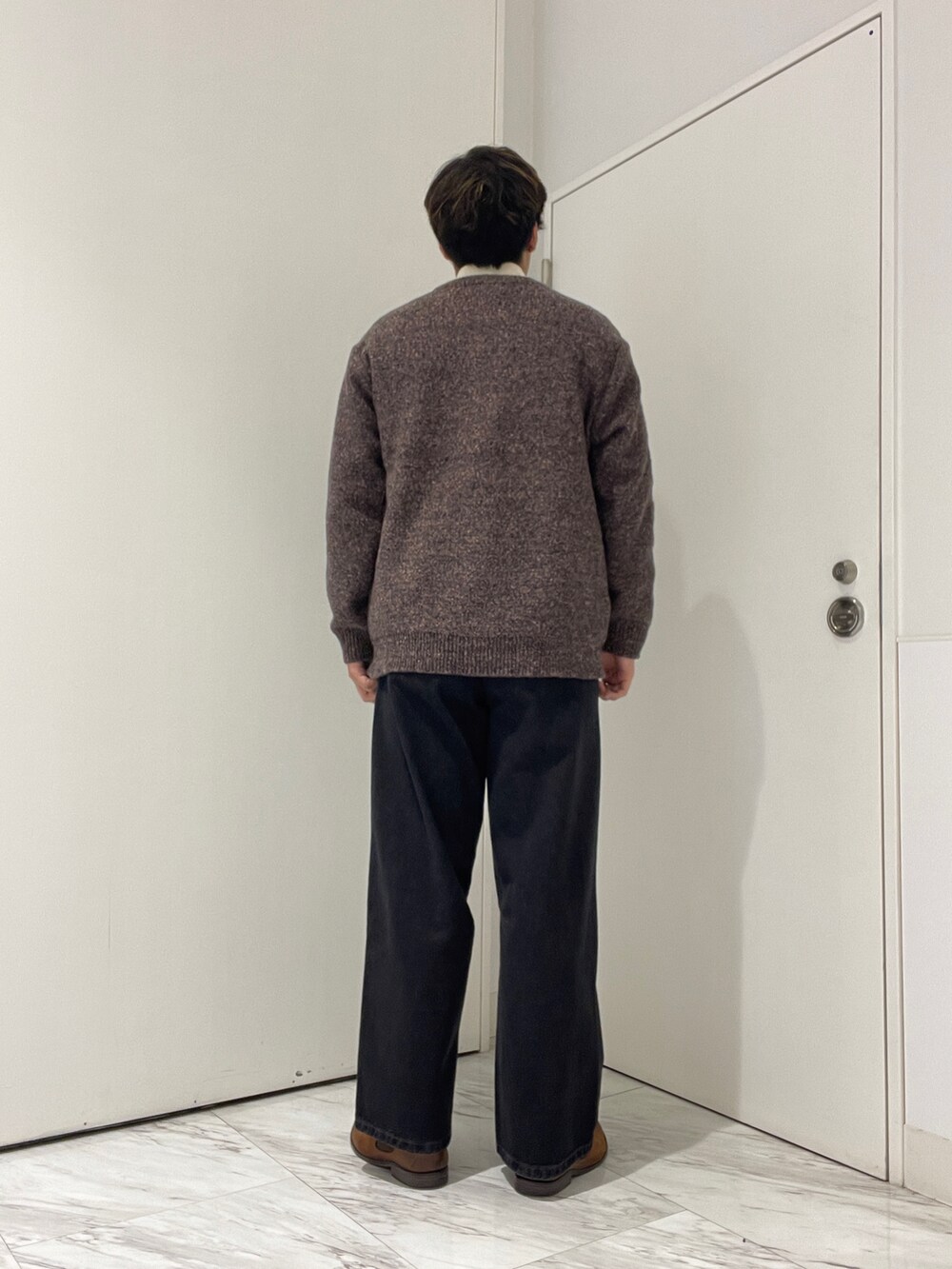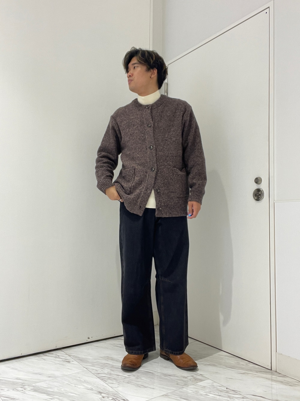 タートルネックにカーディガンを合わせたシンプルなコーディネートです!