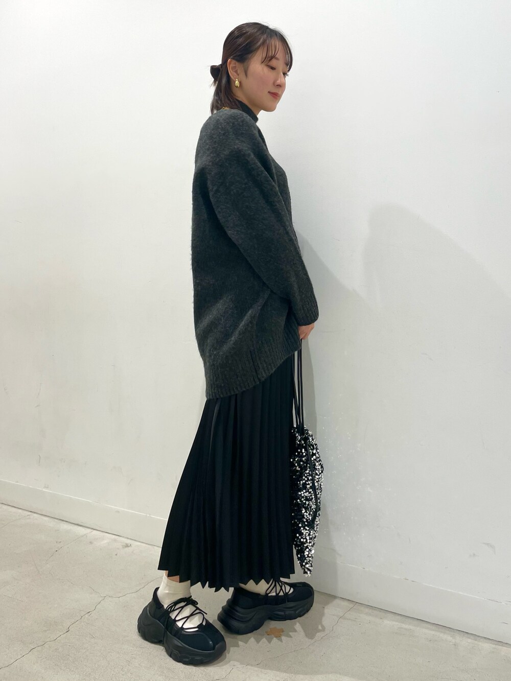 チョーカー付きのセーターはお尻まですっぽり隠れる長さでロングスカートとの相性◎