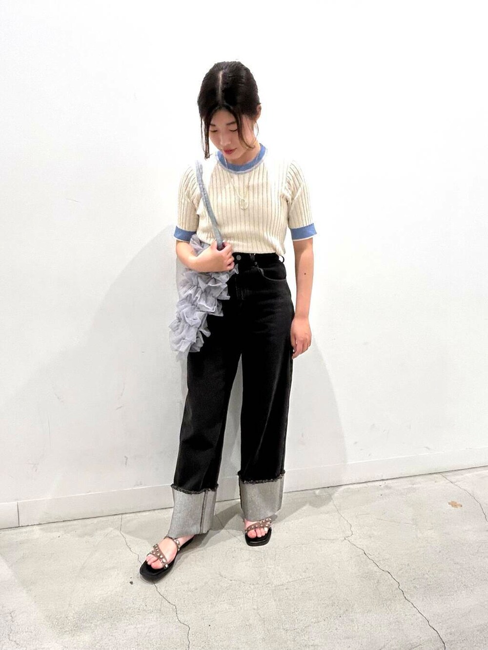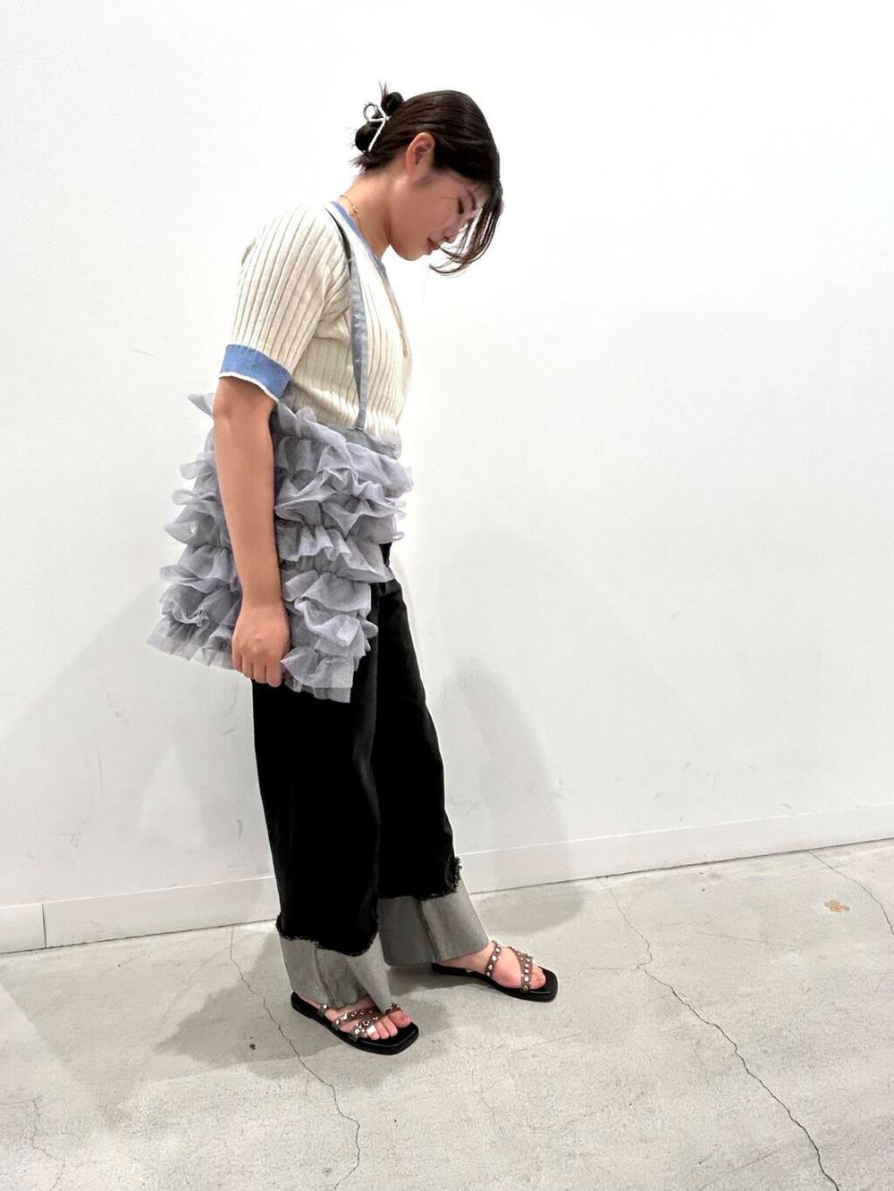 トップス・ボトムス共にシンプルなので、ネックレスとチュールのトートバッグを合わせて抜け感をだしました!