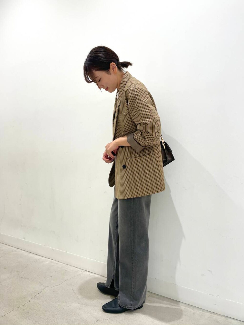ジャケットの袖はロールアップしてこなれ感を出しつつ、小物はカチッとしたバッグとローファーを合わせました◎