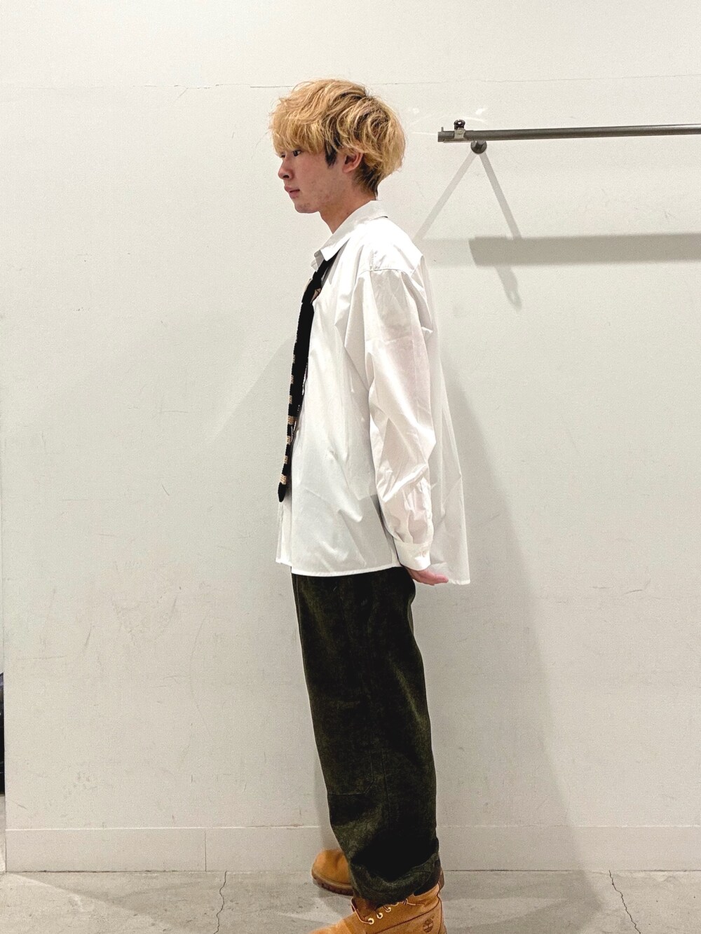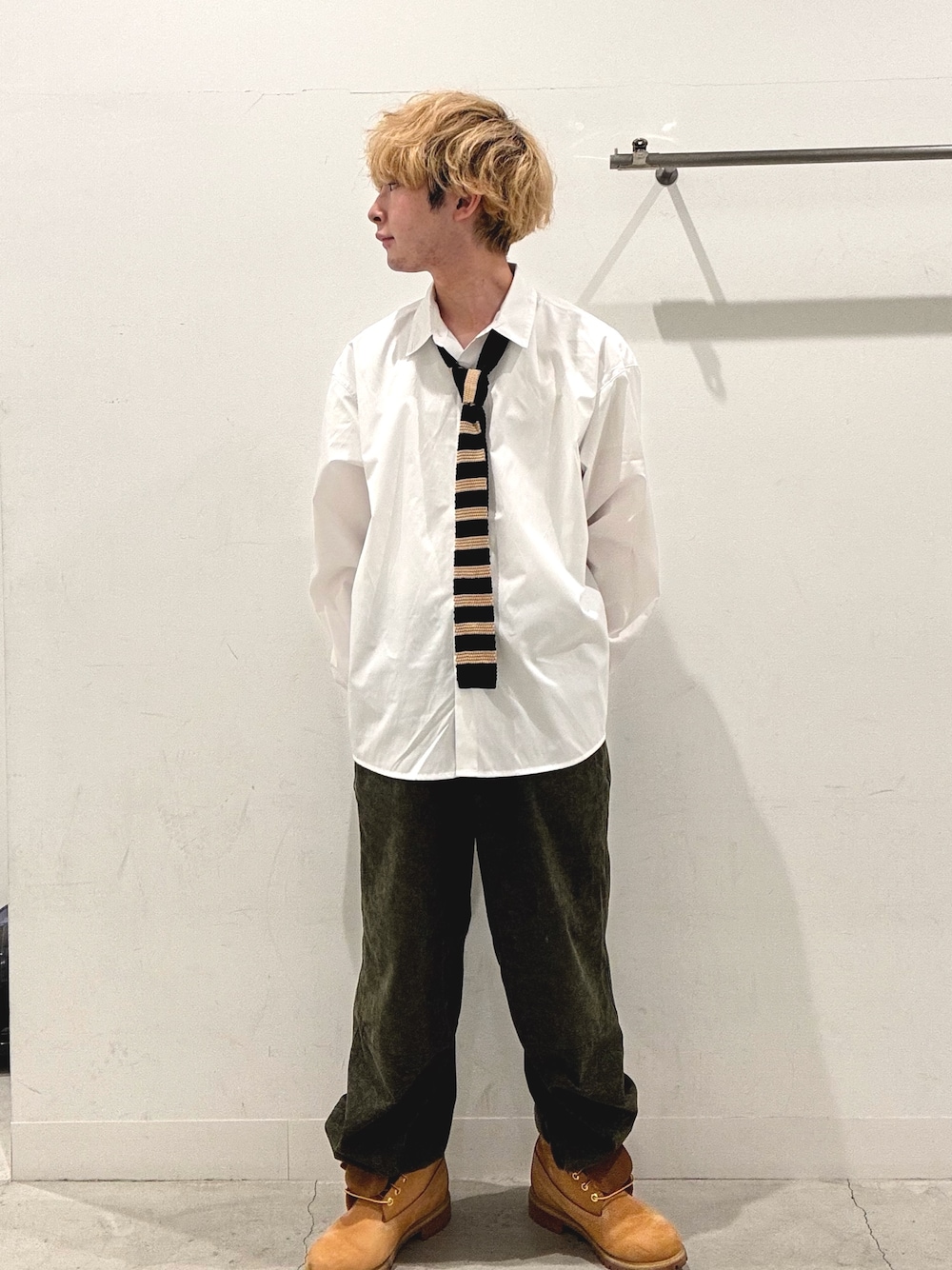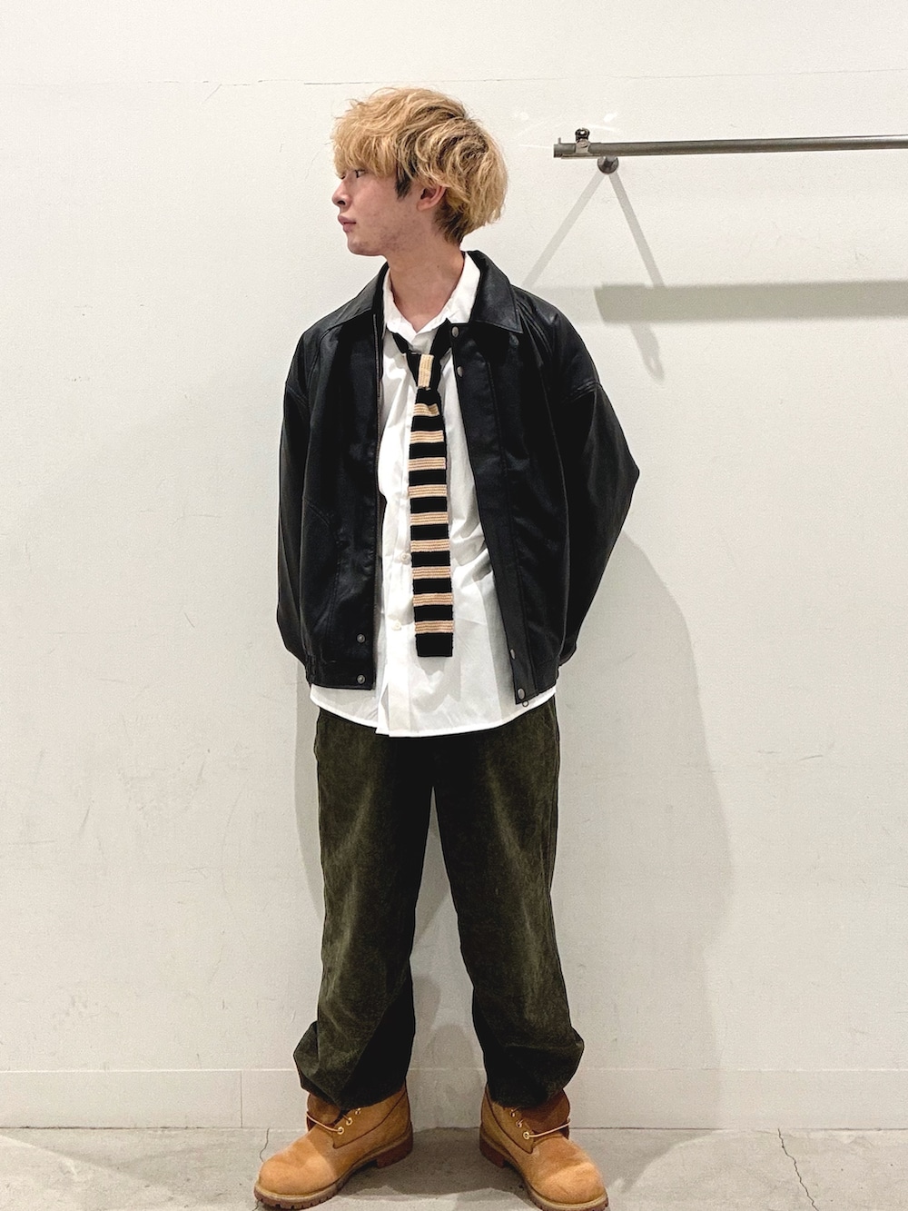 大きめのシャツにボーダーのネクタイをゆるく締めて、カジュアルにしました!革ジャンを羽織ってもいい感じです!