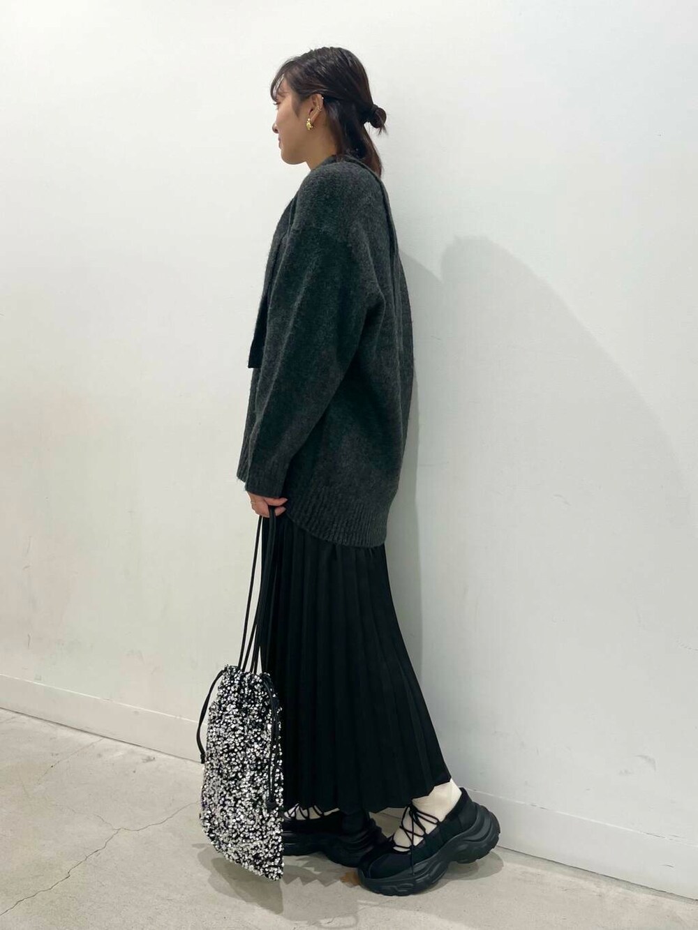 チョーカー付きのセーターはお尻まですっぽり隠れる長さでロングスカートとの相性◎