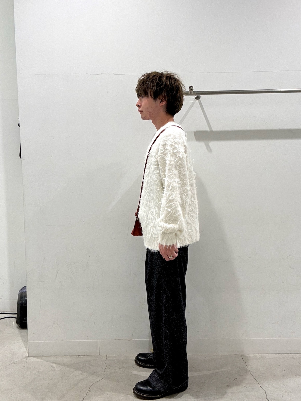 この時期らしいシャギークルーネックニットにワイドパンツをはいて、さし色にオレンジのショルダーバッグを合わせてみました!