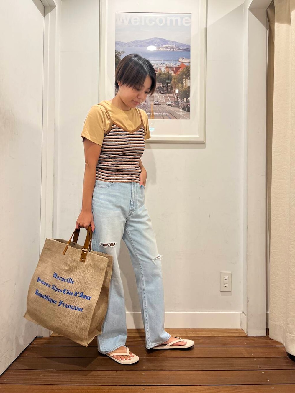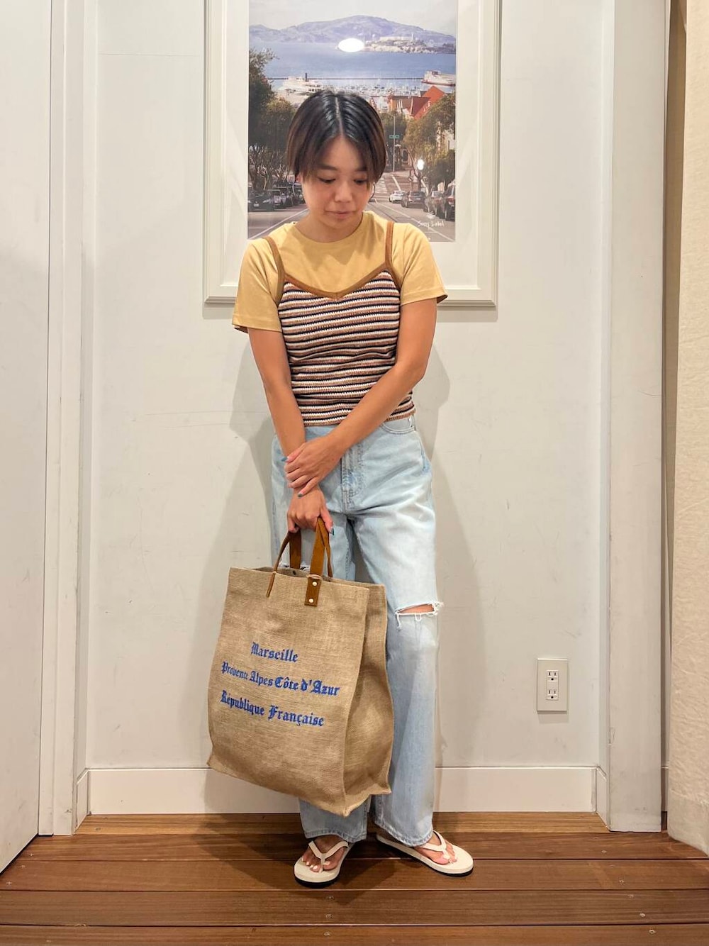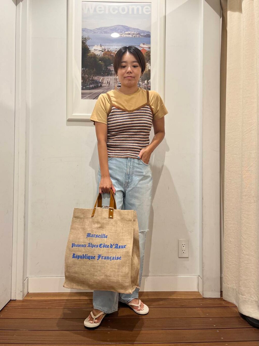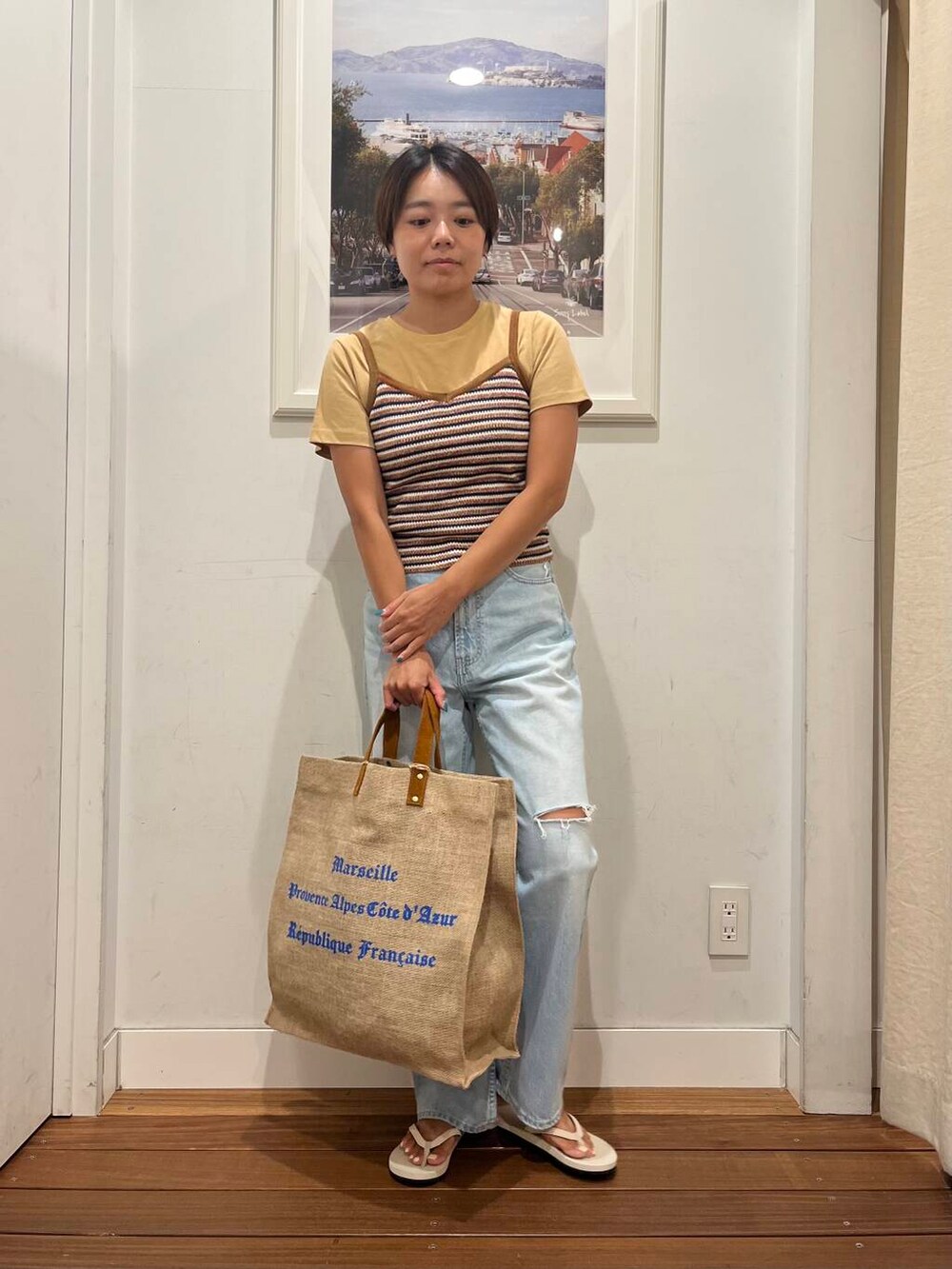 着用のマルチボーダーニットキャミソールは、1枚で着ても、私のようにTシャツをレイヤードさせても、どちらもかわいく着れてオススメです。