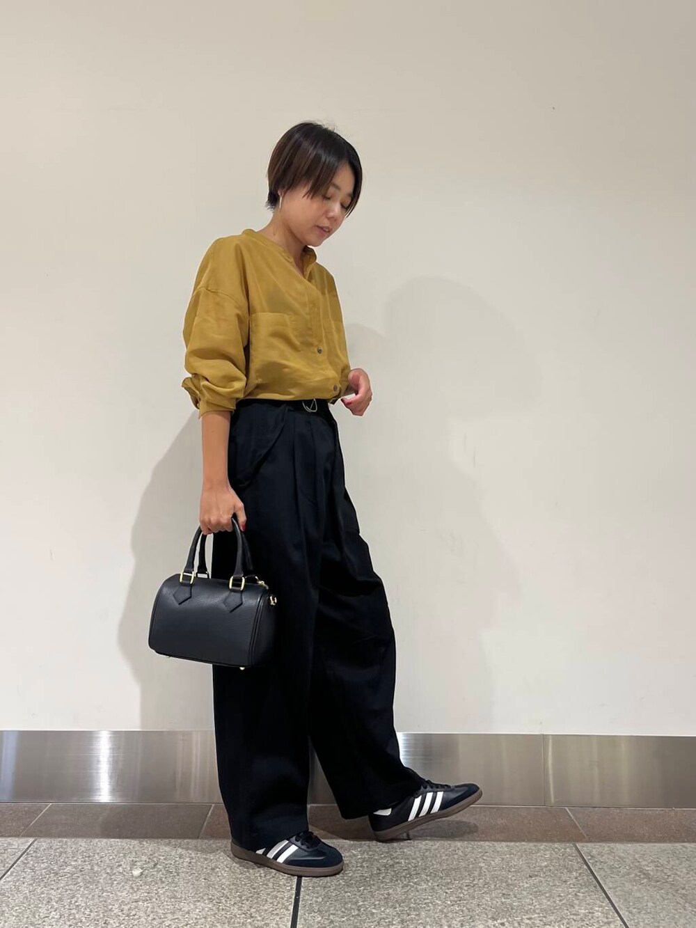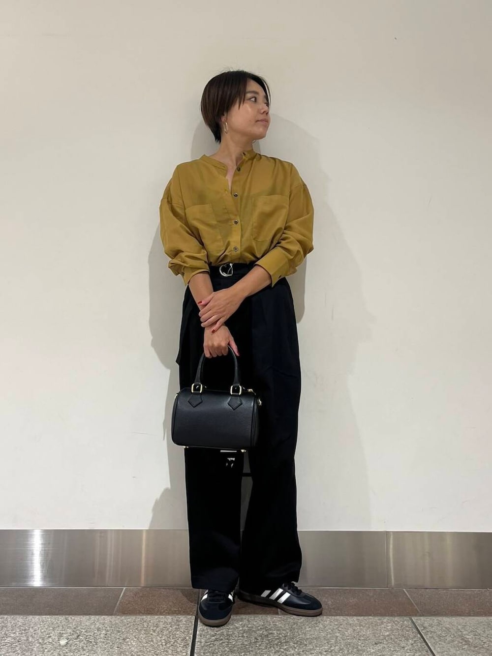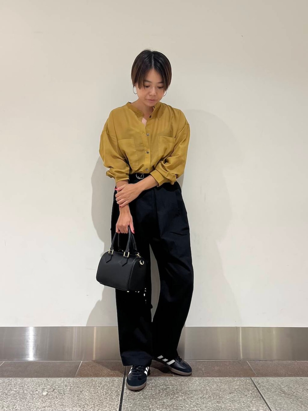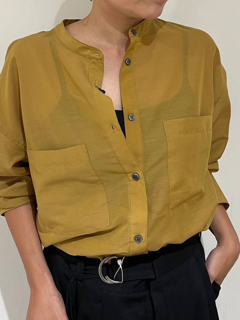 着用のシアーバンドカラーシャツは、エアリーなので今時期から羽織として使えたり、透け感があって暑苦しくないです!