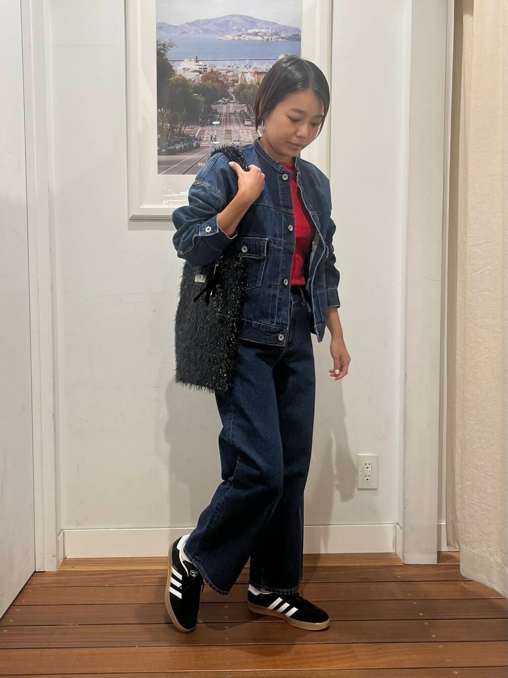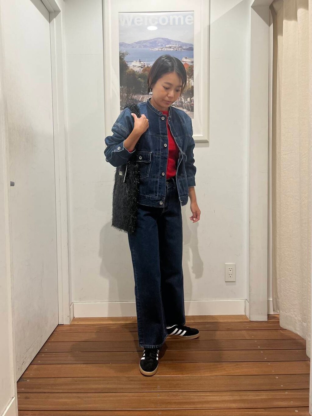 着用のデニムジャケットは、ワンサイズですが、大き過ぎずコンパクト過ぎないので、ボトムを選びません。