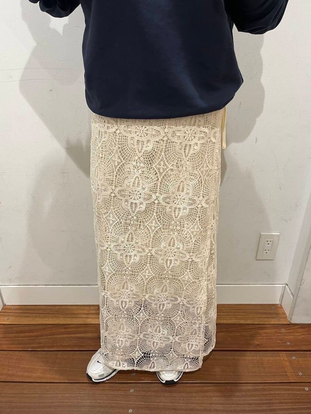 着用のレースラップロングスカートは、今トレンドなのでオシャレアイテムとしてポイントになります。