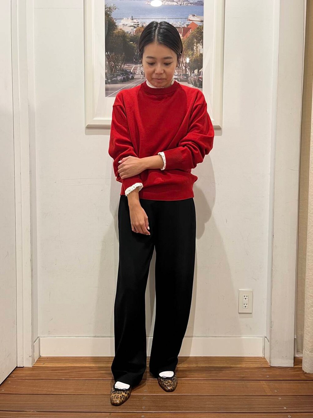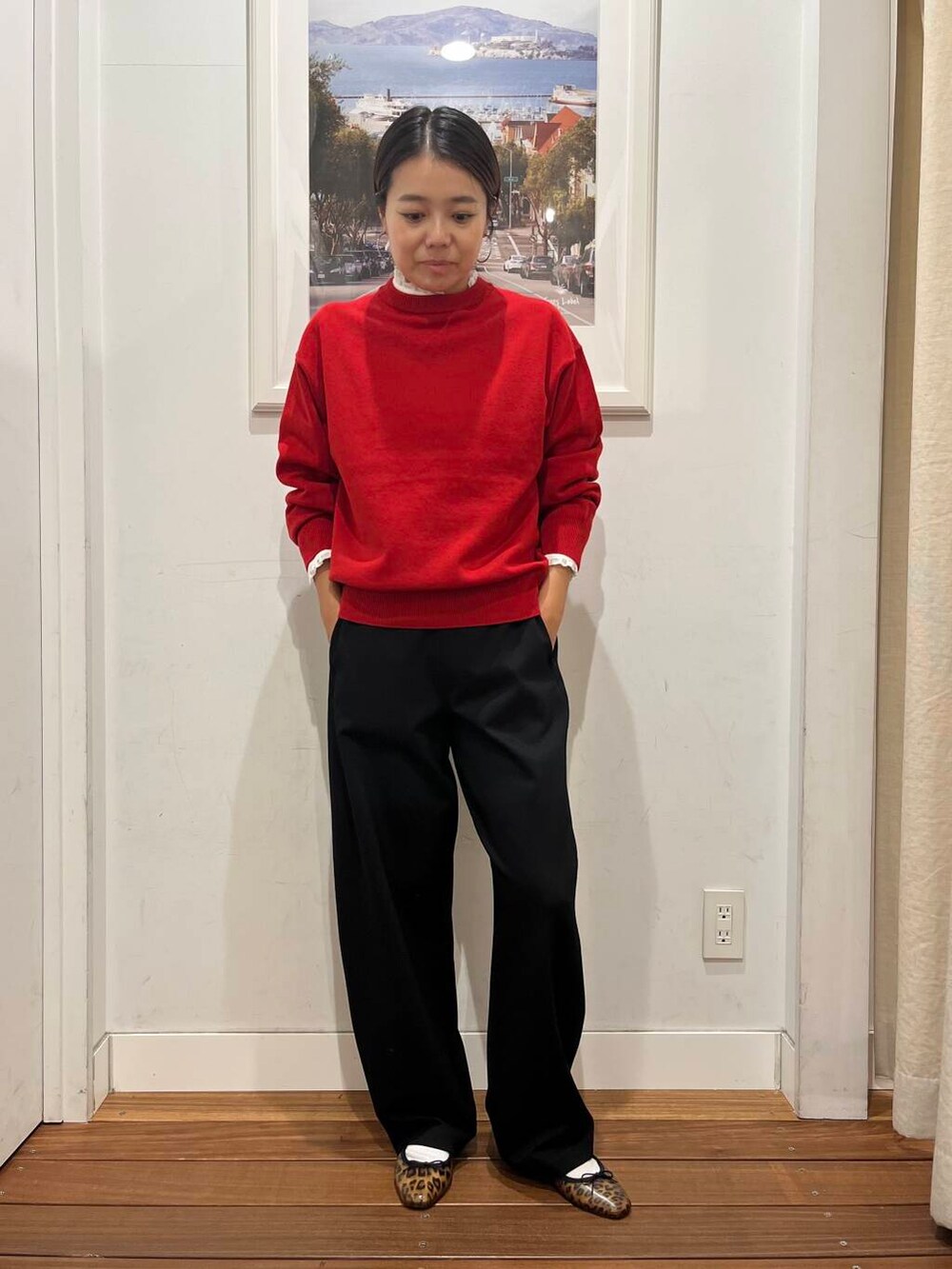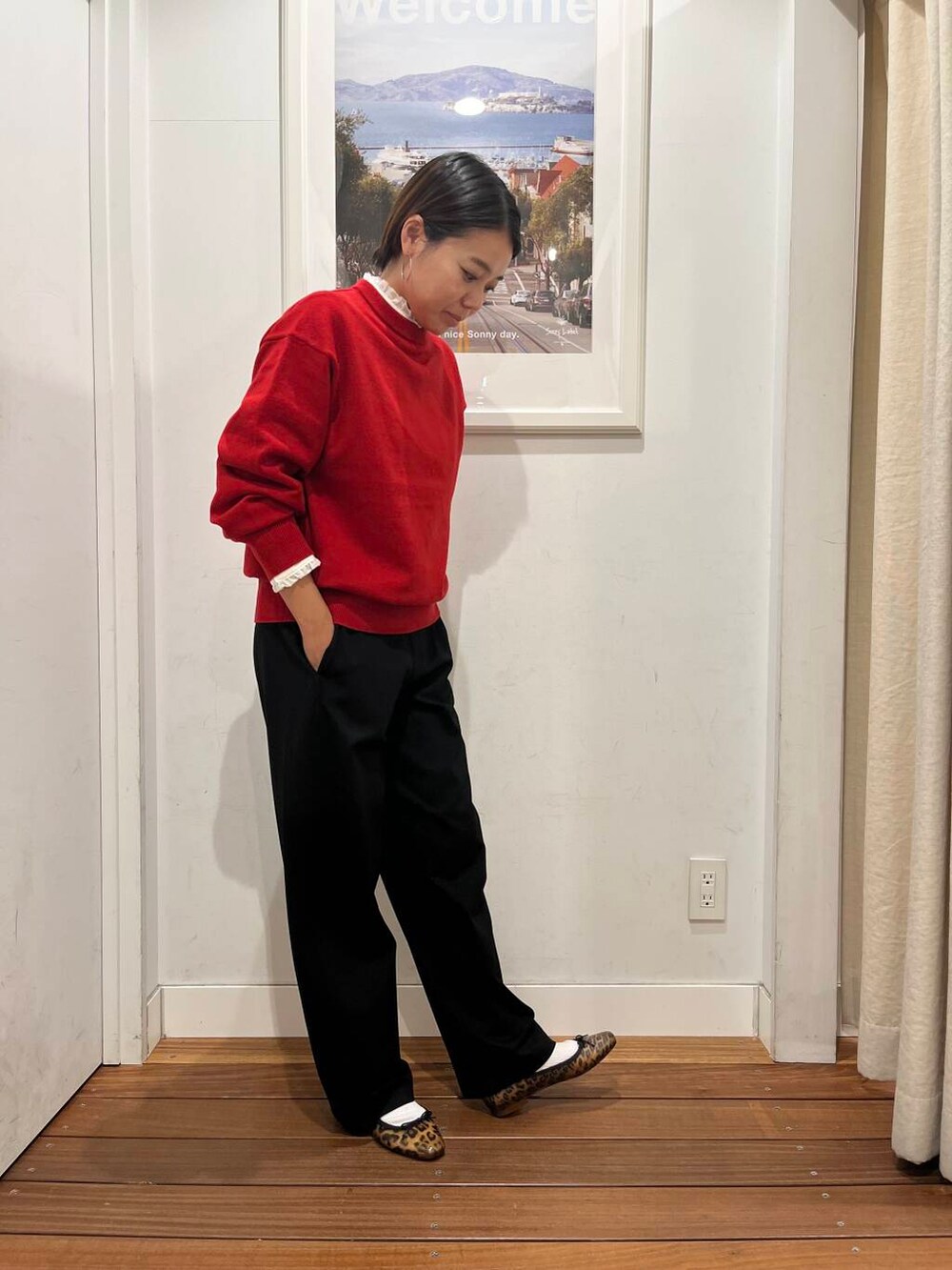 着用のスウェットライクニットは、スウェットっぽい生地感で着やすく、これからの時期にちょうど使いやすいニットです。