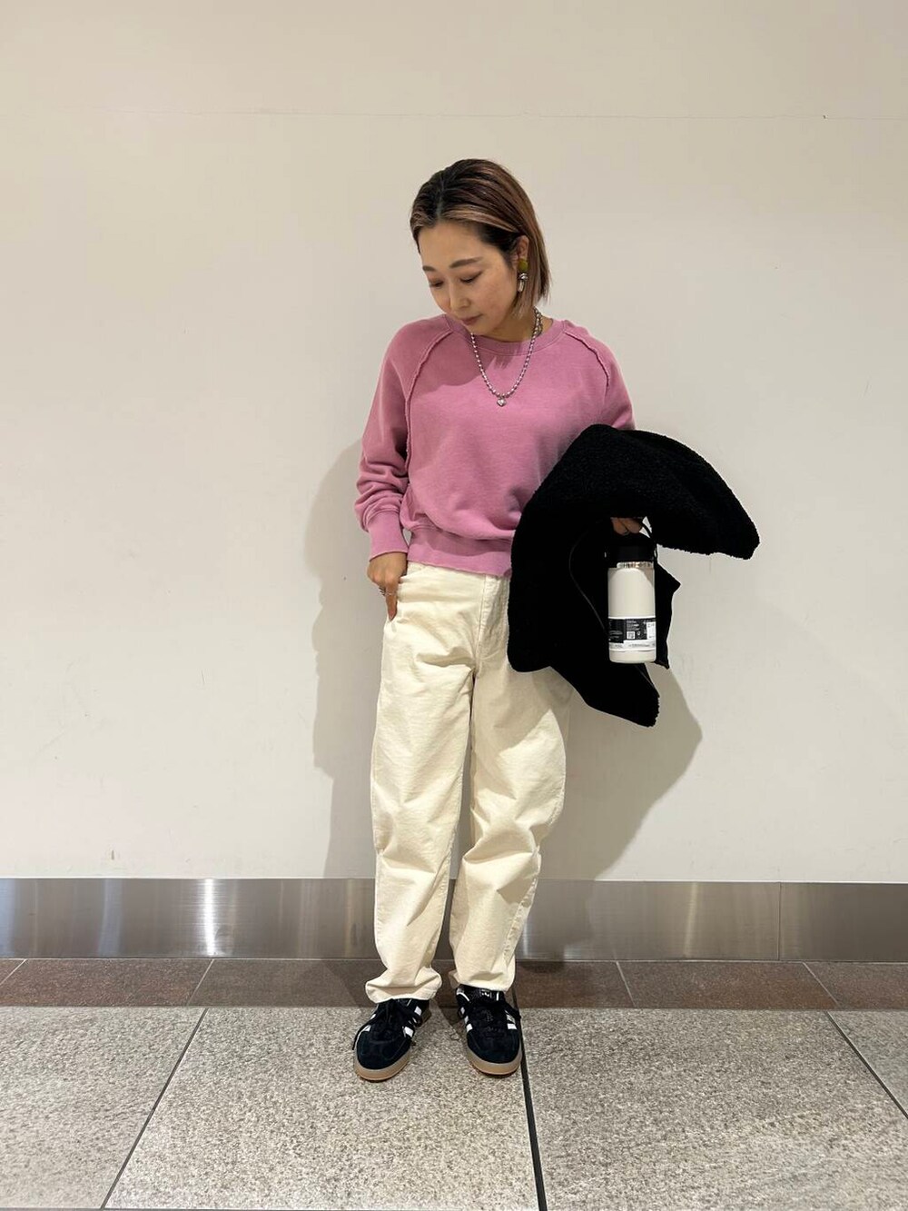 今年人気のゆるっとしたデザインのカーブパンツにビンテージ加工のある低身長さんオススメのスウェットはバランス良く見せてくれます。