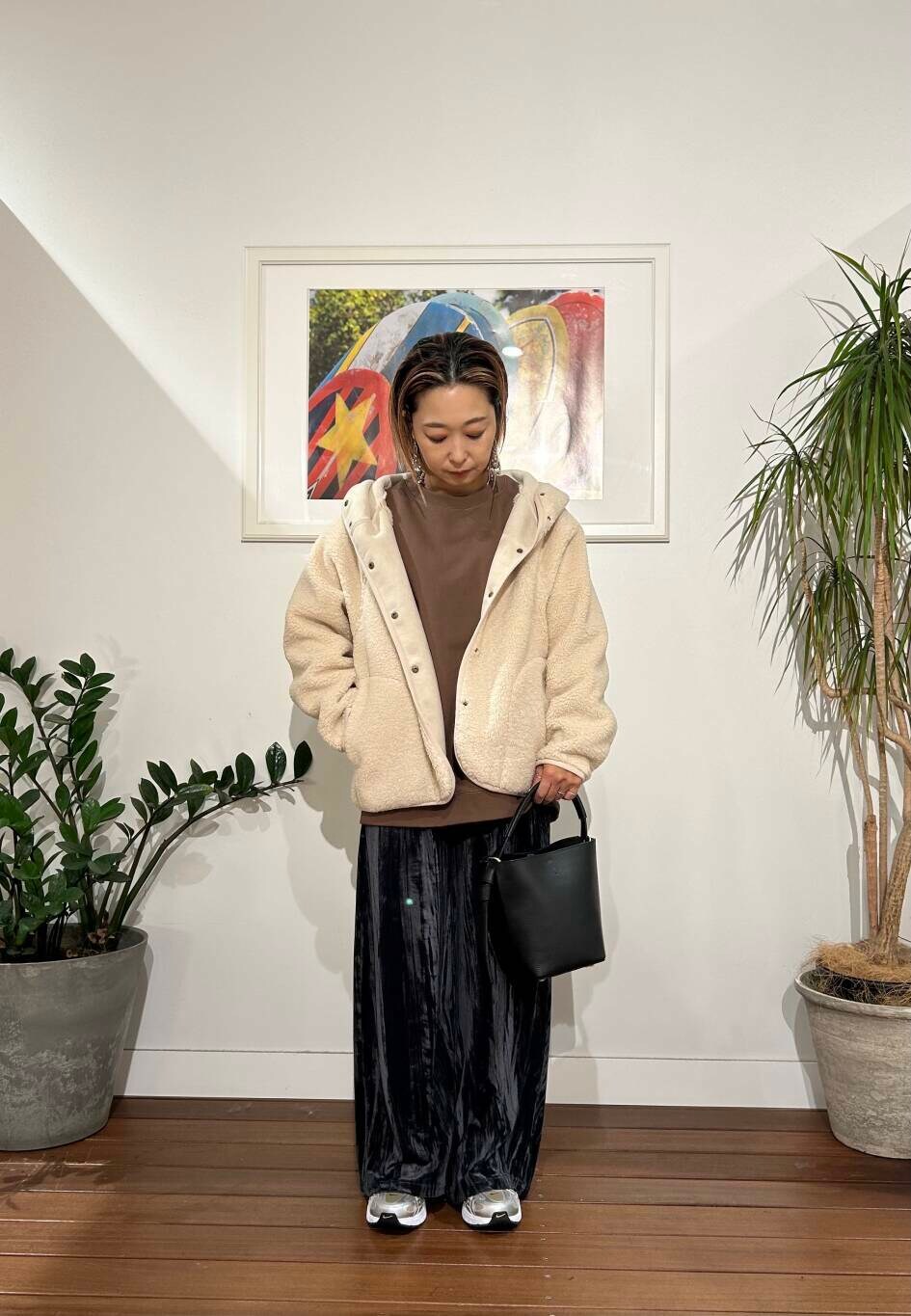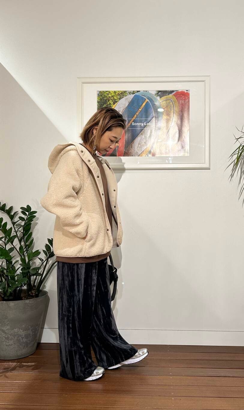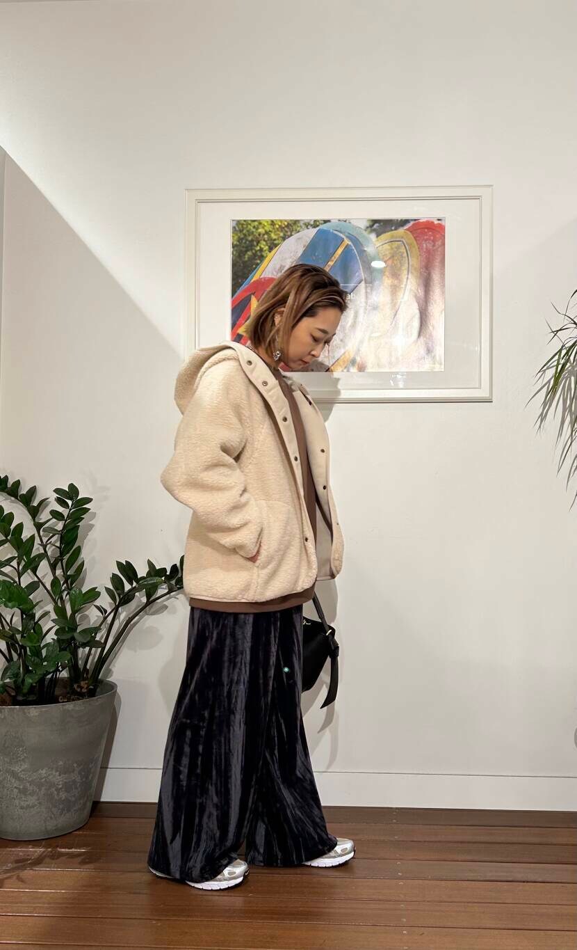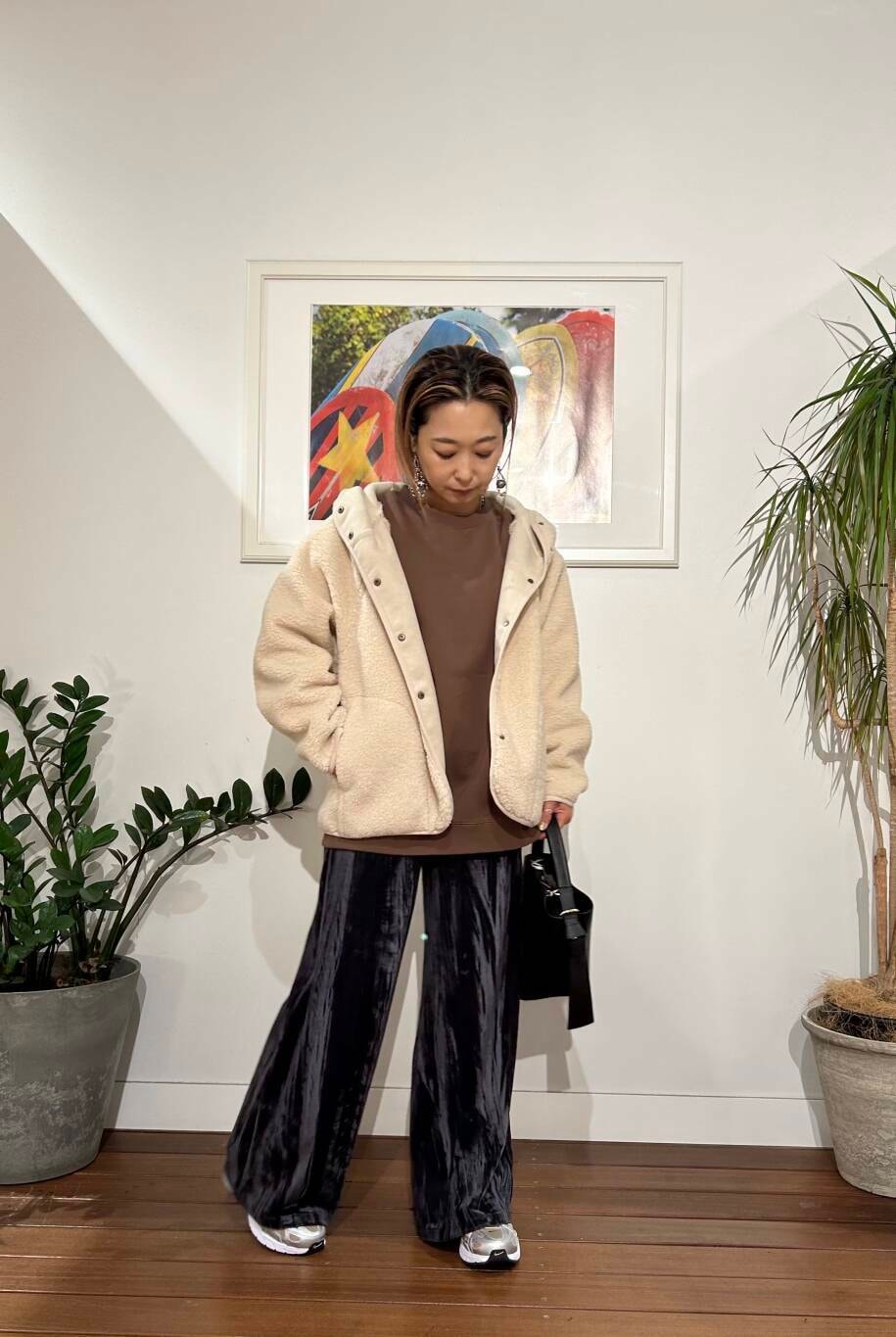 スウェットに、ベロアパンツは楽なのに綺麗めにまとまるのでオススメです!