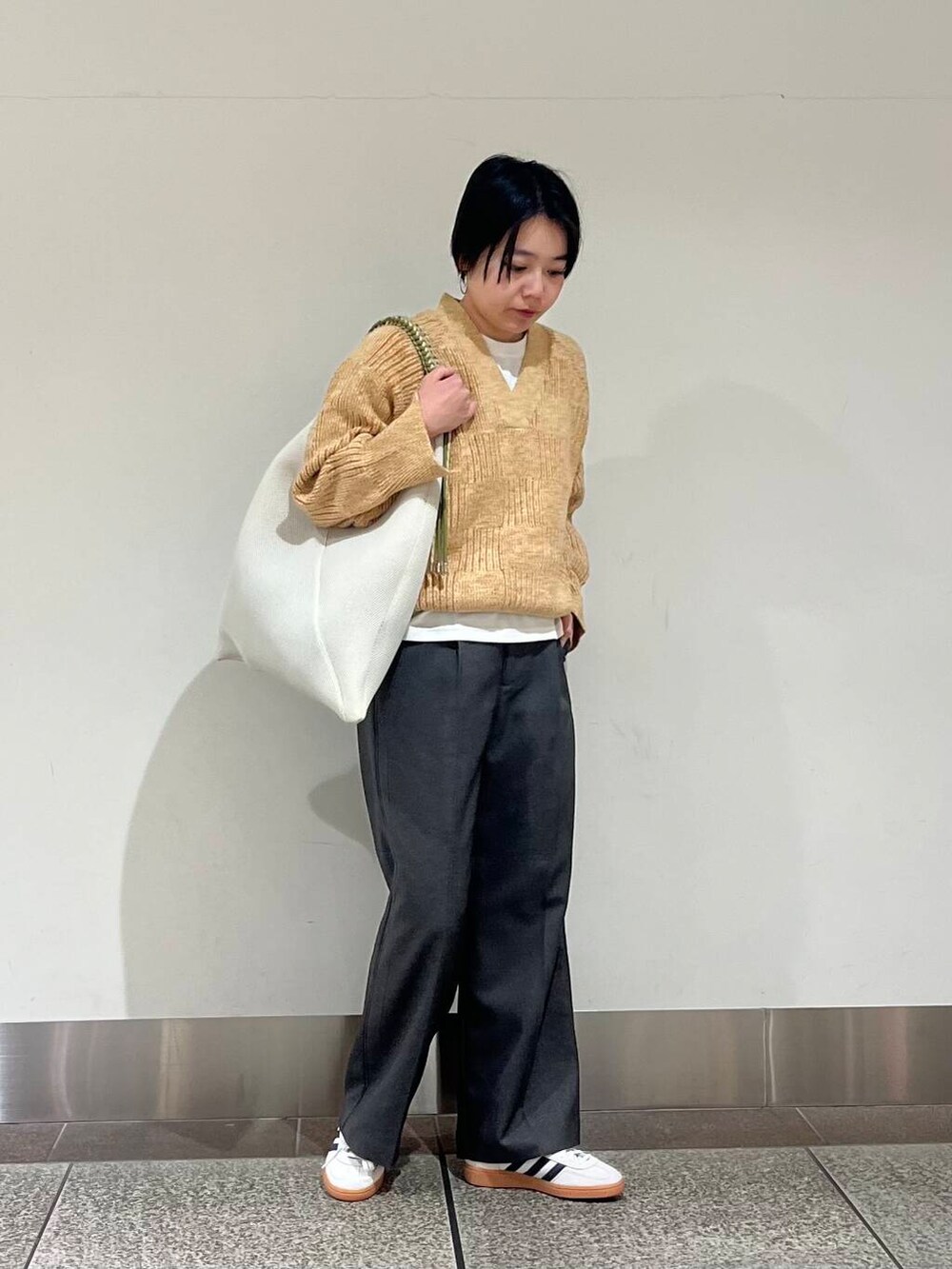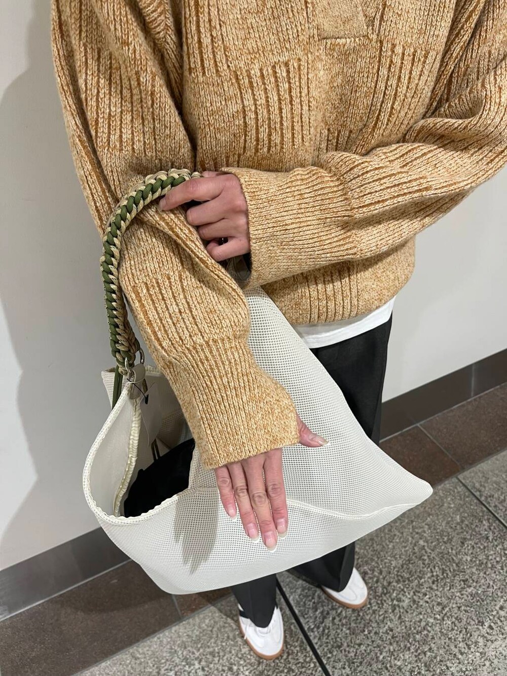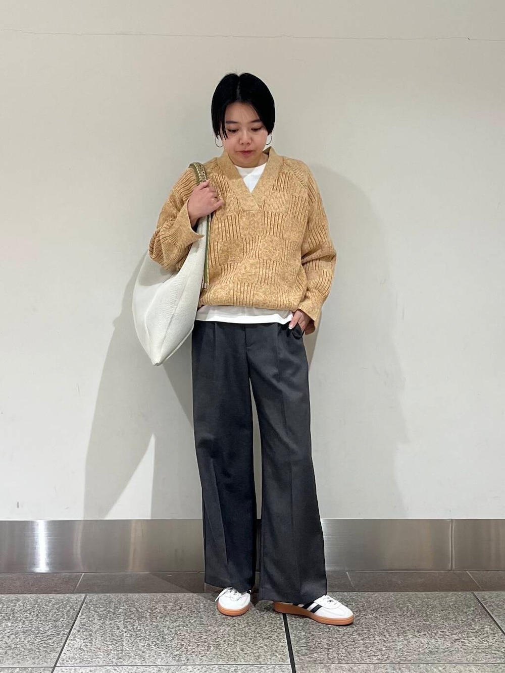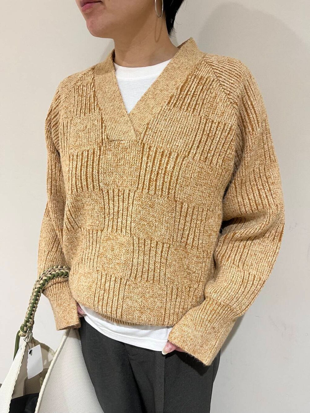 着用のVネック配色スクエアパターンニットは、春物の新作ですが、今からちょうど着られて、なおかつ春っぽいアイテム!