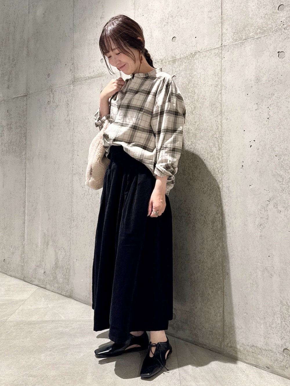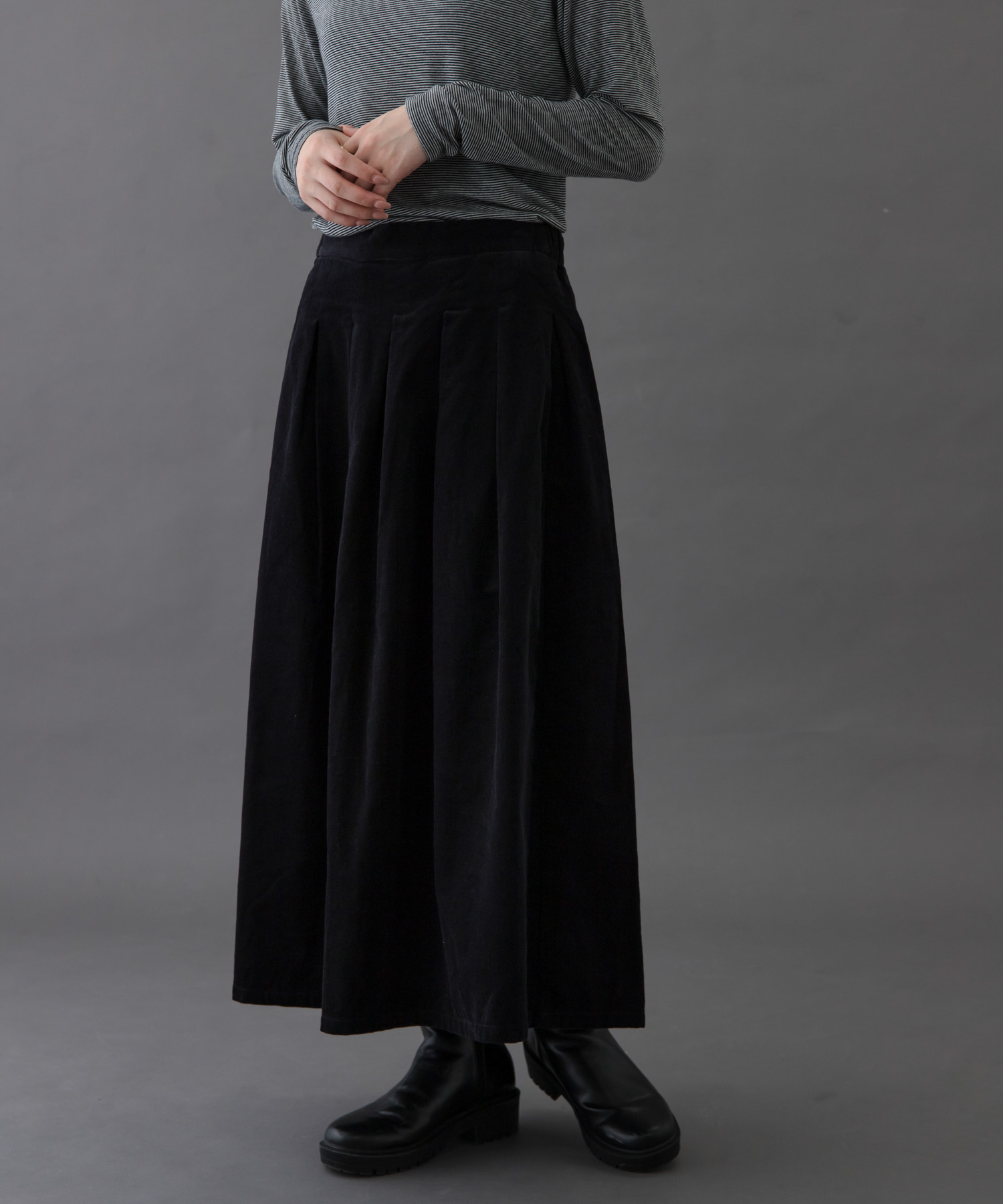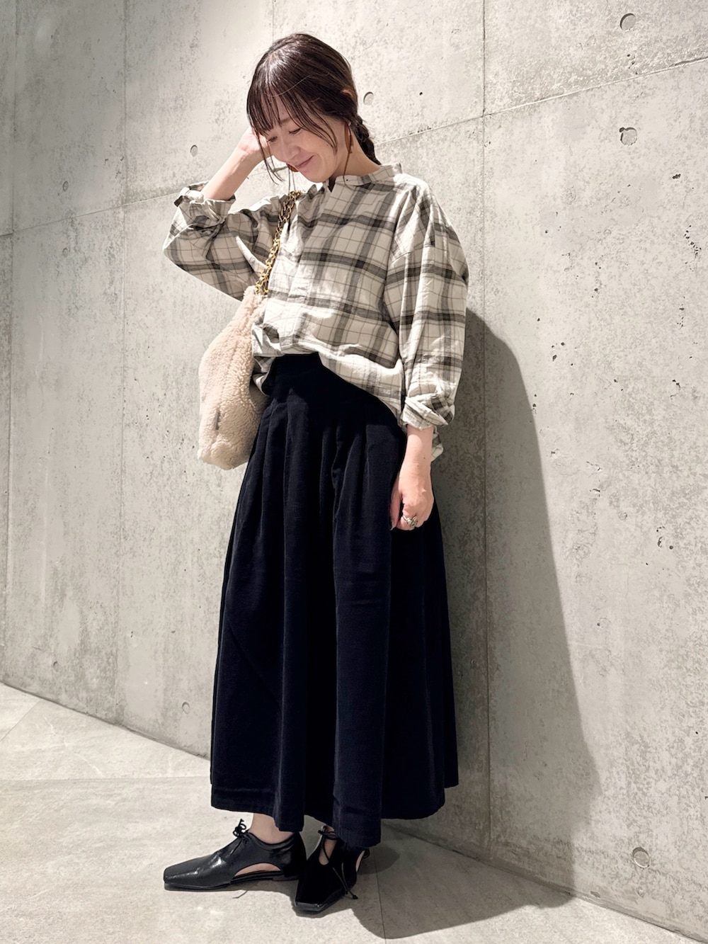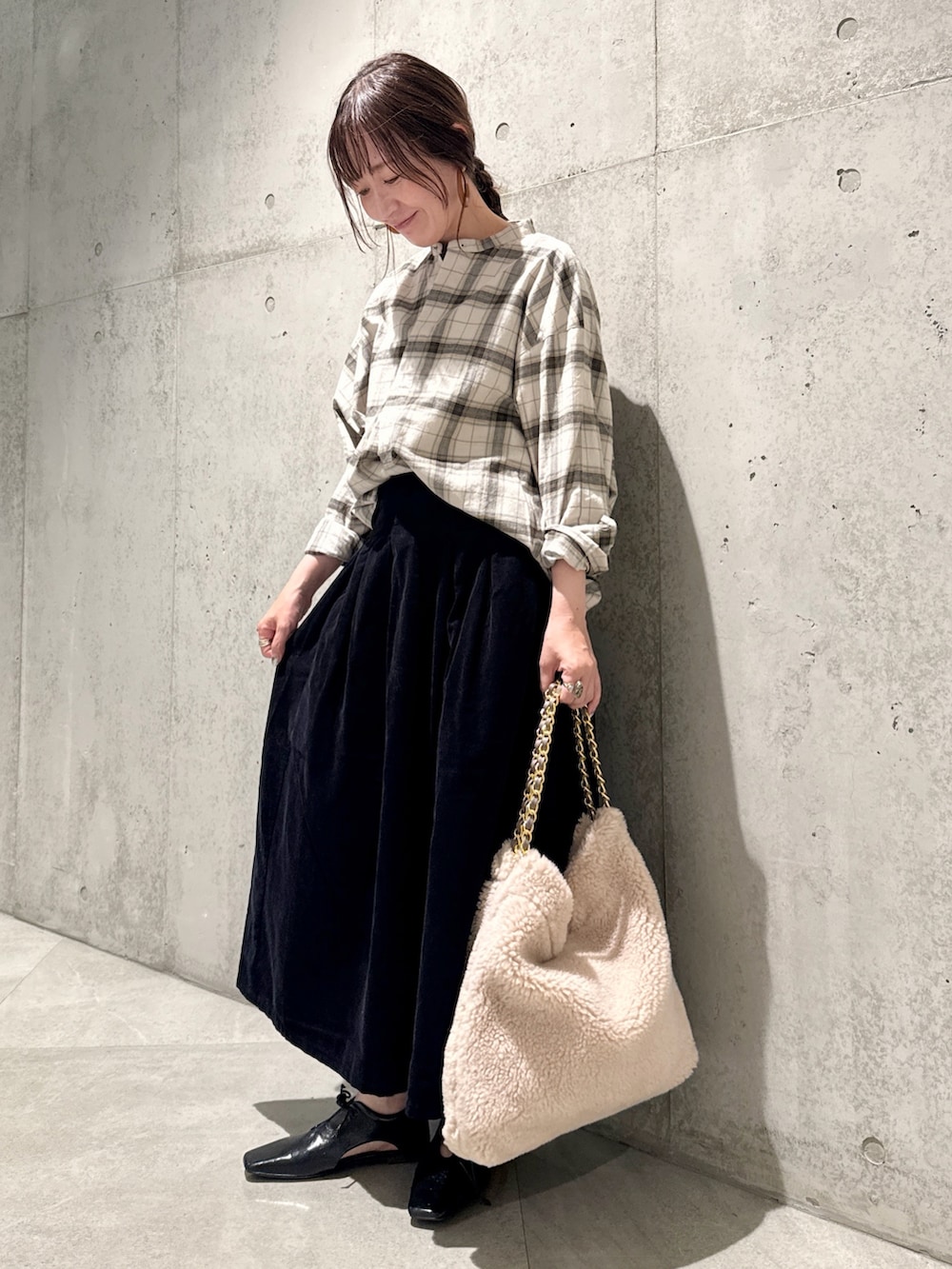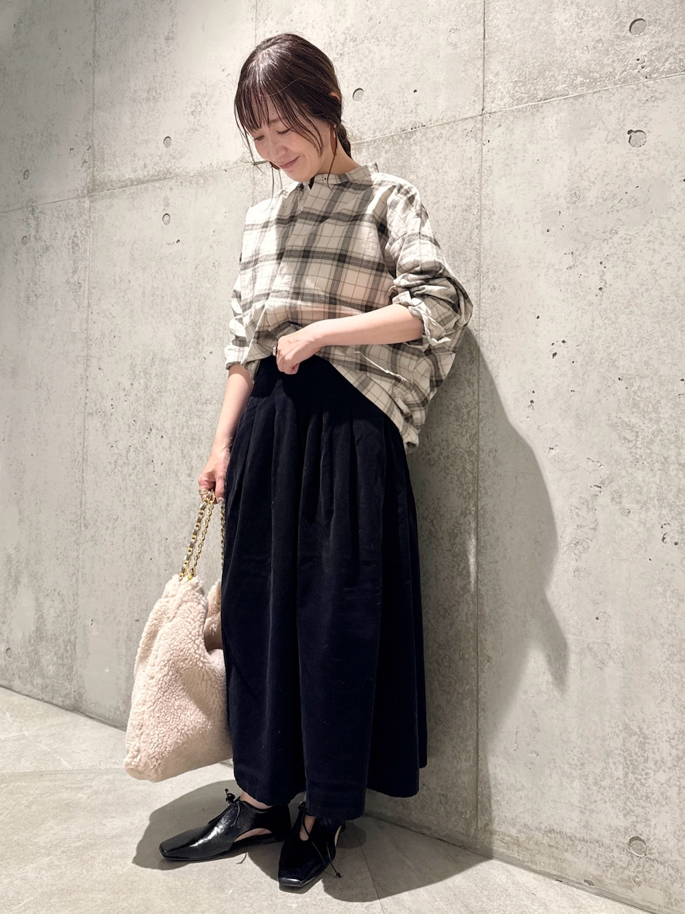 今回は、コーデュロイのスカートと合わせて、秋冬らしいコーディネート。