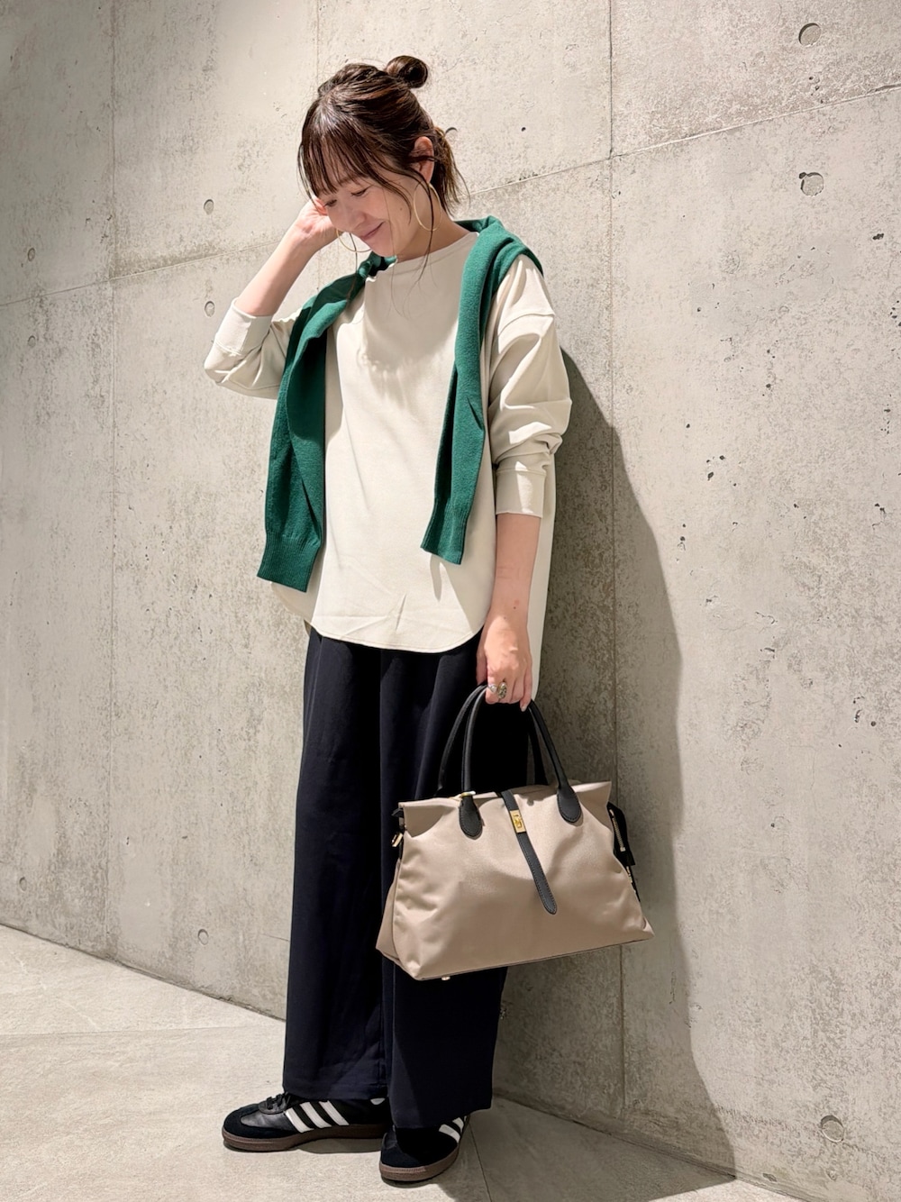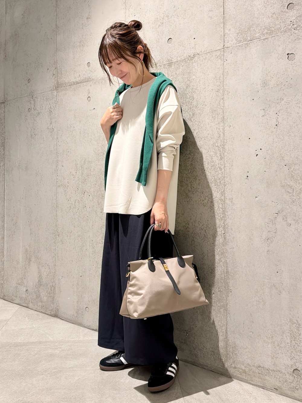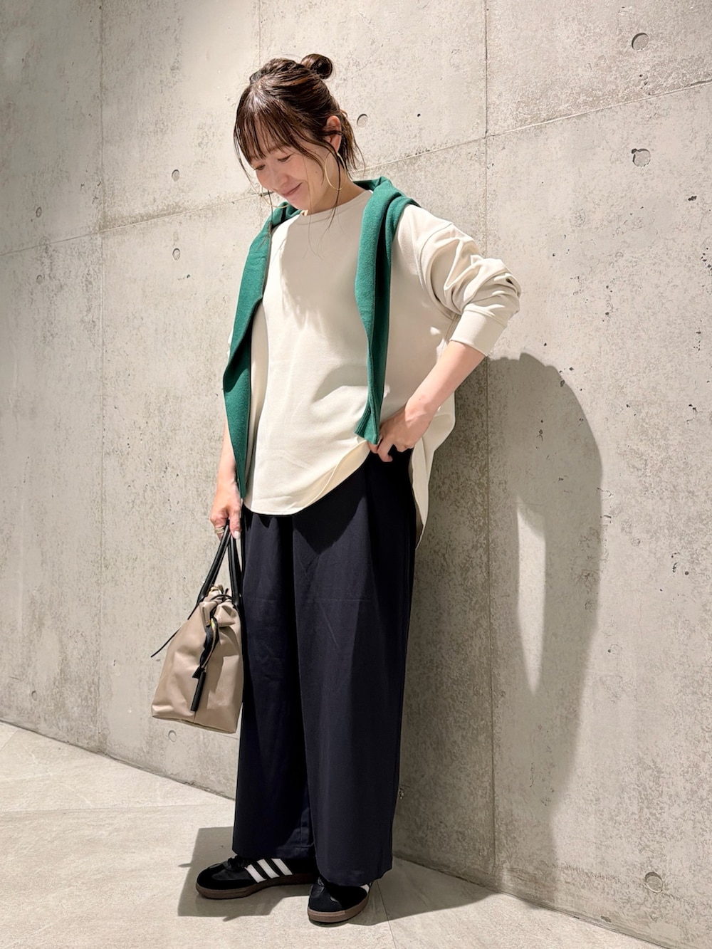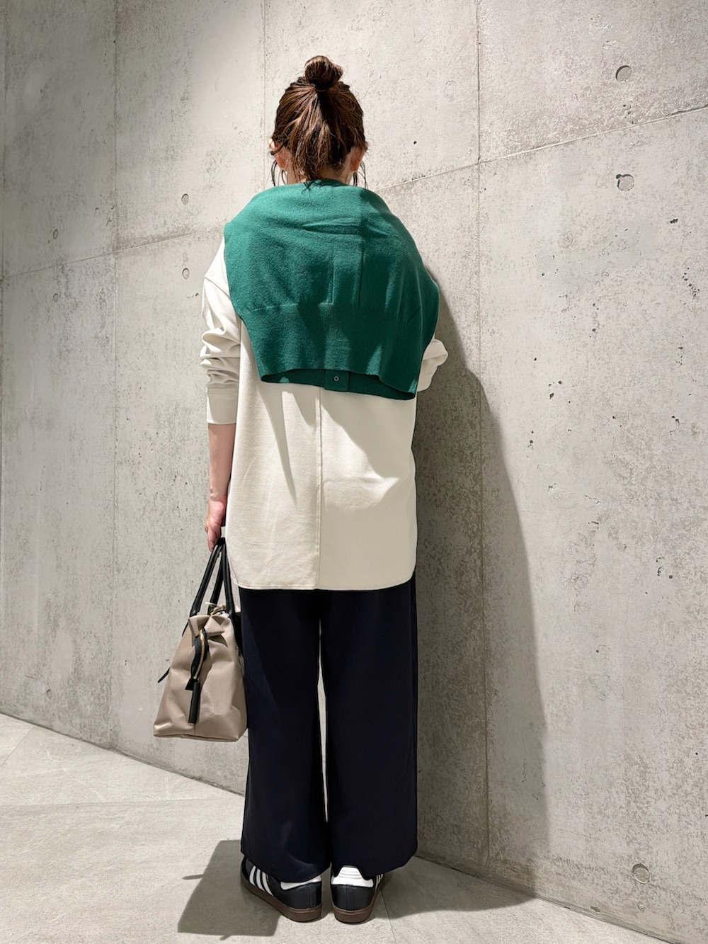 グリーンのカーディガンを肩掛けしてアクセントにしてみました。