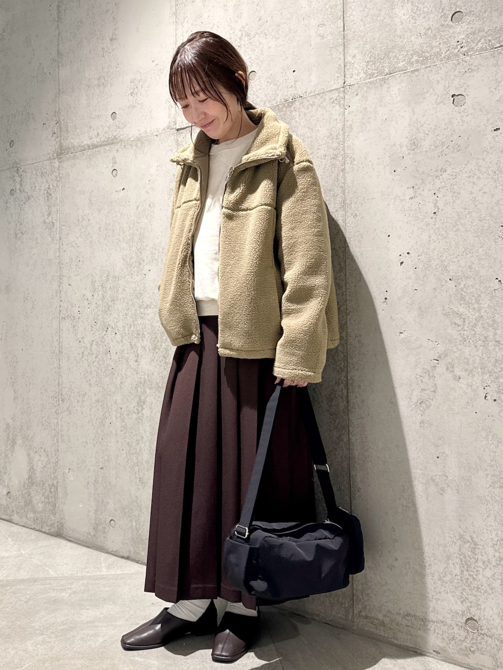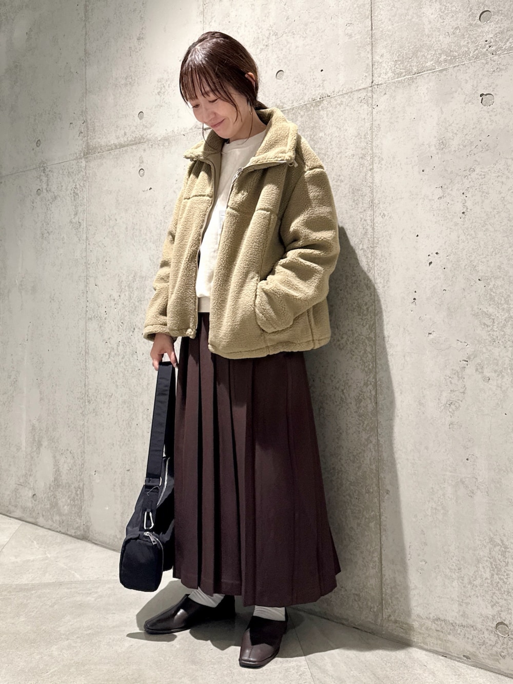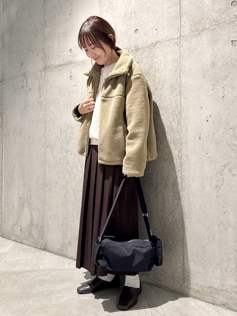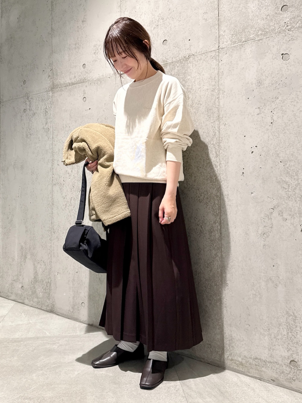 今回は、プリーツスカートにインナーはスウェットを合わせた、大人カジュアルコーディネート。