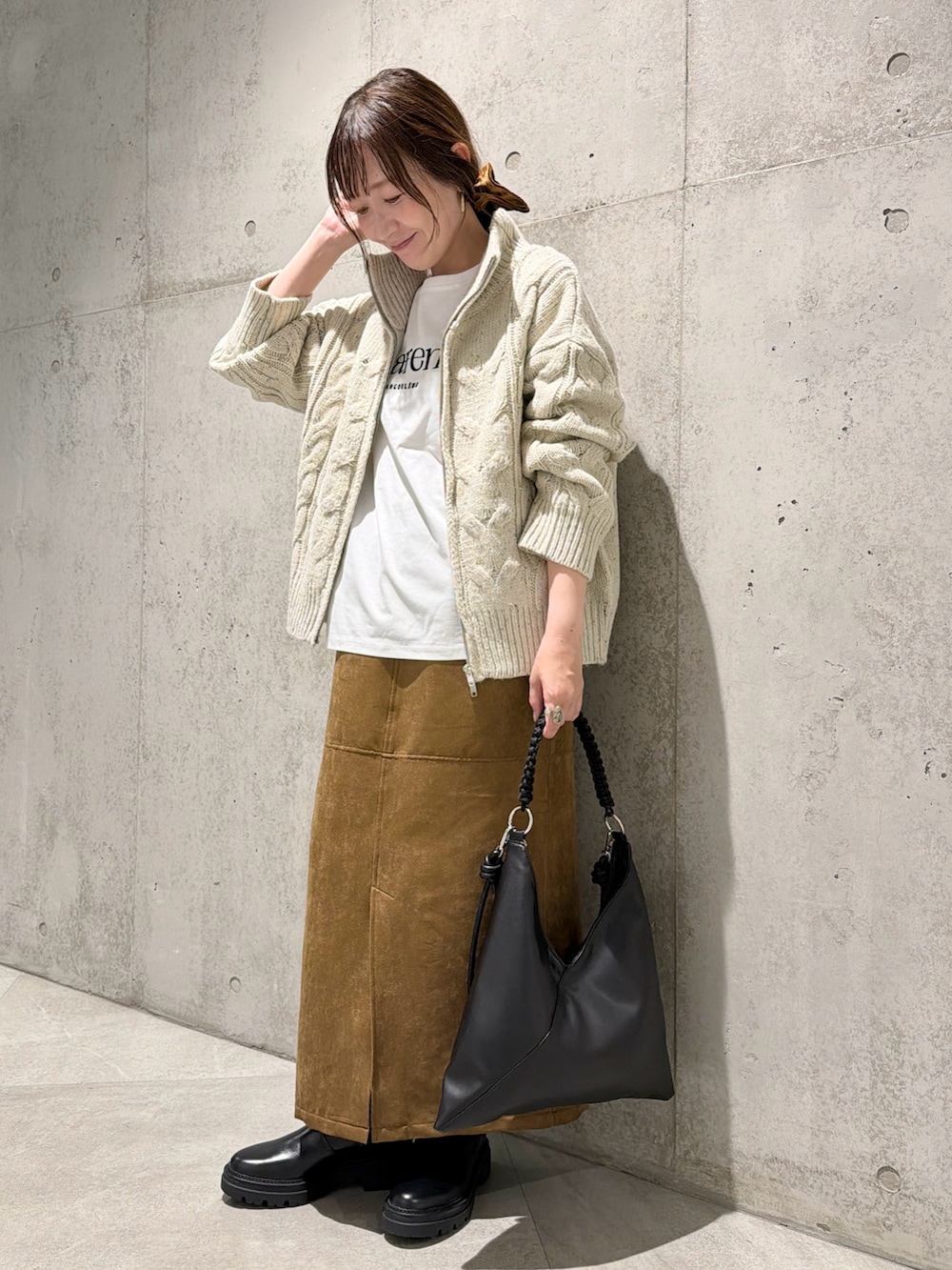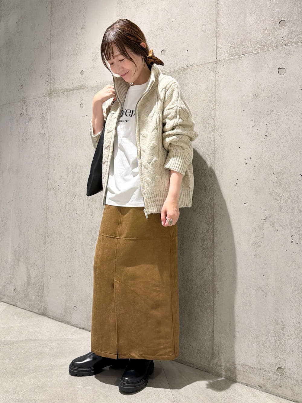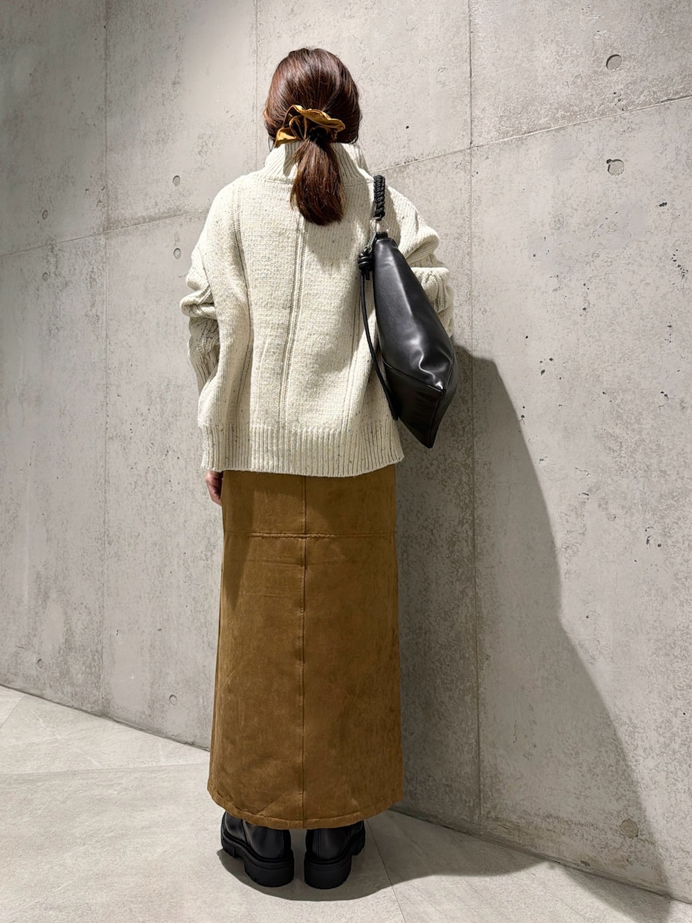 今回は、スエード調のロングスカートと合わせた、カジュアルコーディネートです。