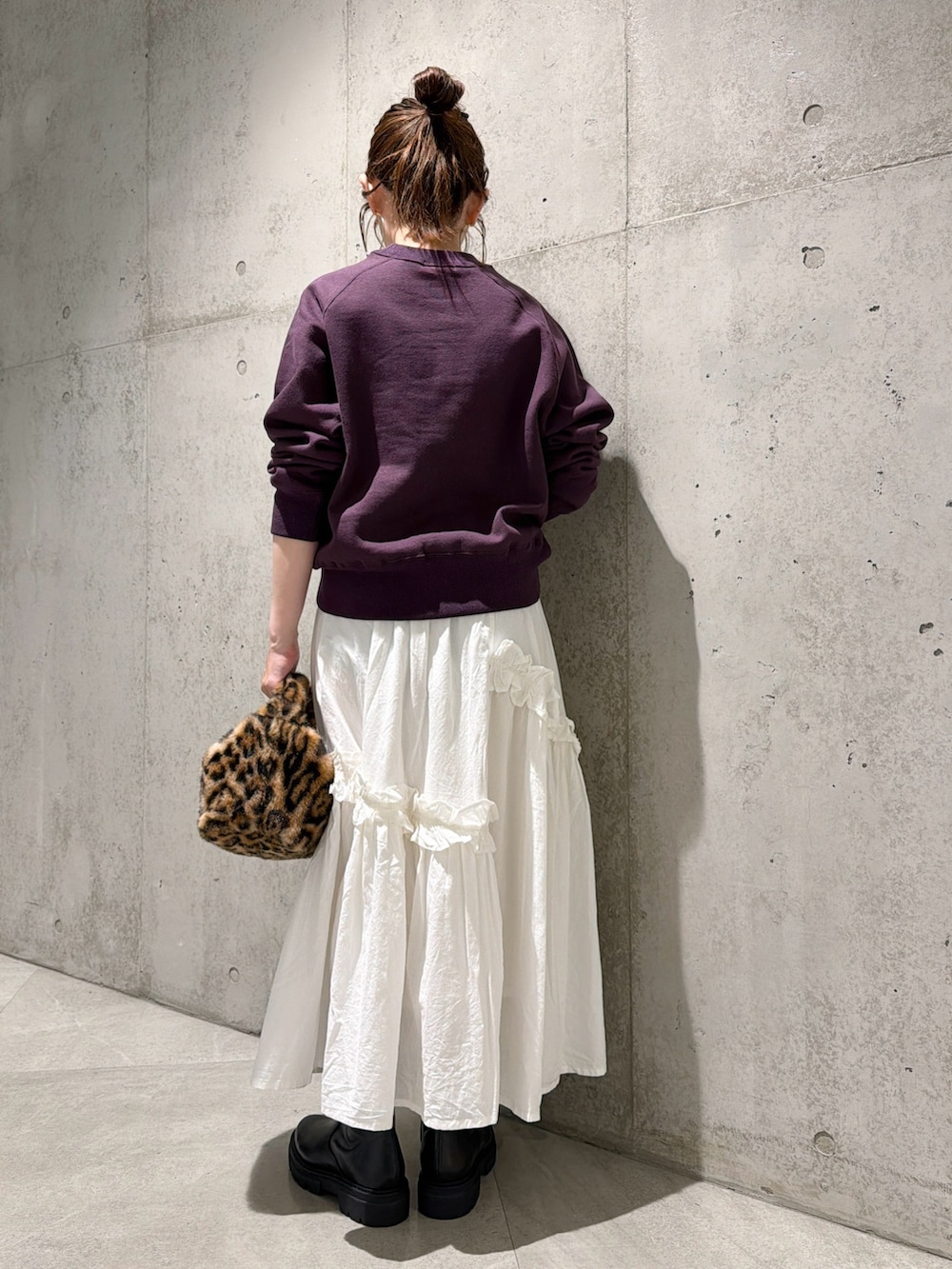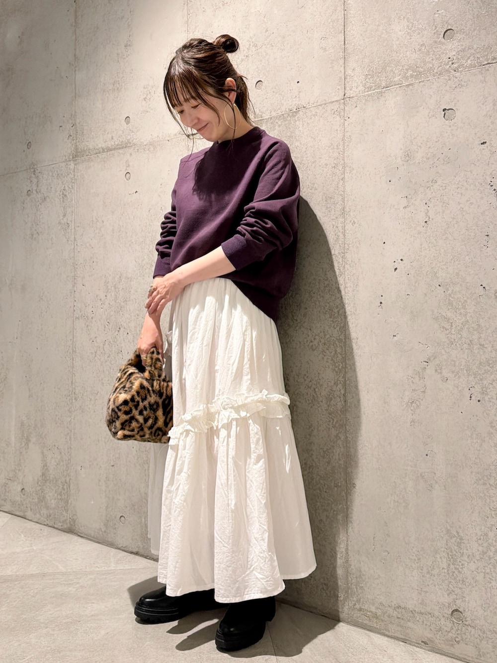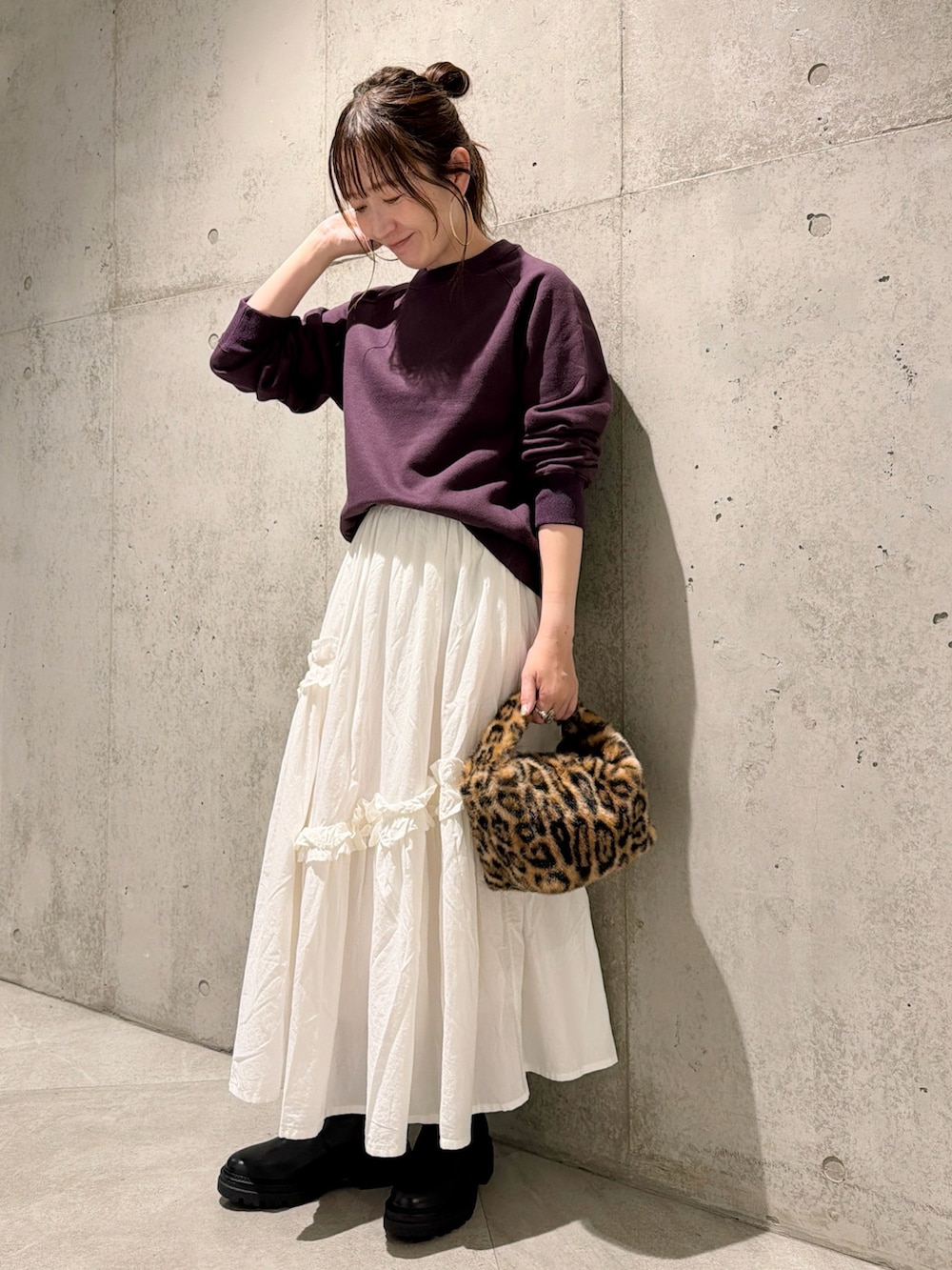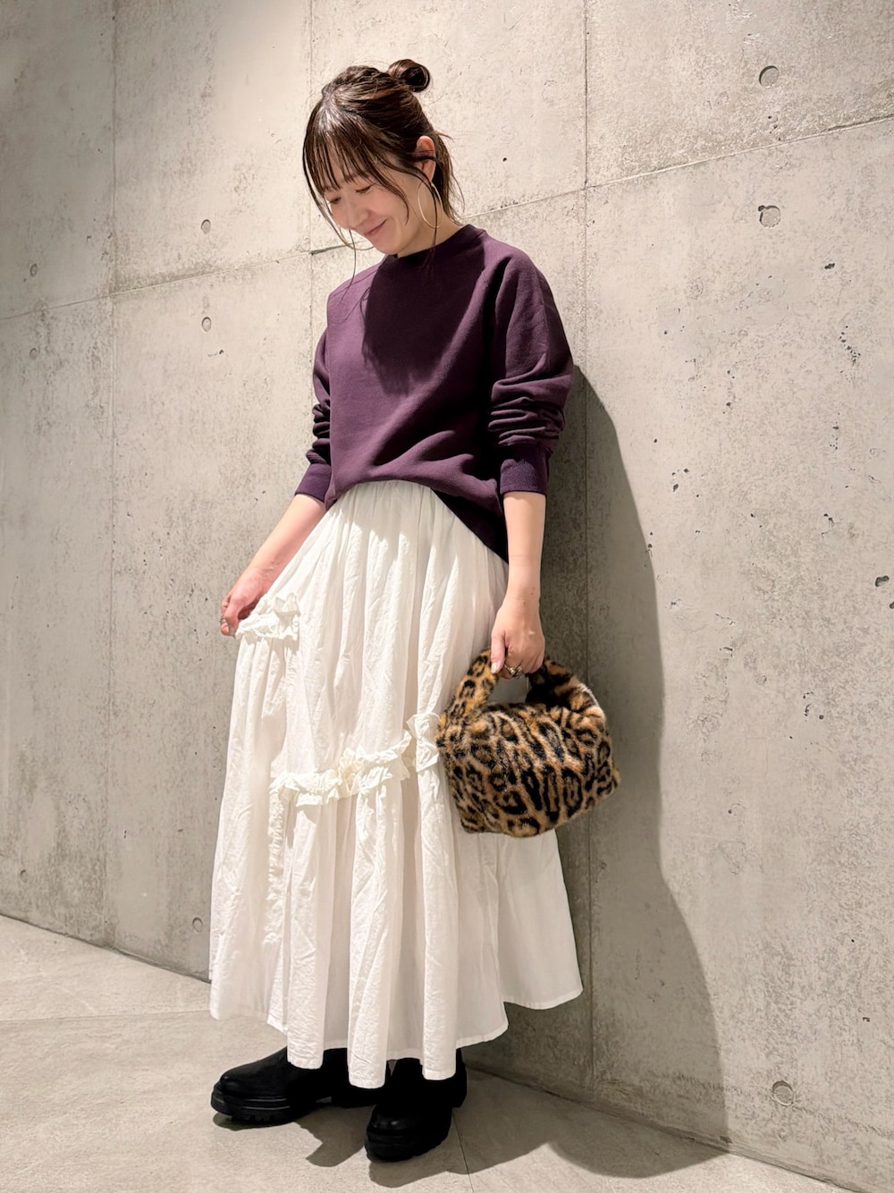 今回は、フリルとボリュームが女性らしさのあるロングスカートを合わせた大人カジュアルコーディネート。