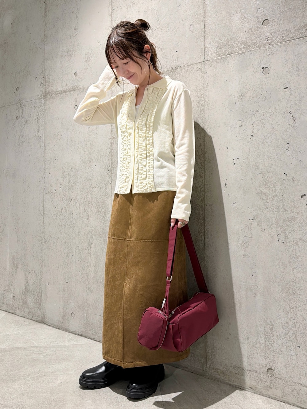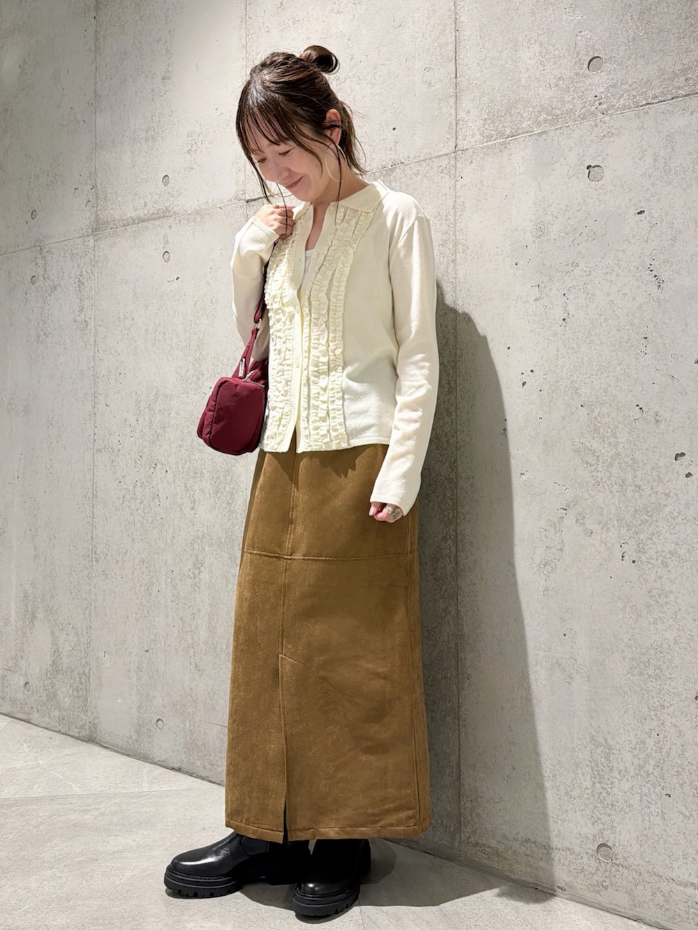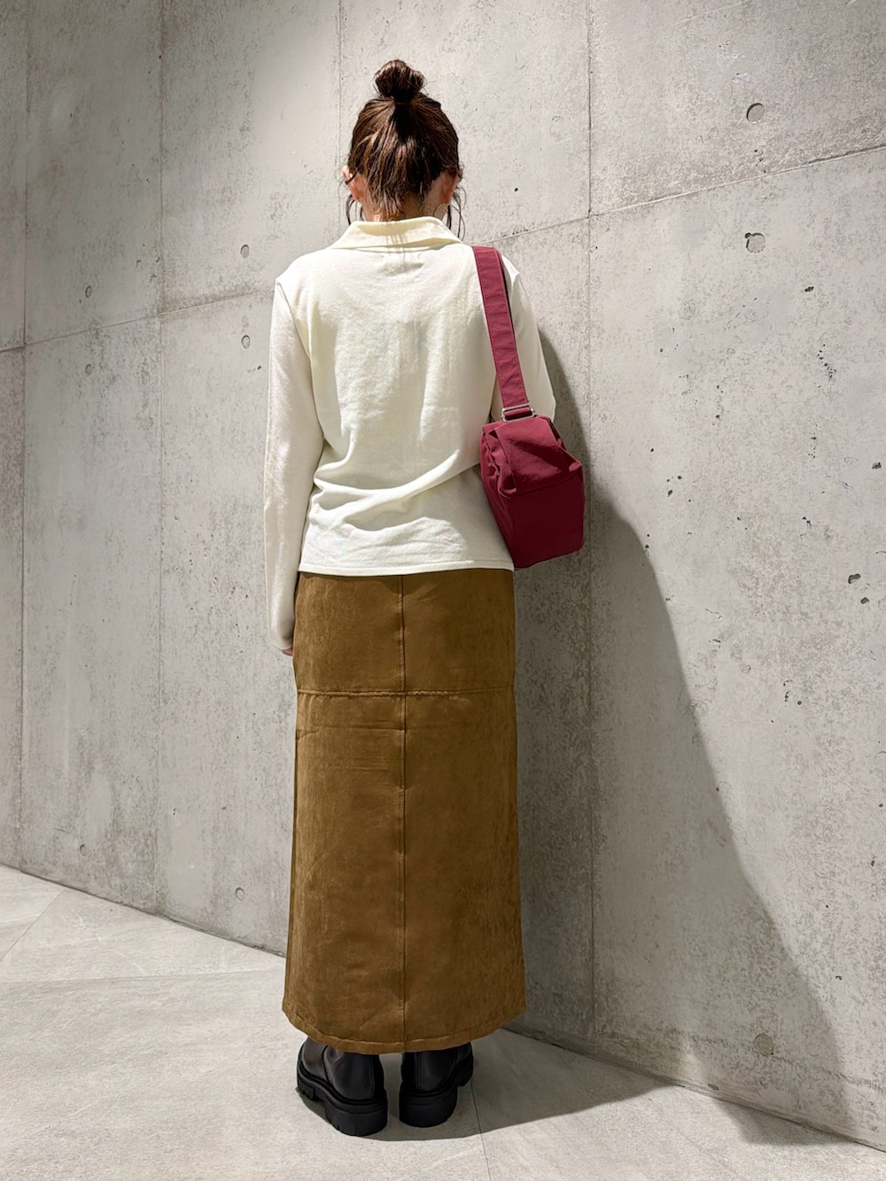 今回は、スエード調のロングスカートと合わせた、大人カジュアルコーディネート。