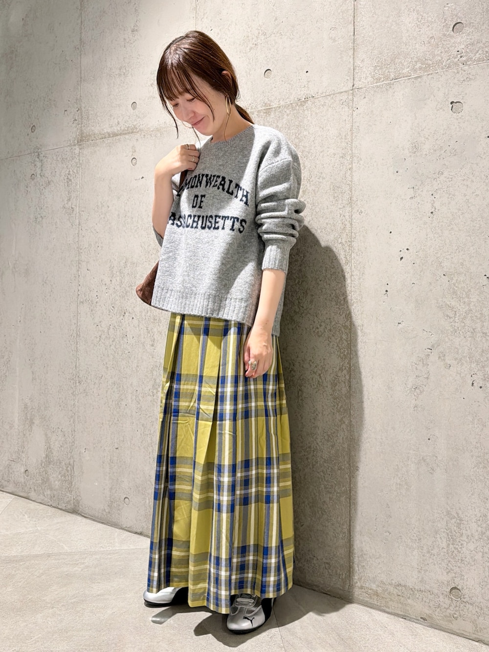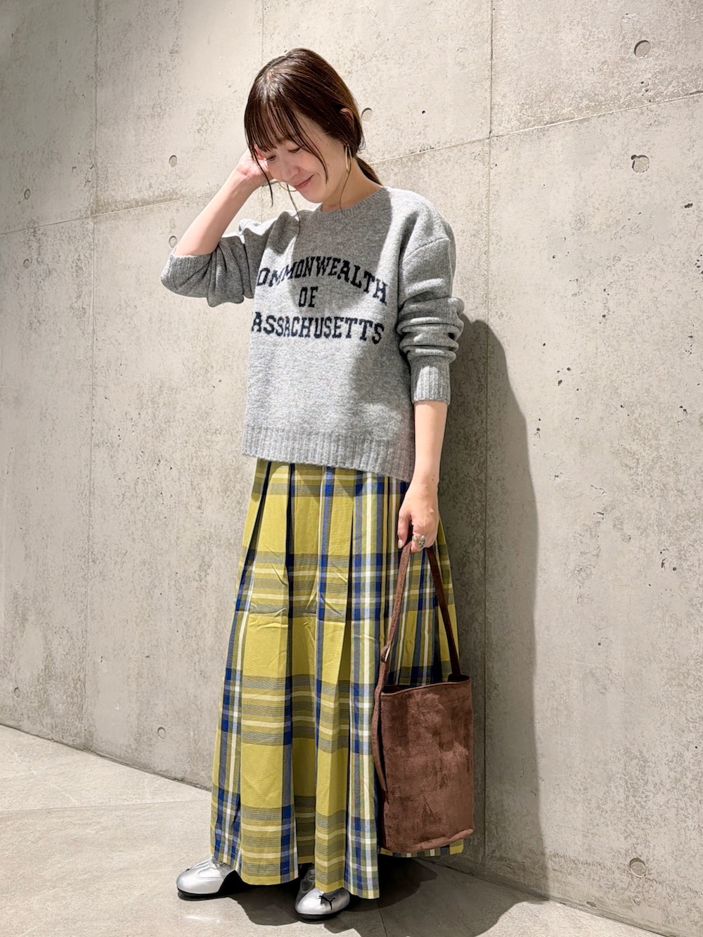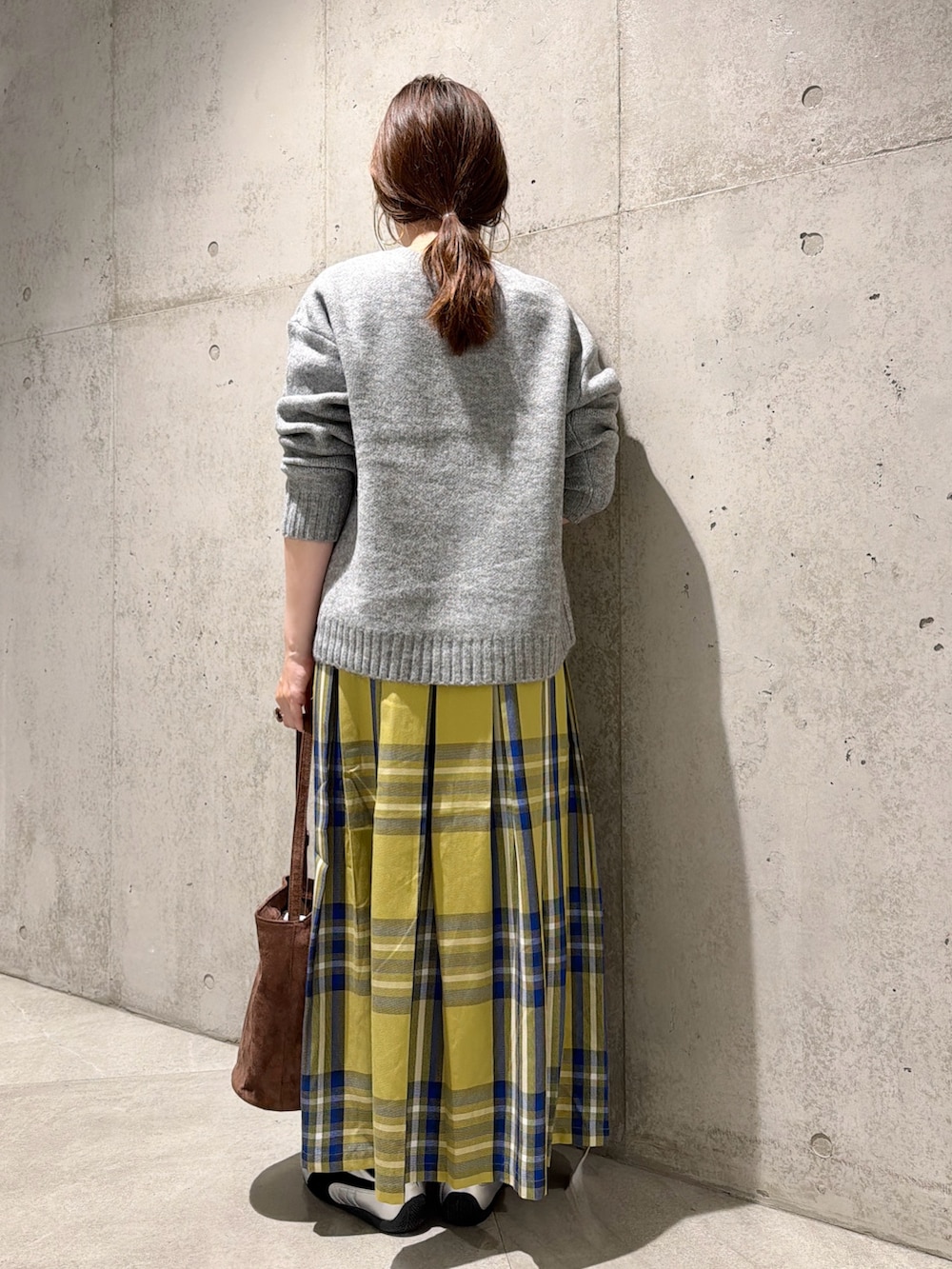 今回は、明るめなチェック柄のプリーツスカートを合わせた、大人カジュアルコーディネート。