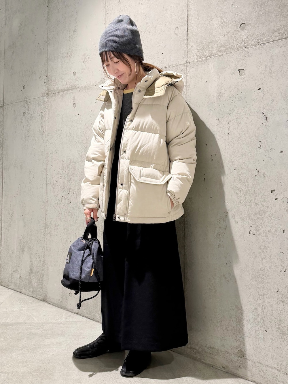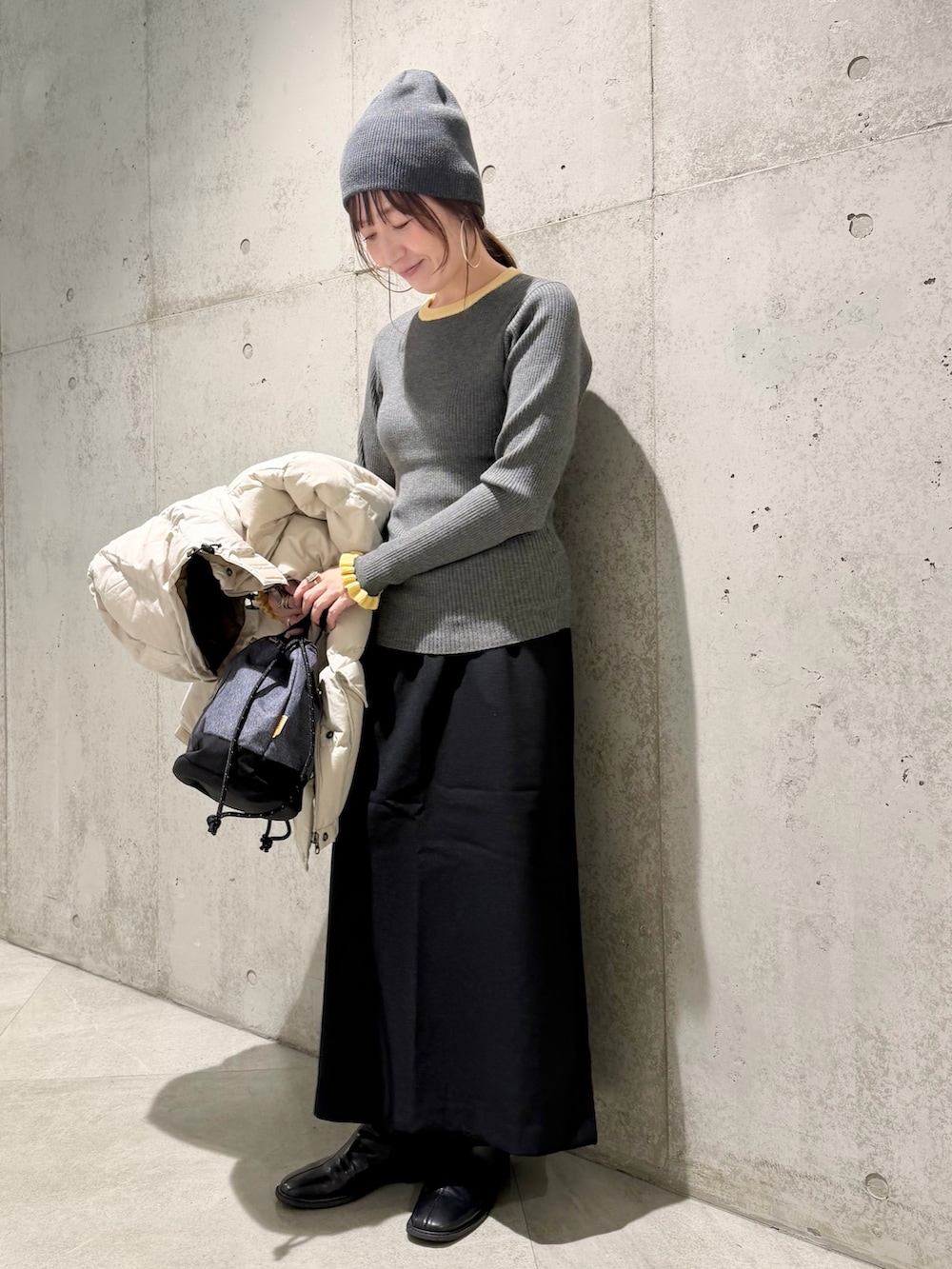 今回は、インナーのバイカラーをアクセントに、シンプルなスカートと合わせた、カジュアルコーディネート。