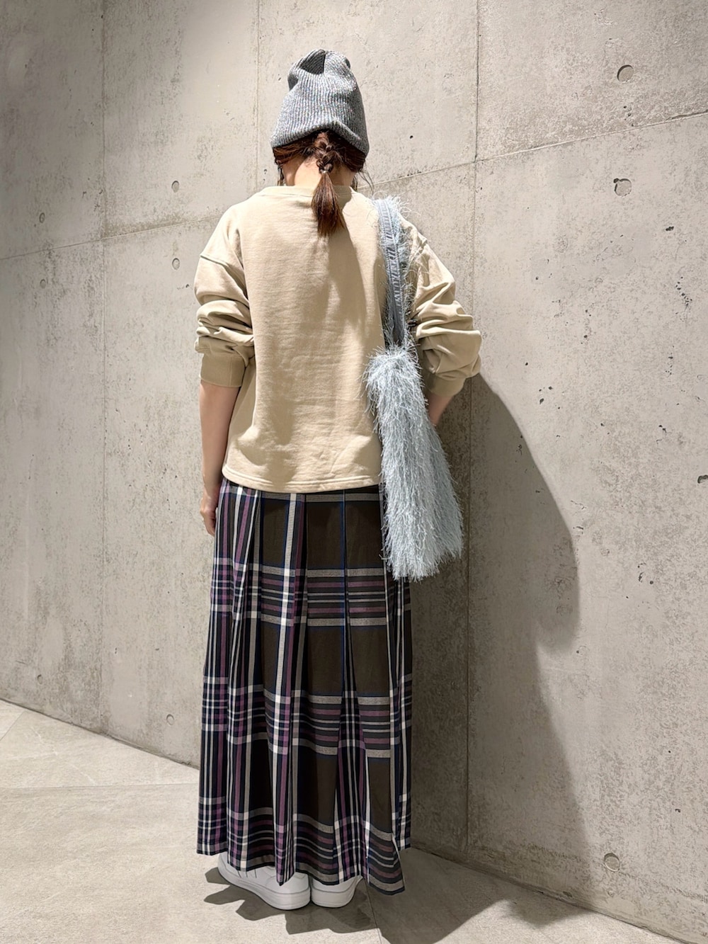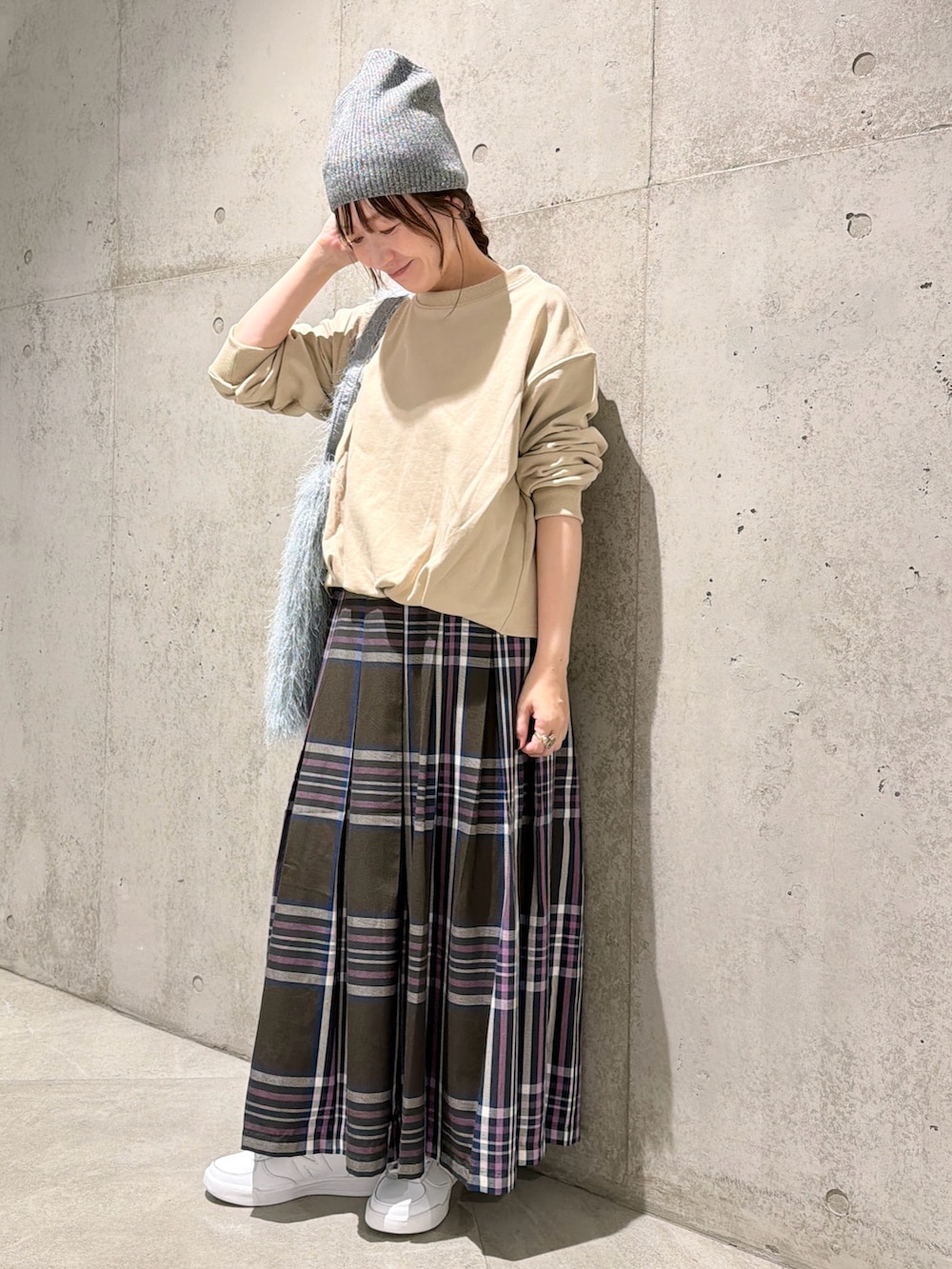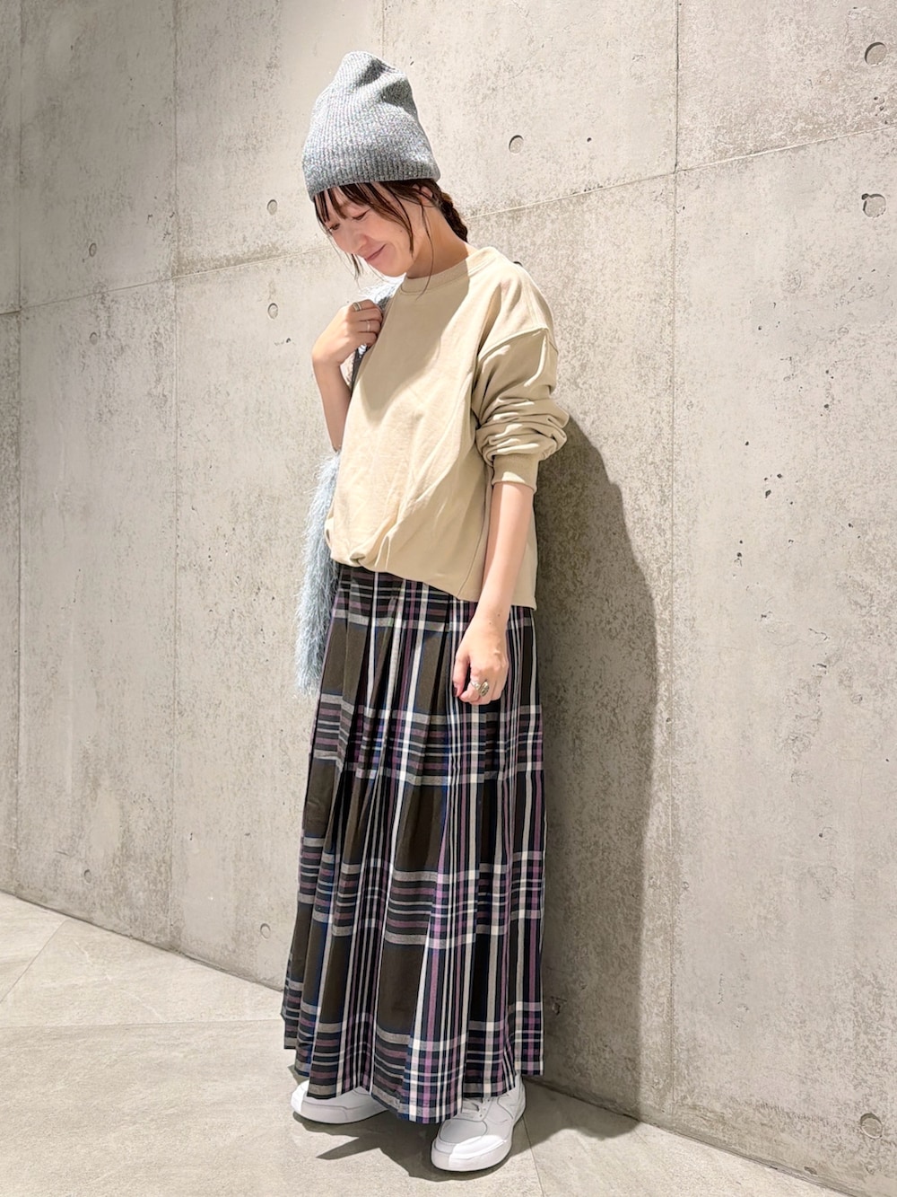 今回は、チェック柄ロングスカートを合わせた、大人カジュアルコーディネート。