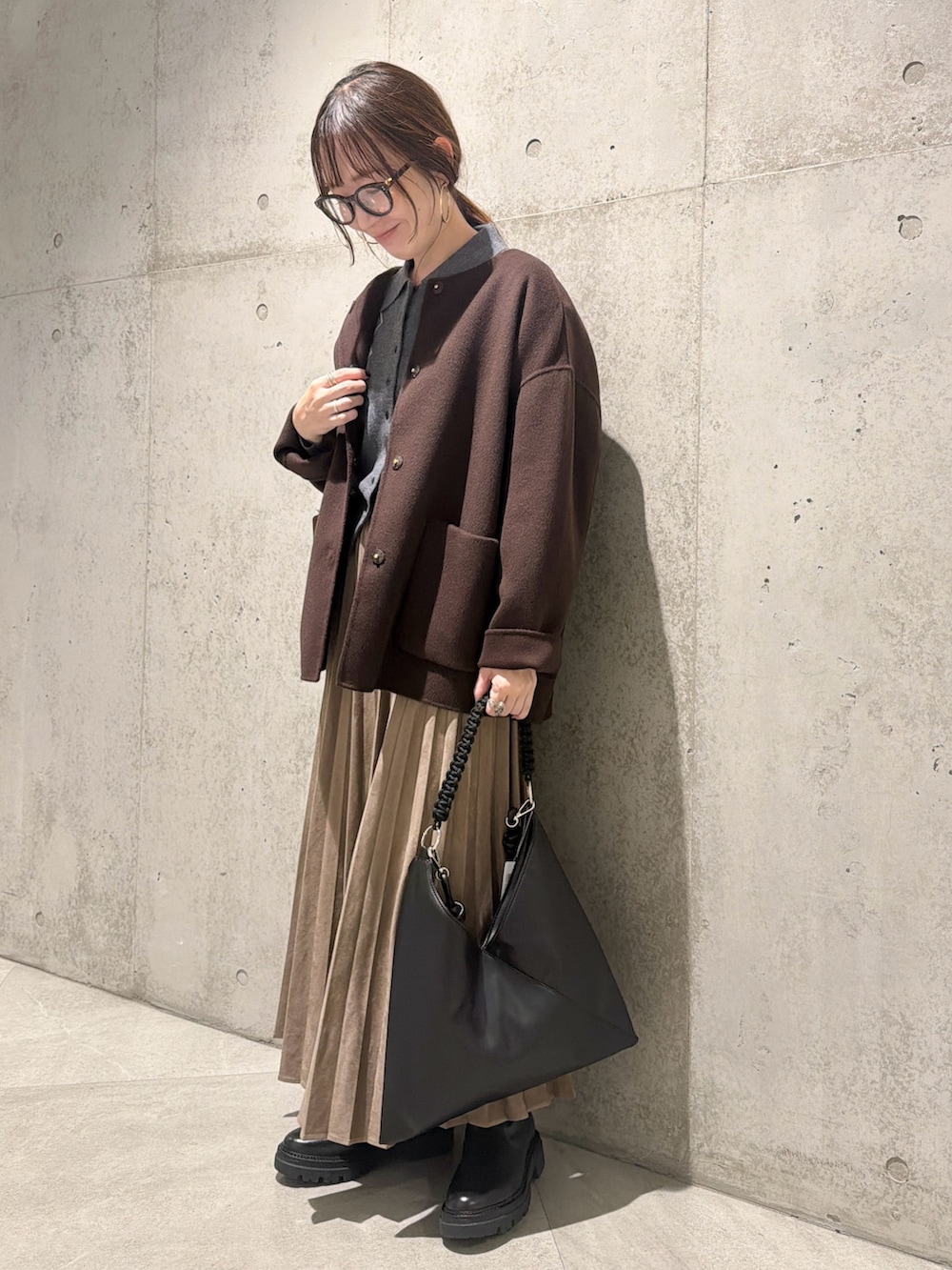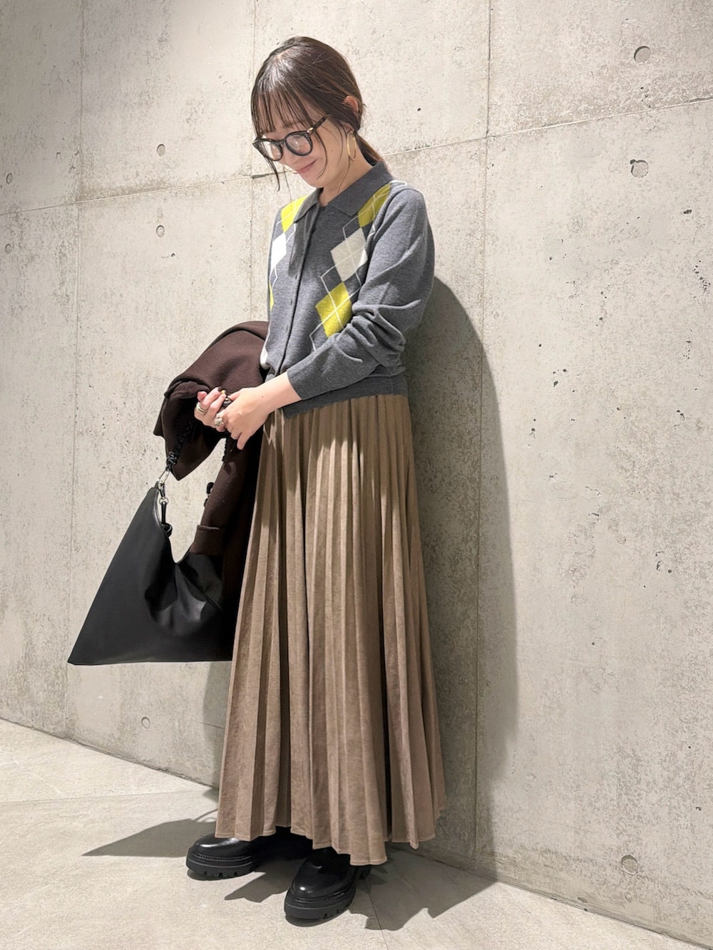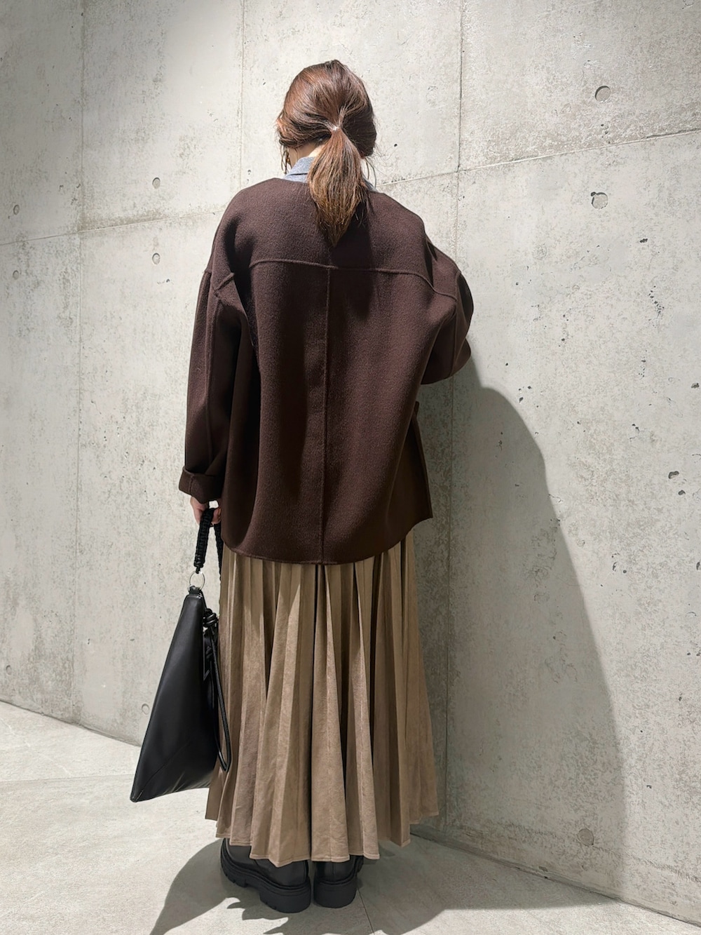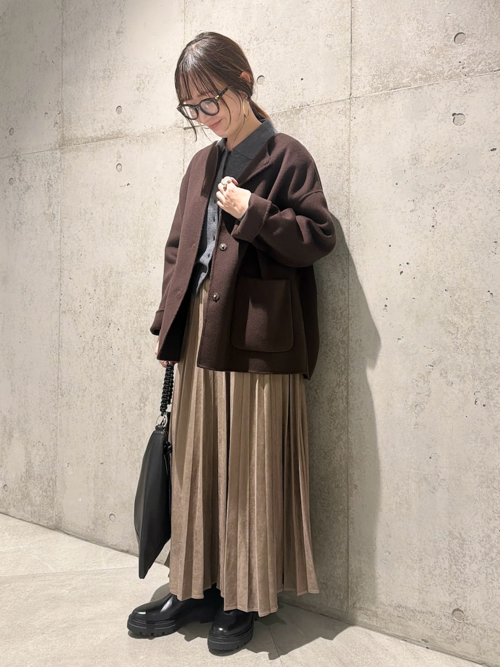 今回は、プリーツスカートを合わせたキレイめコーディネートです。