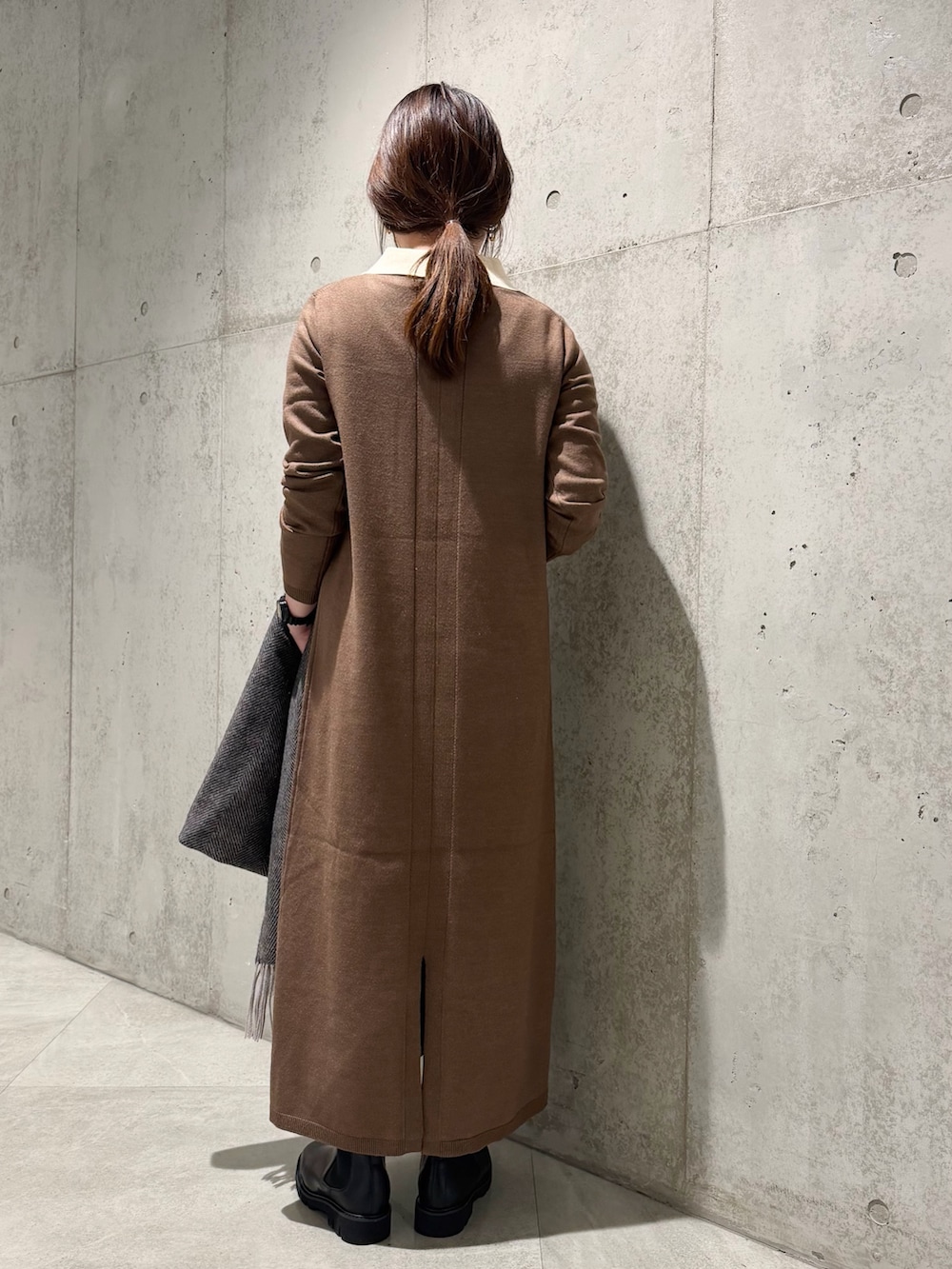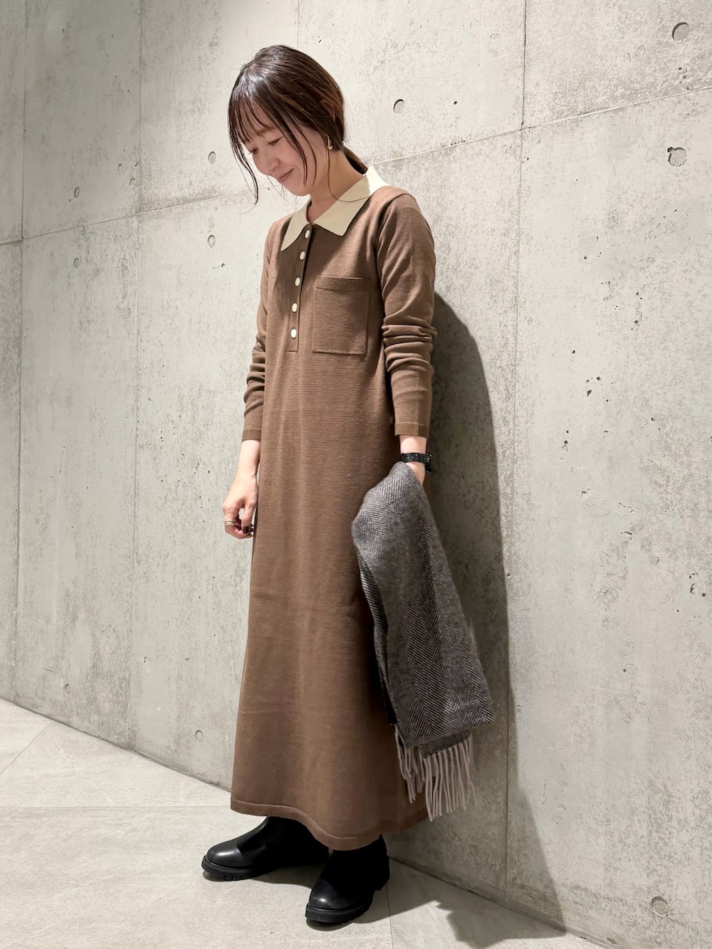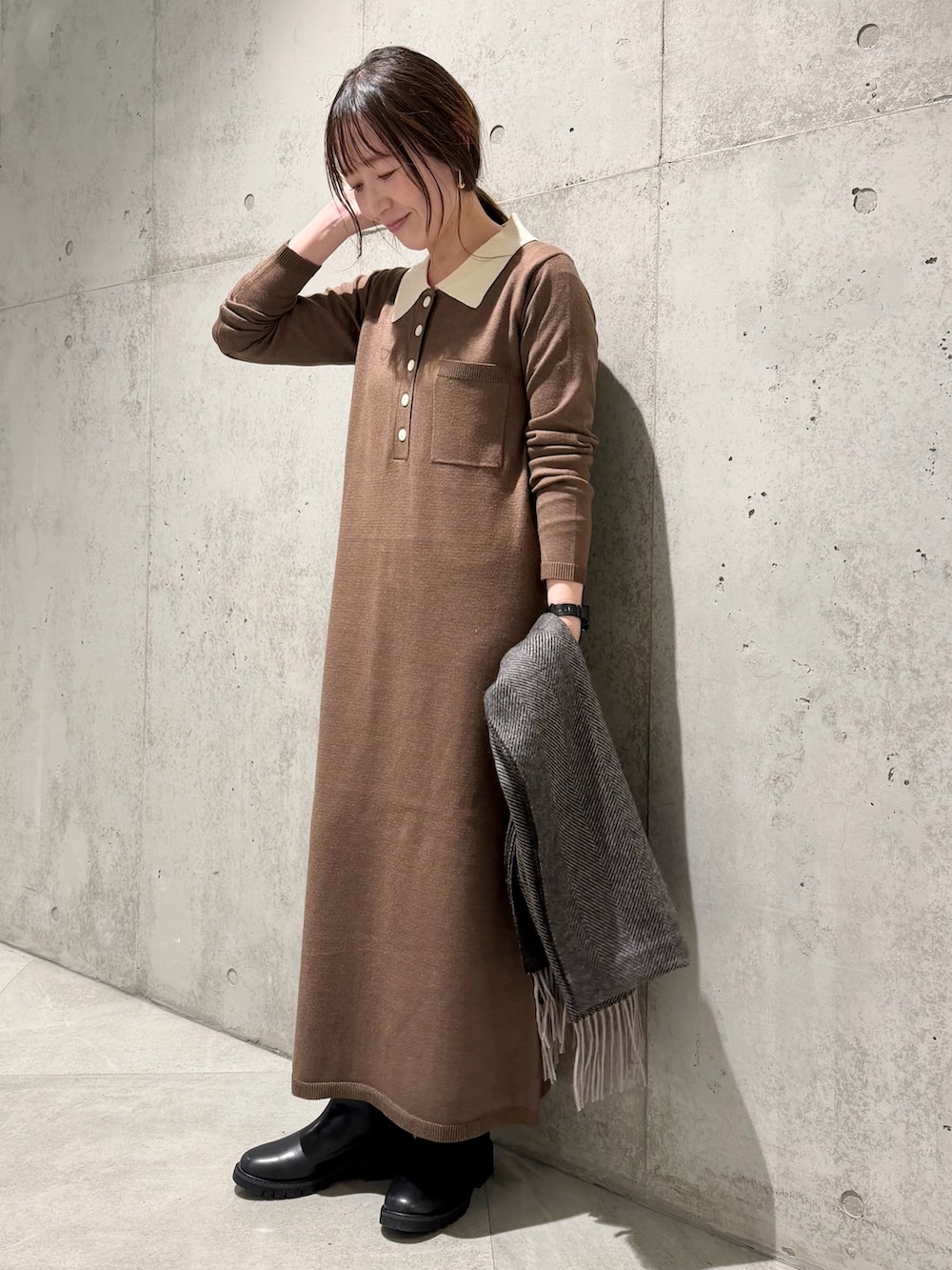 シンプルながら、女性らしい印象のニットポロワンピース。