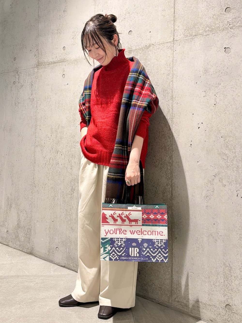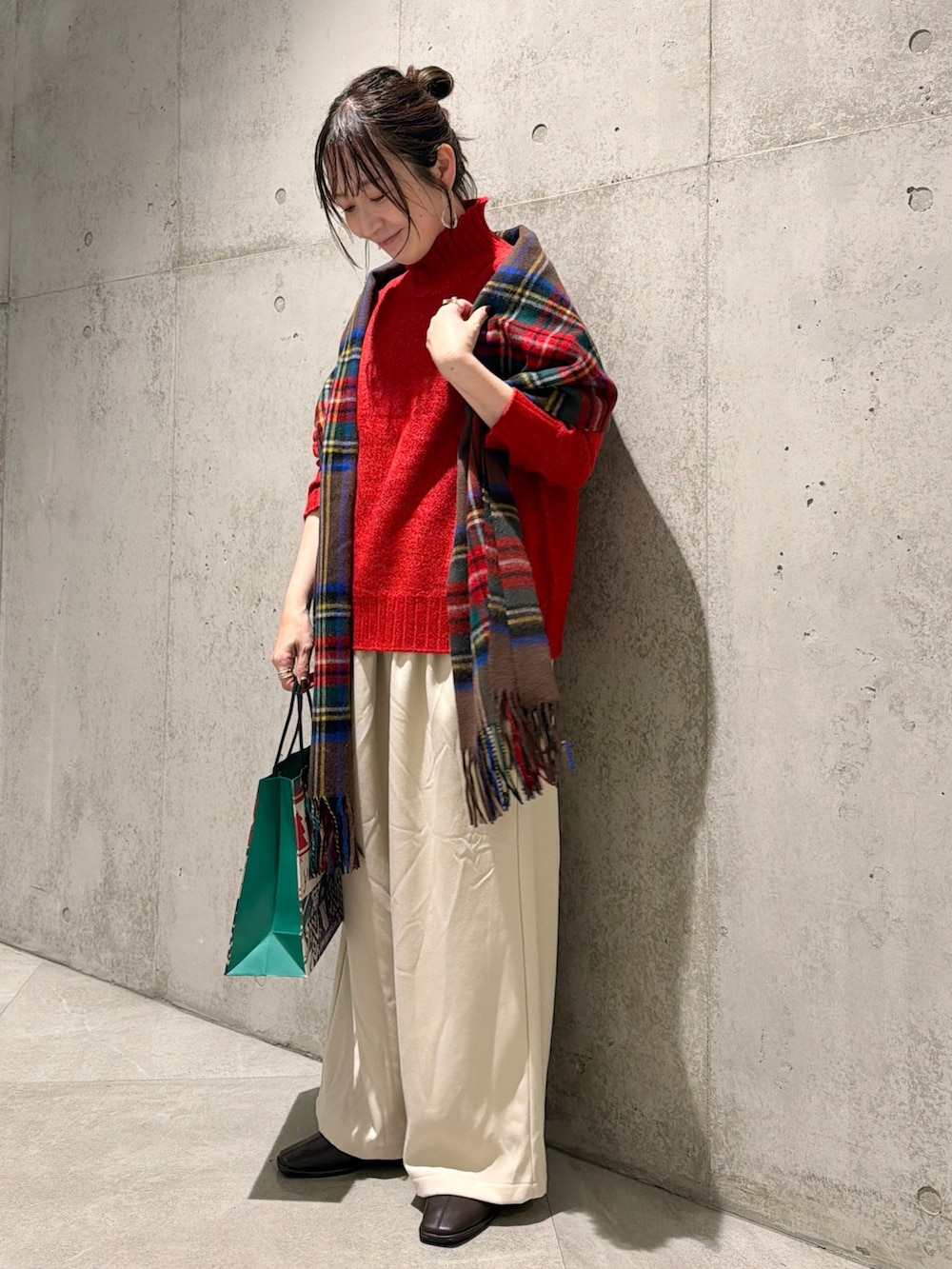 冬らしいチェック柄のストールをアクセントに。