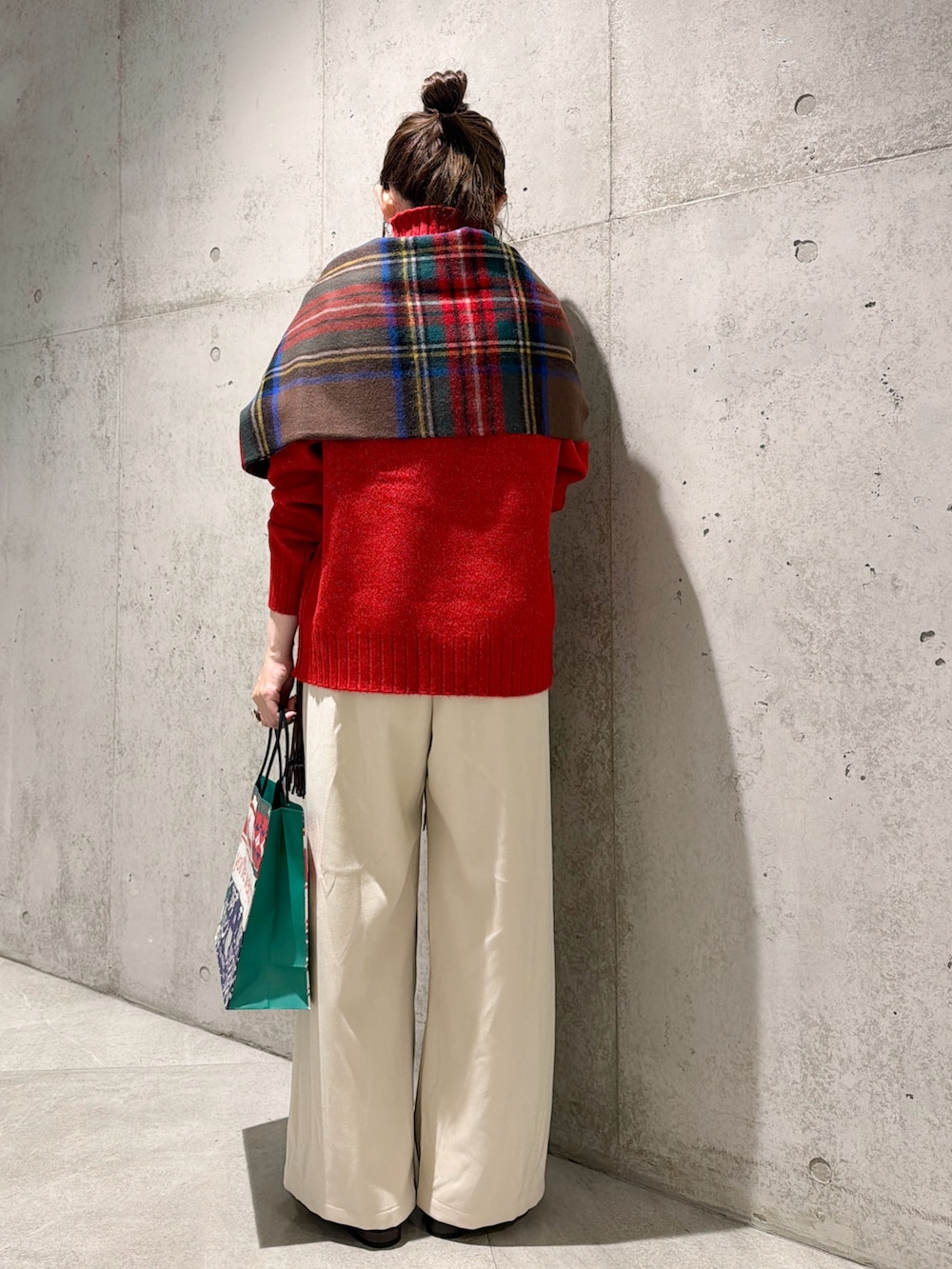 今回は、赤に、ホワイトカラーのパンツを合わせて、ホリデー感のあるスタイリングにしてみました。