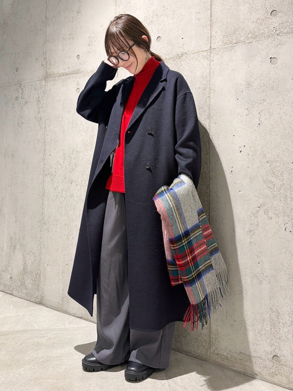 チェック柄のストールで、ホリデー感のあるスタイルに。
